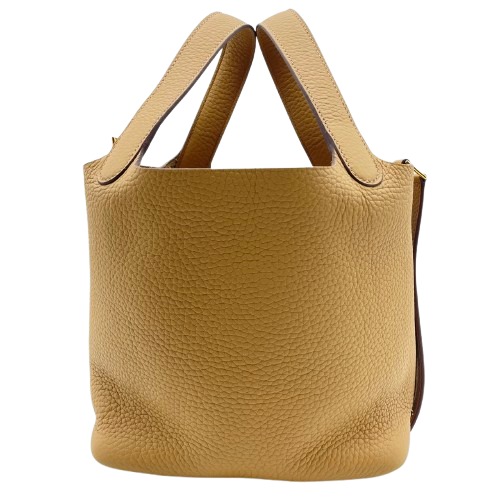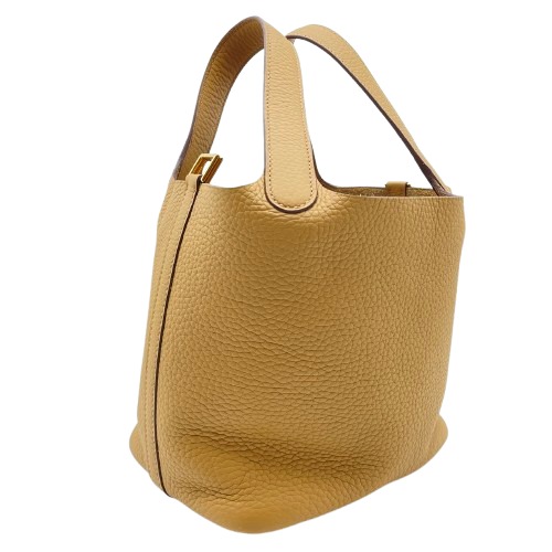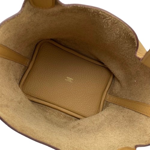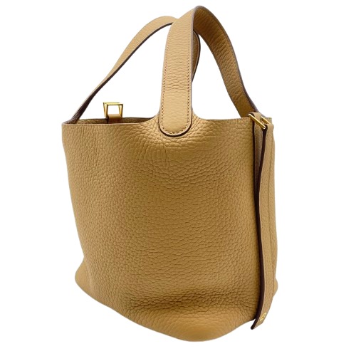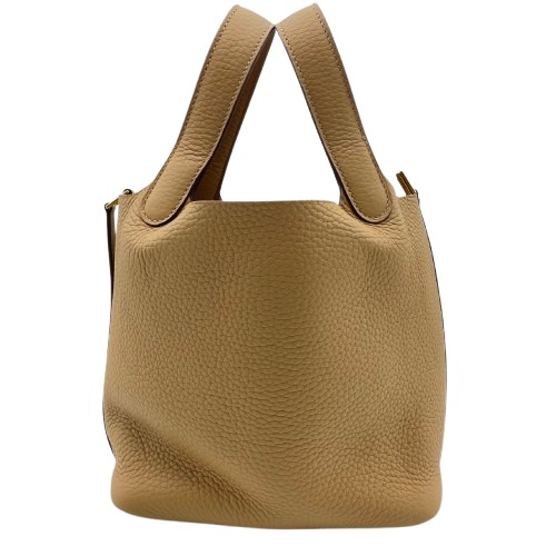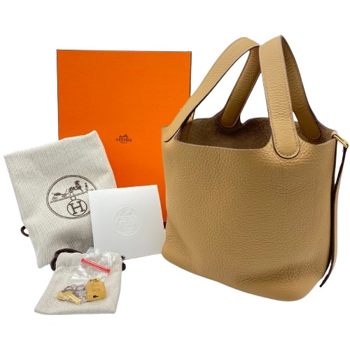 エルメスのピコタンロックは、シンプルながらも洗練されたデザインが特徴のバッグです。トリヨンクレマンス素材の柔らかさと耐久性は日常使いに最適で、ビスキュイの色味が落ち着いた上品さを演出します。18サイズはデイリーユースにちょうど良い容量を持ち、装いにエレガントなタッチを加えます。使い勝手の良い開閉スタイルで、中身へのアクセスもスムーズ。エルメスならではのフィネスを兼ね備えた一品をぜひこの機会にお手元に。