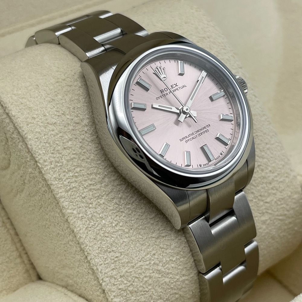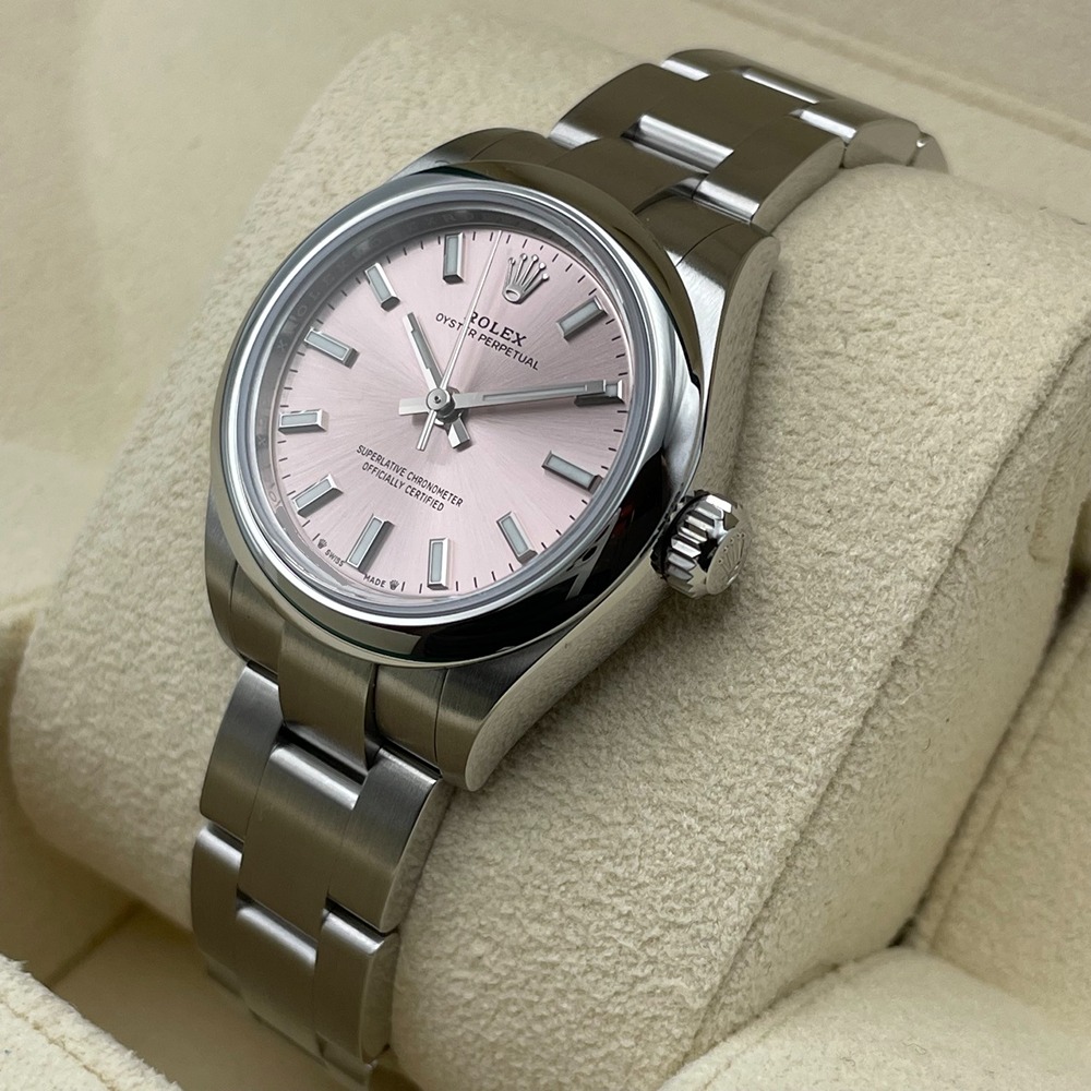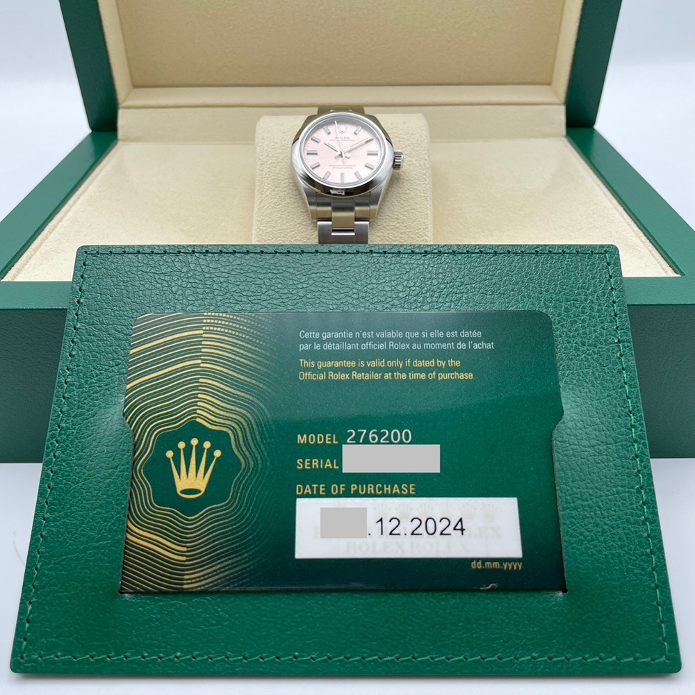 ロレックス オイスターパーペチュアルの276200モデルは、調和の取れたデザインと高度な機能性を兼ね備えた逸品です。ステンレススチールボディは耐久性に優れ、輝くような美しい光沢を放ちます。28mmのケースに鮮やかなピンクカラーがスタイリッシュに映え、洗練された印象を与えます。日常の様々なシーンで活躍し、着用するだけで特別な気分にさせてくれます。シンプルかつエレガントなデザインは、幅広いファッションにマッチし、長く愛用いただけます。