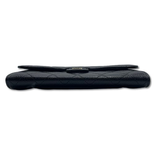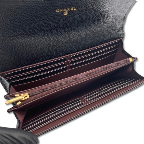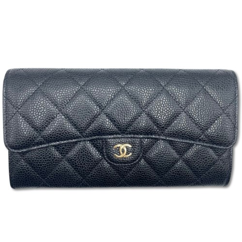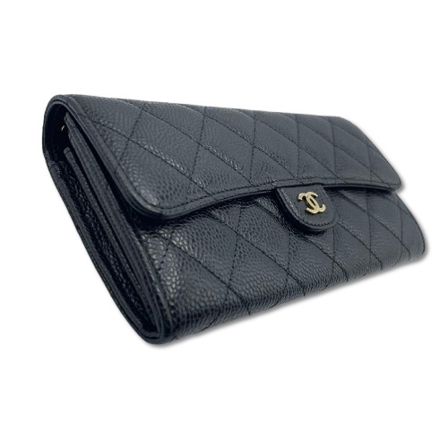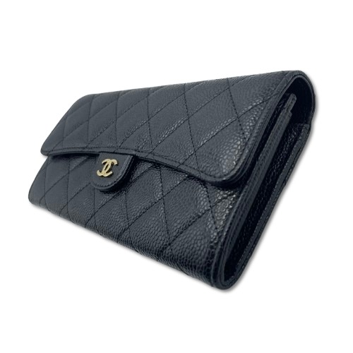 シャネル「クラッシック ロングフラップ ウォレット」は、洗練されたシンプルさと機能性を兼ね備えた逸品です。キャビアスキンの質感が高級感を引き立て、どんなシーンにも映えるブラック×ゴールドのカラーが魅力的です。ヴェルメイユゴールドのロゴプレートがアクセントになり、日常の使用が喜びとなるデザイン。シャネルならではのタイムレスなエレガンスが息づく一品を手に入れてみませんか。