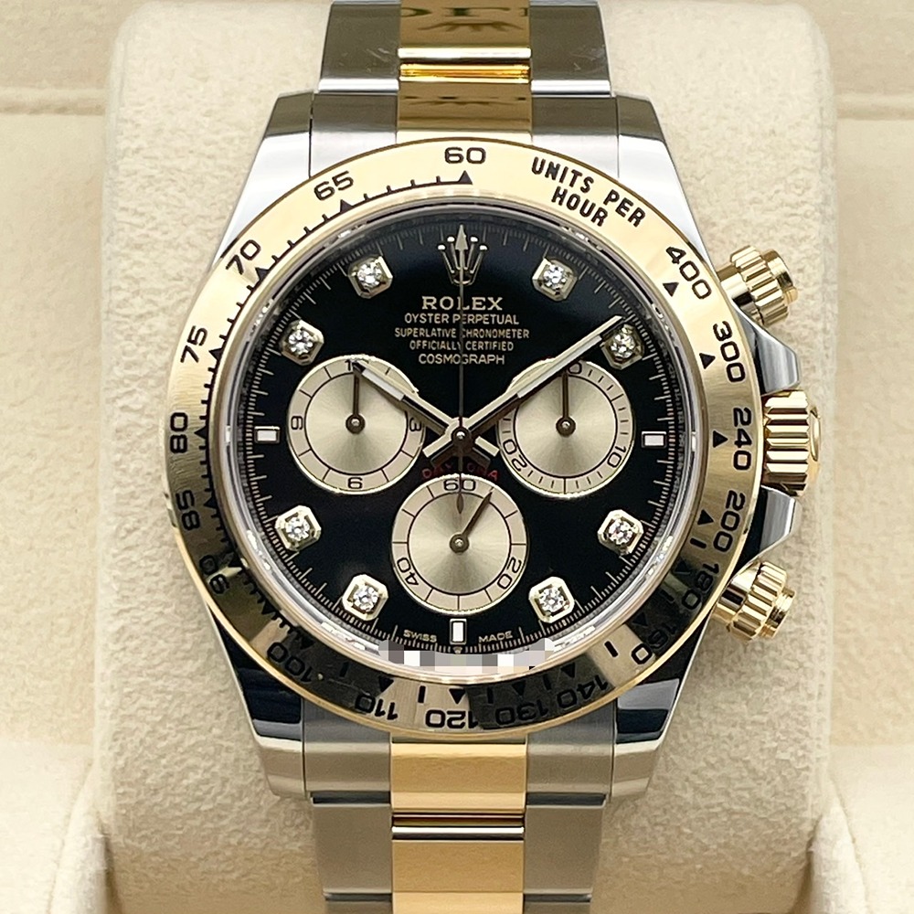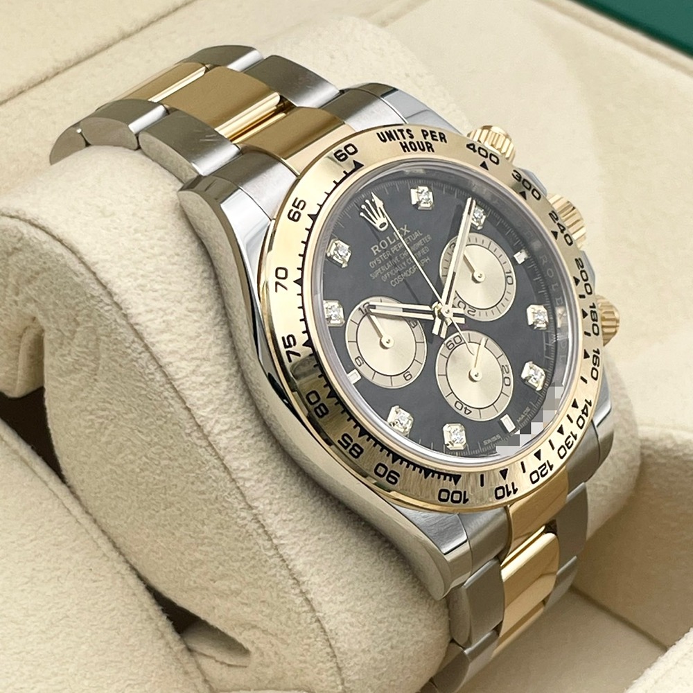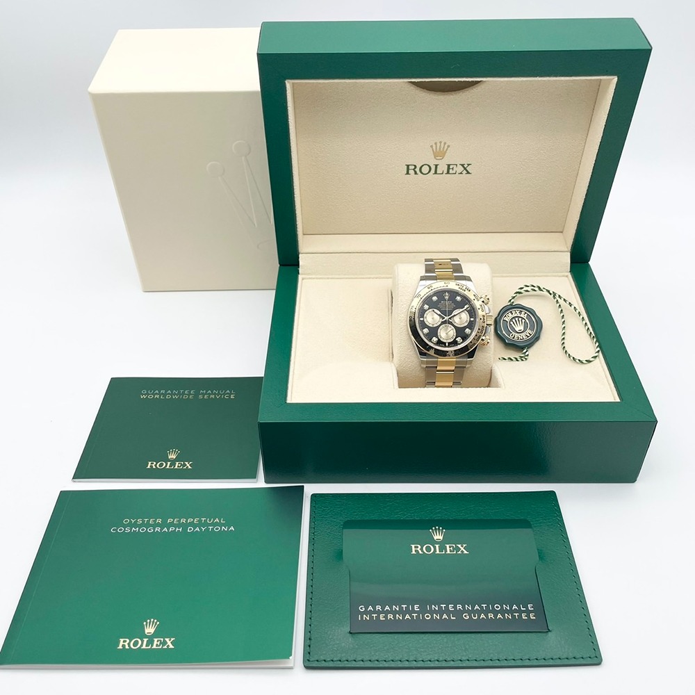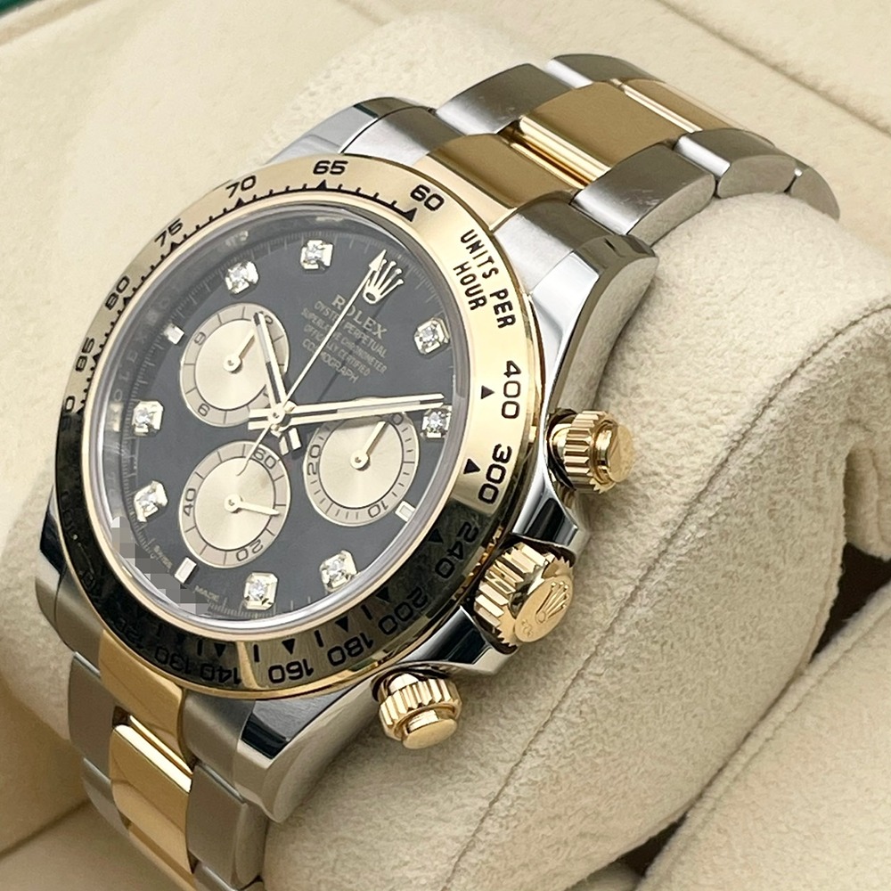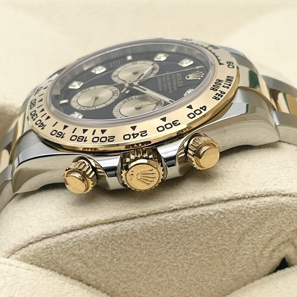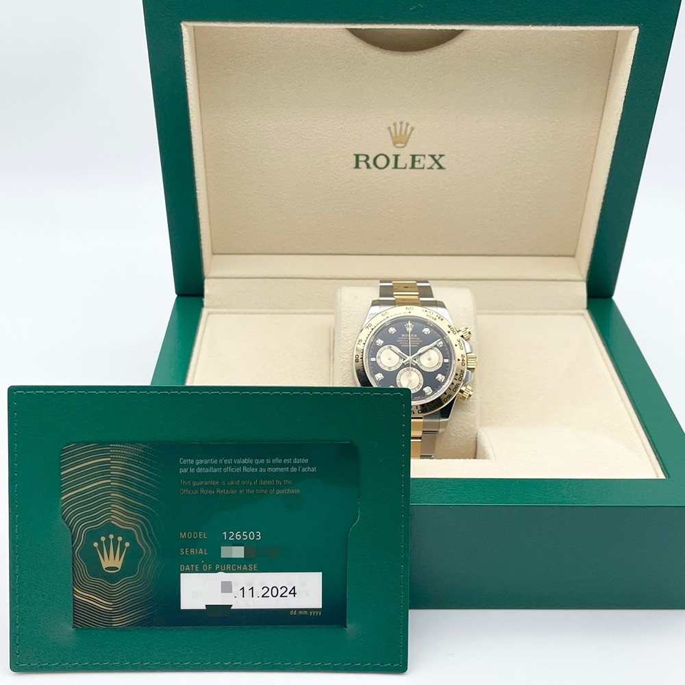 ロレックスのデイトナは、洗練されたデザインと卓越した技術が融合したモデルとして、長年にわたり愛されています。126503は、ステンレススチールとイエローゴールドのコンビネーションが特徴で、エレガンスとスポーティさを完璧に兼ね備えています。ブラックの文字盤は視認性が高く、どのようなシーンにもマッチします。40mmのケースサイズは存在感がありながらも、無理なく手首にフィットし、快適な装着感を提供します。高級感あふれる仕上がりで、特別な日の装いを華やかに引き立てます。