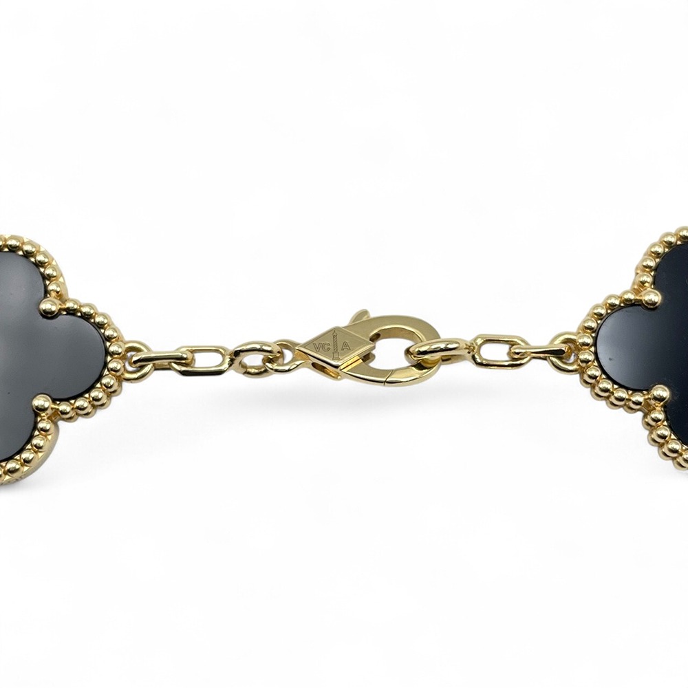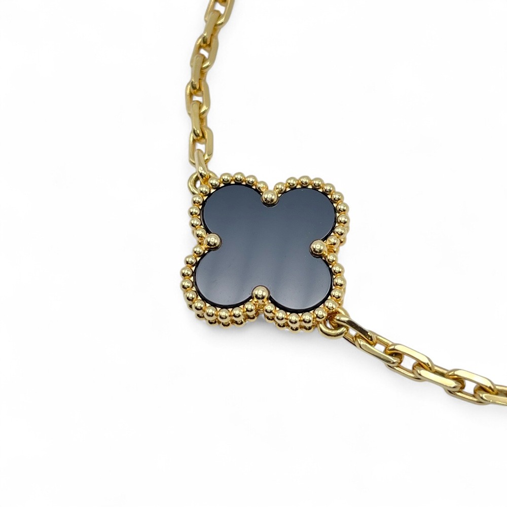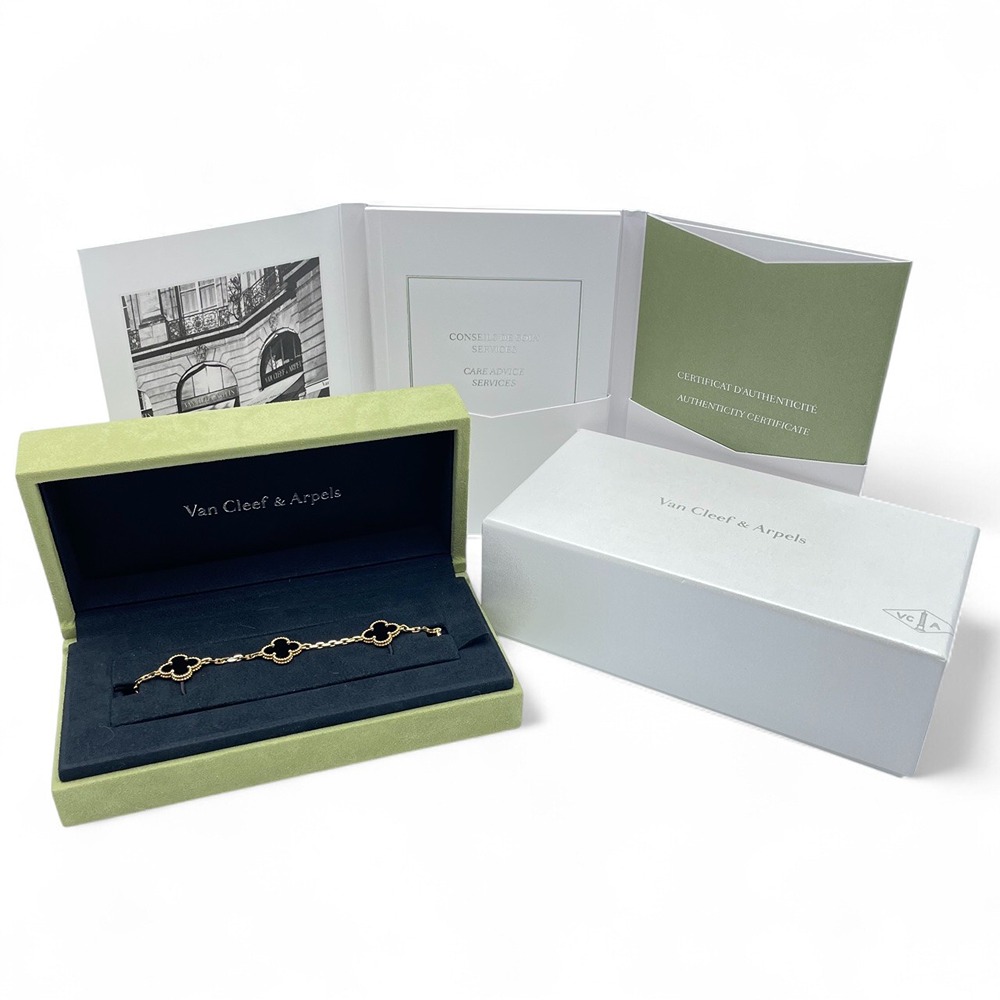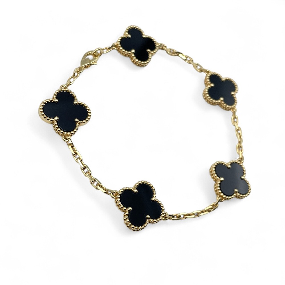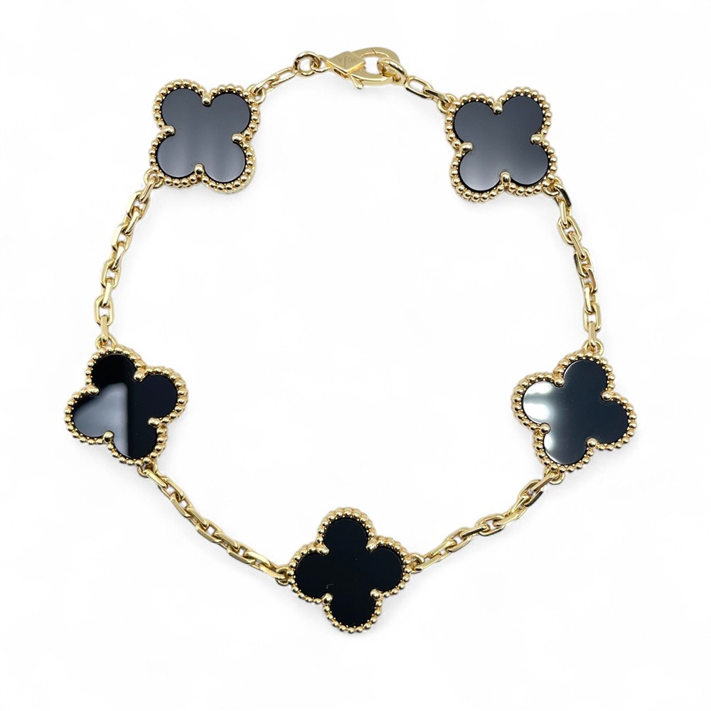 ヴァンクリーフ・アーペルのヴィンテージ アルハンブラ ブレスレットは、絶妙なデザインと職人技が融合した逸品です。オニキスの深い黒が、イエローゴールドと美しく調和し、手首を上品に彩ります。クラシックでありながら現代的な魅力を放つこのジュエリーは、どんな装いにも華やかさを添え、特別なシーンをより一層引き立てます。日々の装いに取り入れることで、エレガントで品格のあるスタイルを演出することができるでしょう。
