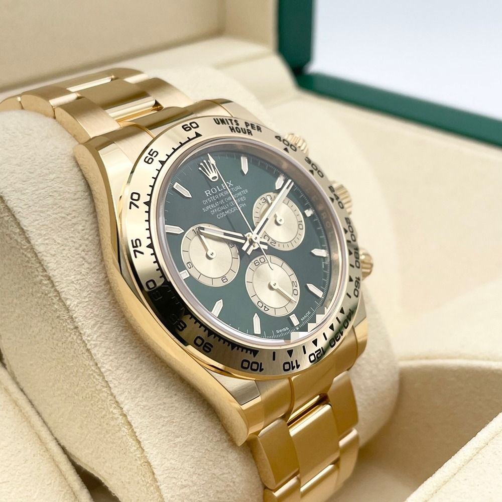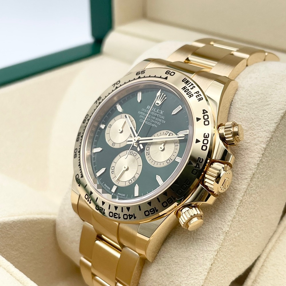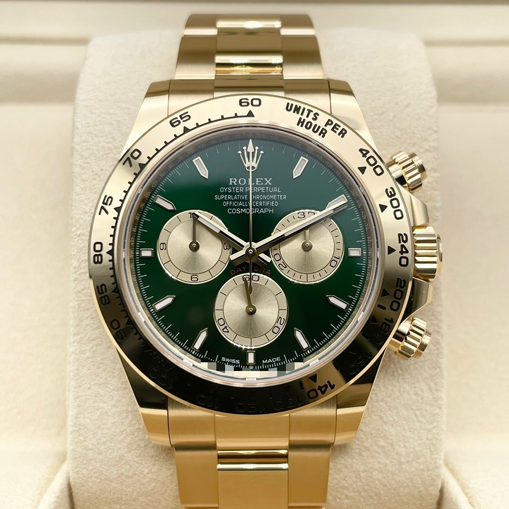 ロレックス デイトナ 126508は、時計愛好者の間で高い人気を誇るモデルです。イエローゴールドの素材が放つ贅沢な輝きが、デイトナを身に着ける喜びを一層高めます。グリーンカラーの文字盤は、他では見られない独特な魅力を放ち、スタイリッシュでエレガントな印象を演出します。40mmという絶妙なサイズは、ボリューム感を感じさせつつも快適な装着感を保証します。このデイトナで、あなたの腕元に洗練された高級感を加えてみませんか?