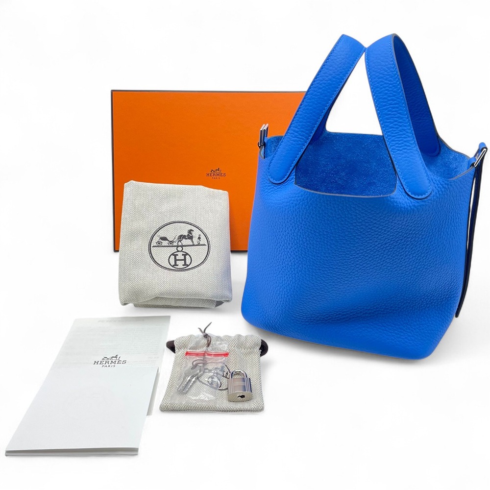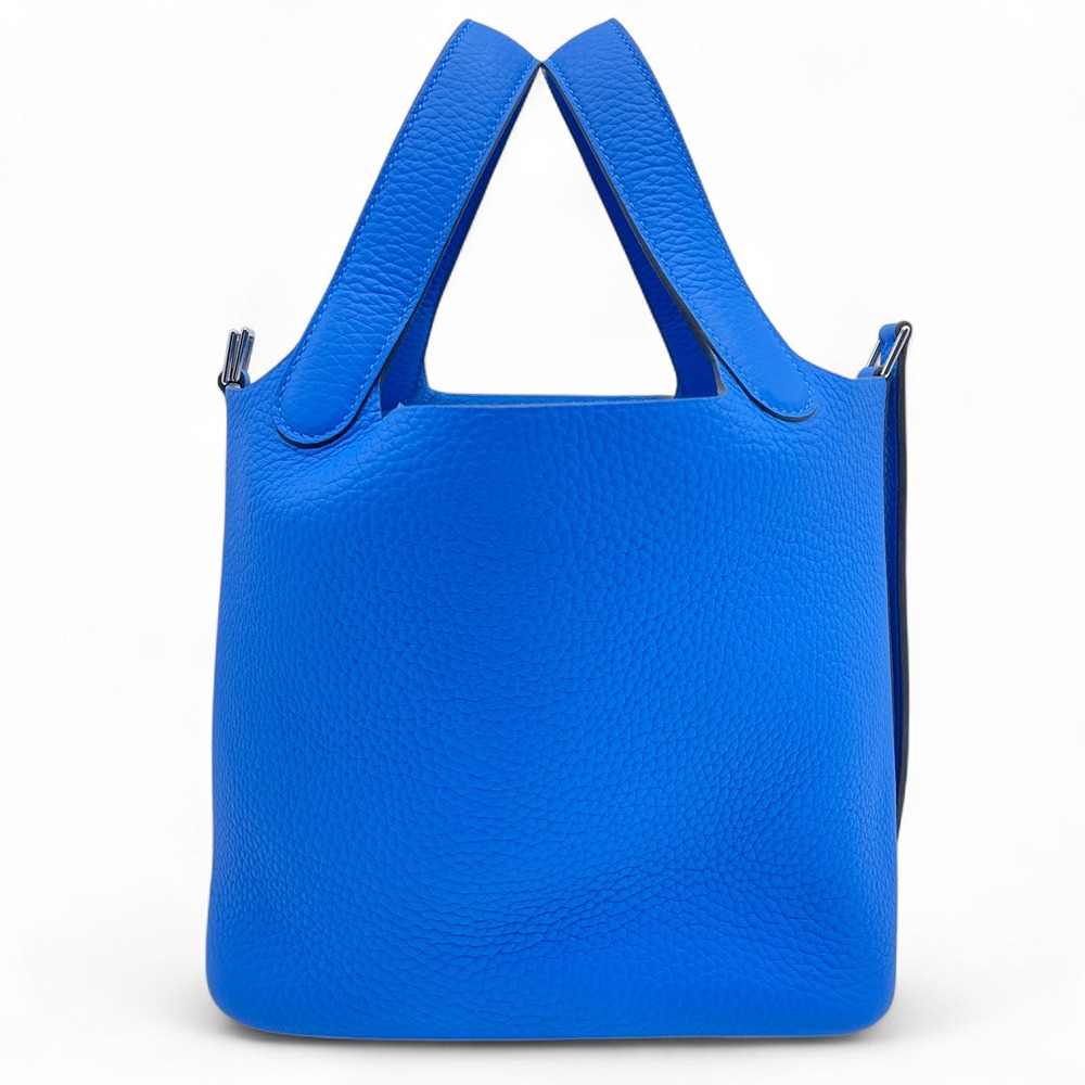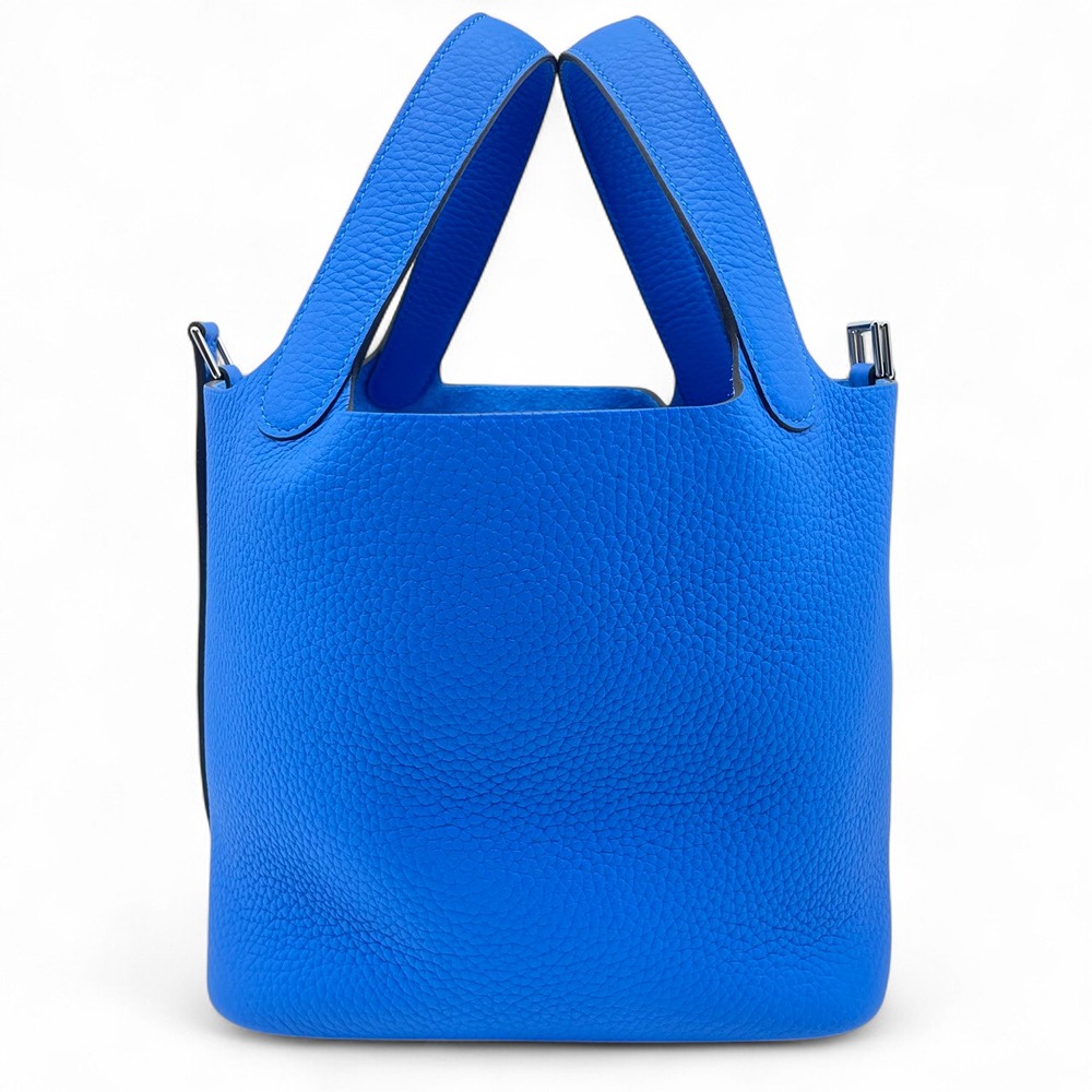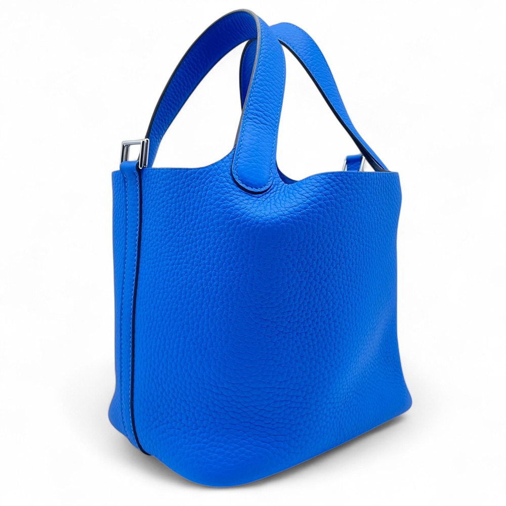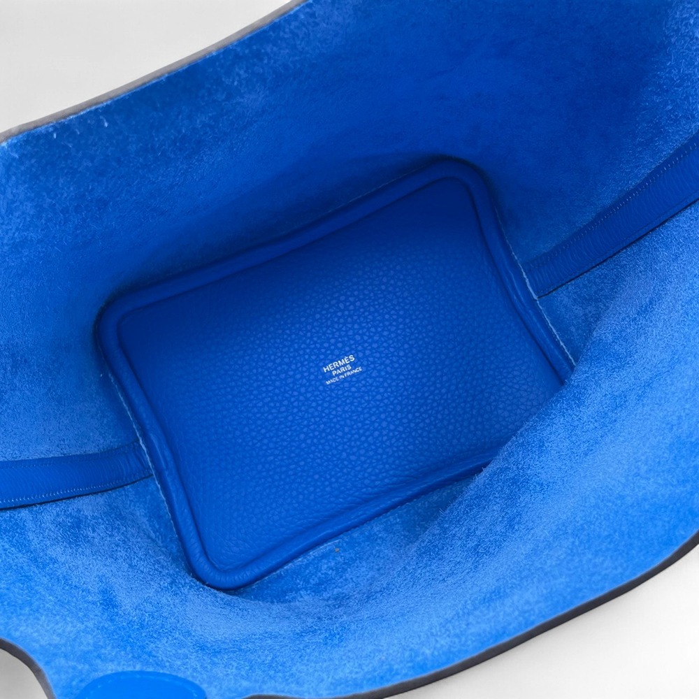 エルメスの「ピコタンロック」バッグは、ブルーイドラのカラーが特徴的なスタイリッシュなアイテムです。トリヨンクレマンス素材を使用しているため、しなやかでありながら堅牢さも兼ね備えています。このブルーイドラの鮮やかさは、日常の装いに際立った彩りを添えること間違いなしです。コンパクトなサイズPMでありながら、デイリーユースに必要なアイテムをしっかり収納可能。気品に満ちたデザインと機能性を両立したこのバッグは、エルメスならではの上質を体感していただける逸品です。