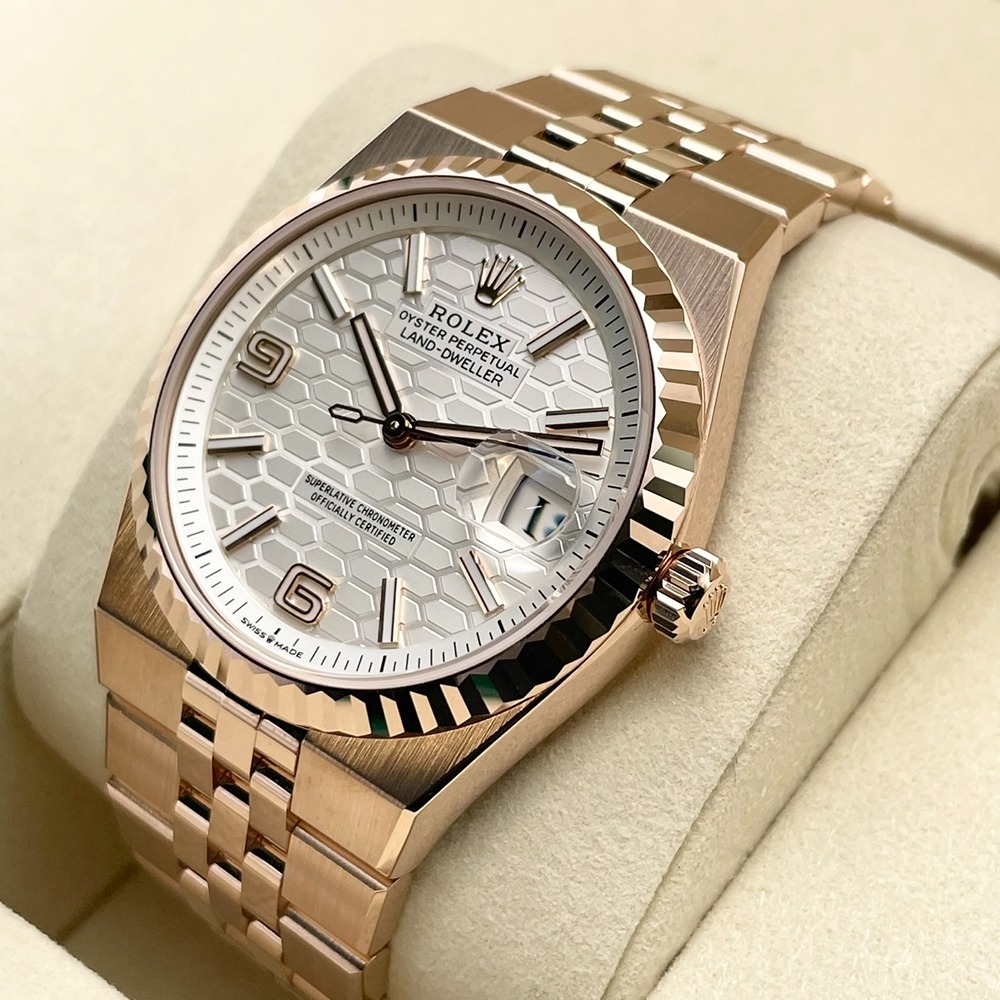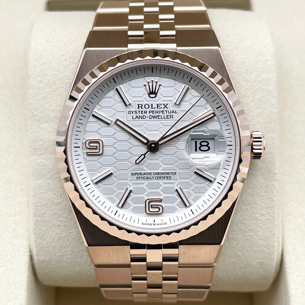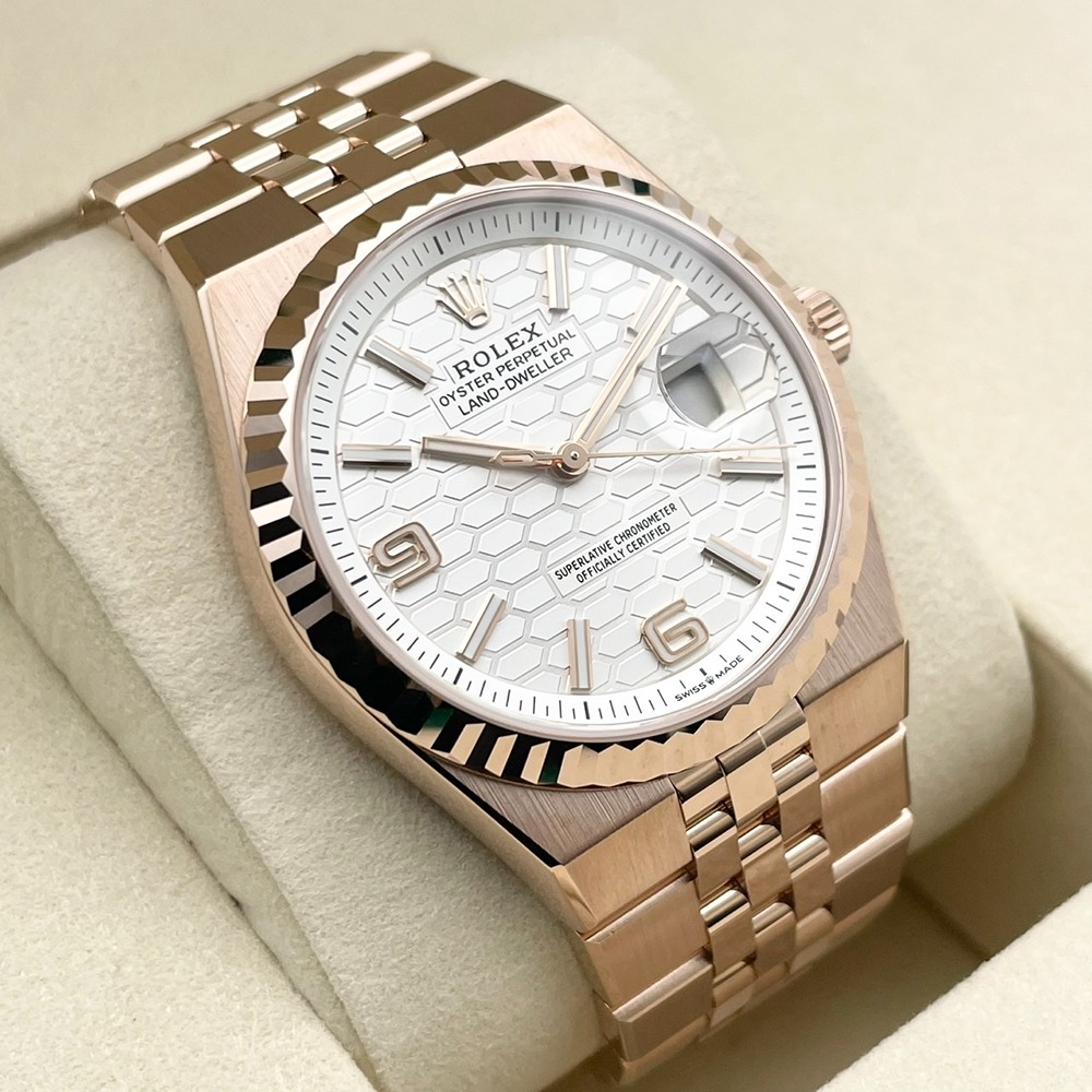 ロレックス ランドドゥエラー 127235は、エレガントなエバーローズゴールドケースと36mmのインテンスホワイト ハニカムダイアルを備えたタイムピースです。