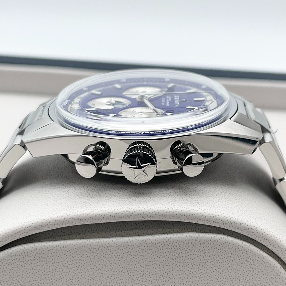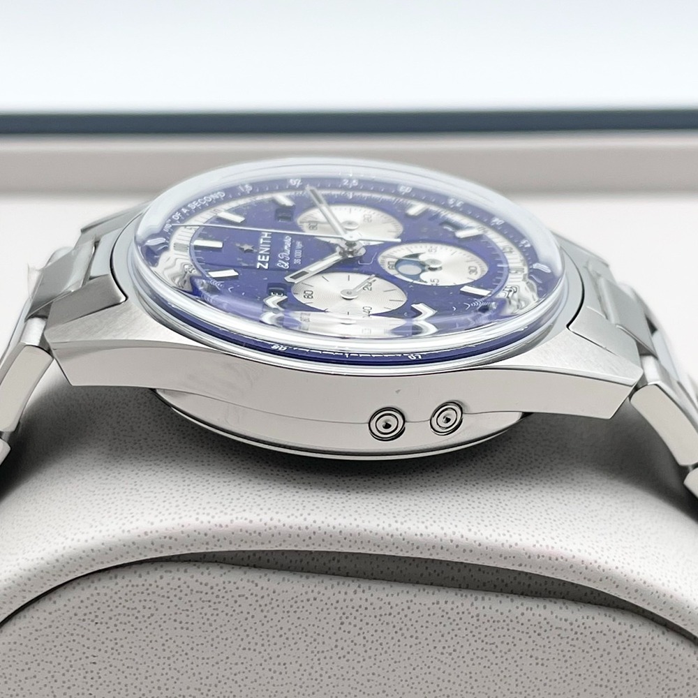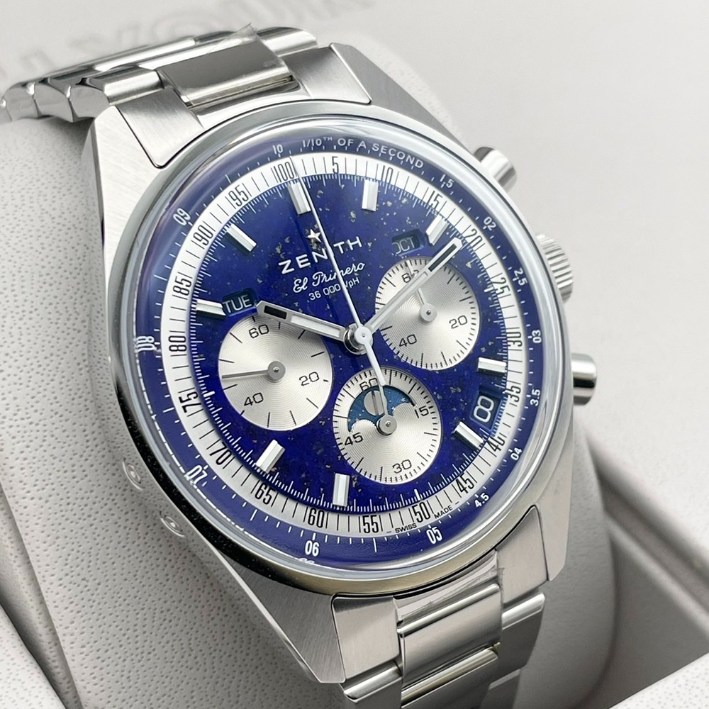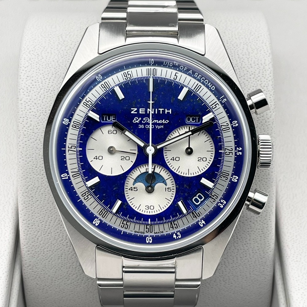 「ゼニス」という名は、夜空に輝く星々からインスピレーションを受け誕生しました。創業者ジョルジュ・ファーブル=ジャコは、満天の星を眺める中で、天空の最も高い地点—天頂(ゼニス)こそ、究極の時計作りへの情熱を象徴すると考えました。ゼニスの象徴的なブルーは、無限の可能性と宇宙の広がりを表現しています。今回ご紹介するのは、ゼニスのアイコンモデルがブルーの魅力をまとった「クロノマスター オリジナル トリプルカレンダー」です。ラピスラズリ文字盤は、深い青に煌めくパイライトの輝きが星空のように美しく、機能性と個性を兼ね備えたタイムピースです。時計の起源は天文学にあると言われます。人類は長い間、天体の動きによって時間を測ろうとしてきました。「クロノマスター オリジナル トリプルカレンダー」は、時・日付・曜日・月・ムーンフェイズを完璧な調和のもとに表示し、宇宙のリズムを手首に宿します。ラピスラズリ文字盤は自然が生み出す唯一無二の模様で、1本ごとに異なる美しさを持っています。さらに、1/10秒計測のクロノグラフ機能を備えた自動巻きムーブメント「エル・プリメロ 3610」を搭載。伝統と革新、技術とデザインが融合したこのタイムピースは、個性と存在感を求める方のために作られました。