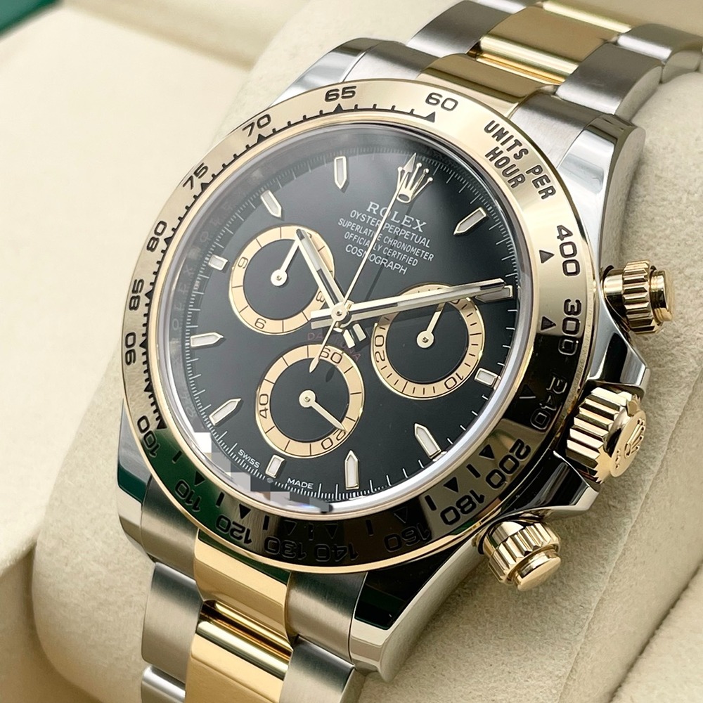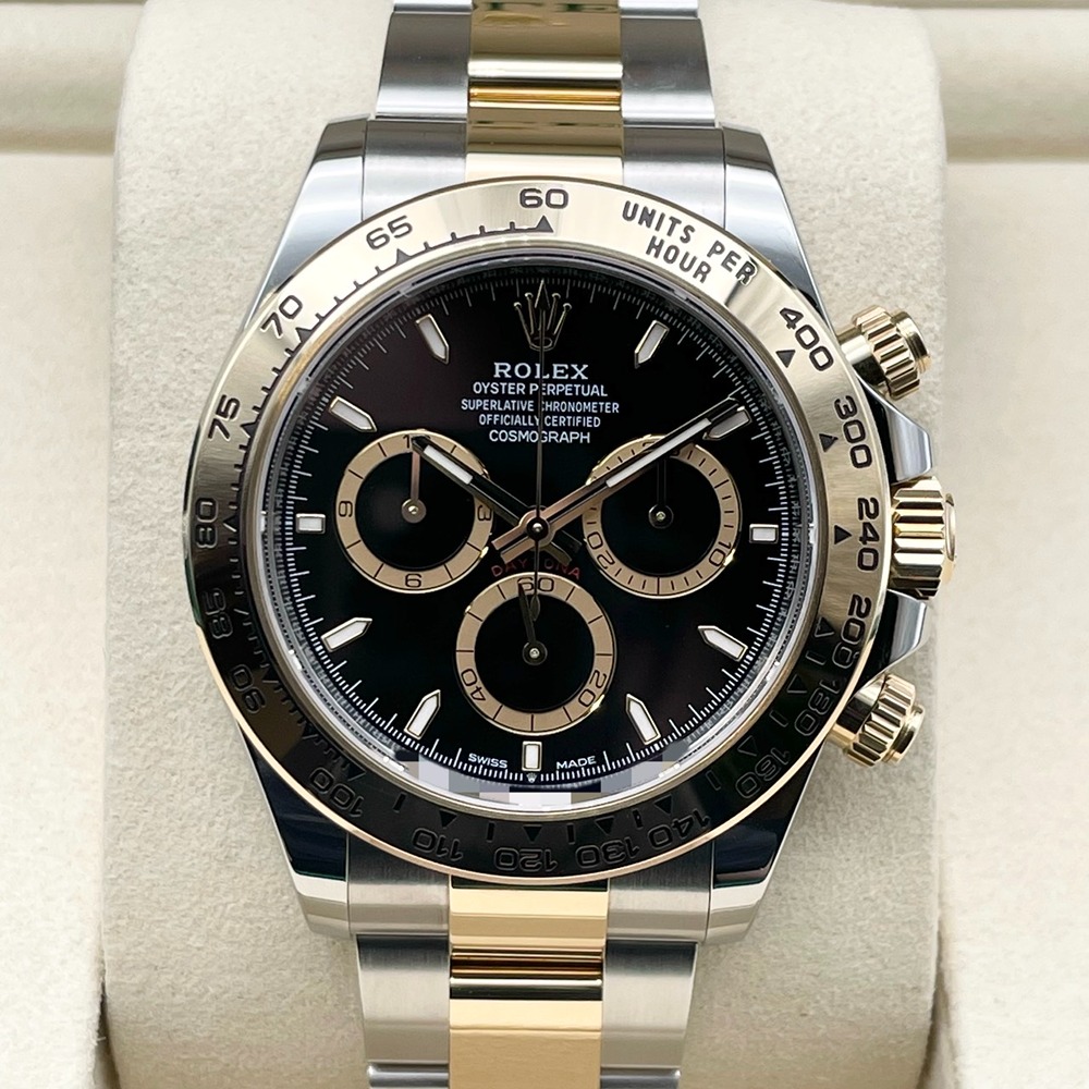 ロレックス デイトナ 126503は、エレガントなブラックとゴールドのカラーコンビネーションによる洗練されたデザインが特徴です。