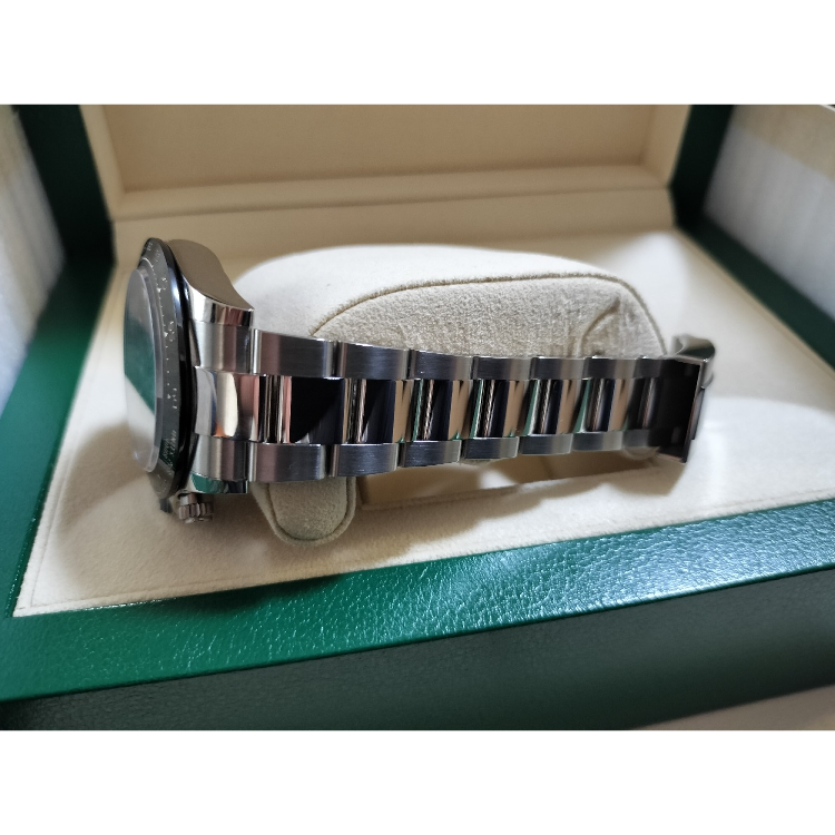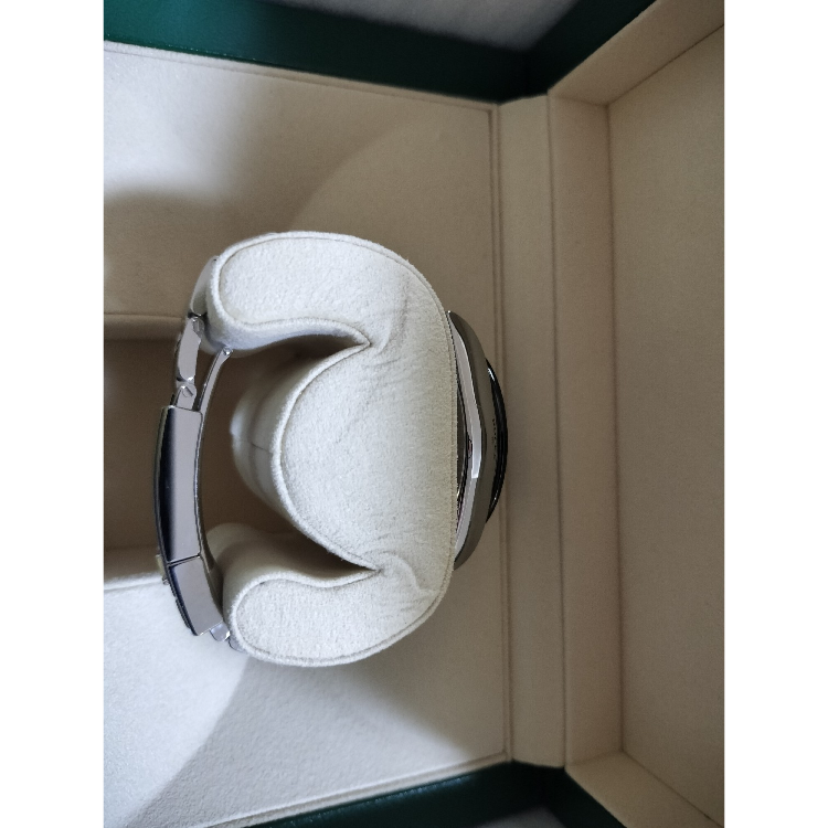 未使用なので非常に綺麗で肉眼で見えるスレや傷はないのですが、1点だけ購入時よりバックルの王冠上のところの鏡面部分に光の加減による薄っすらと線がありましたのでその点のみ画像で確認ください。並行店なら仕上げで簡単に消してしまうレベルのものですが未使用品でですのであえてそのままにしております。時計の精度はチェックしておりまして問題ないのでオーバーホールが必要な状態ではありません。 |