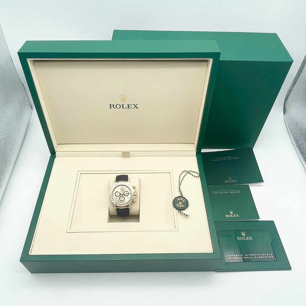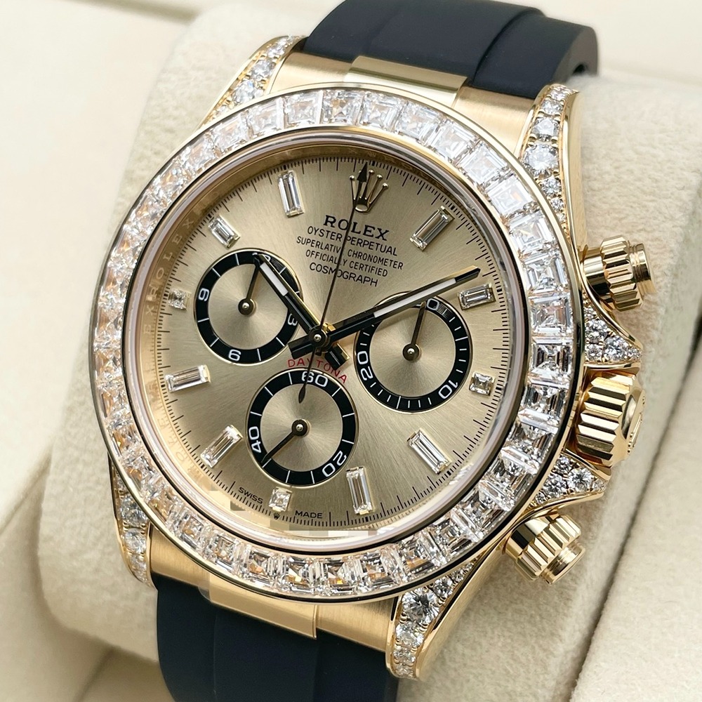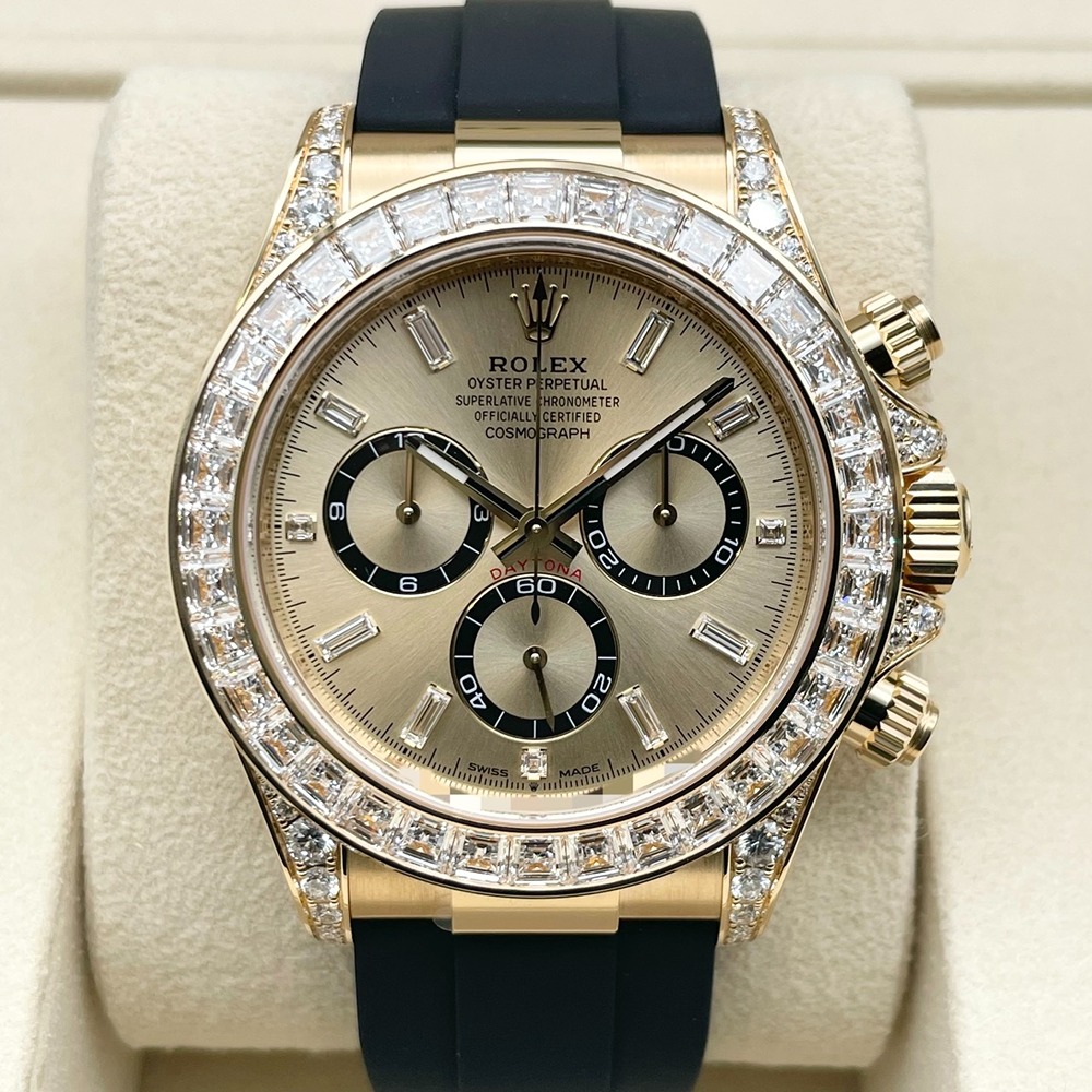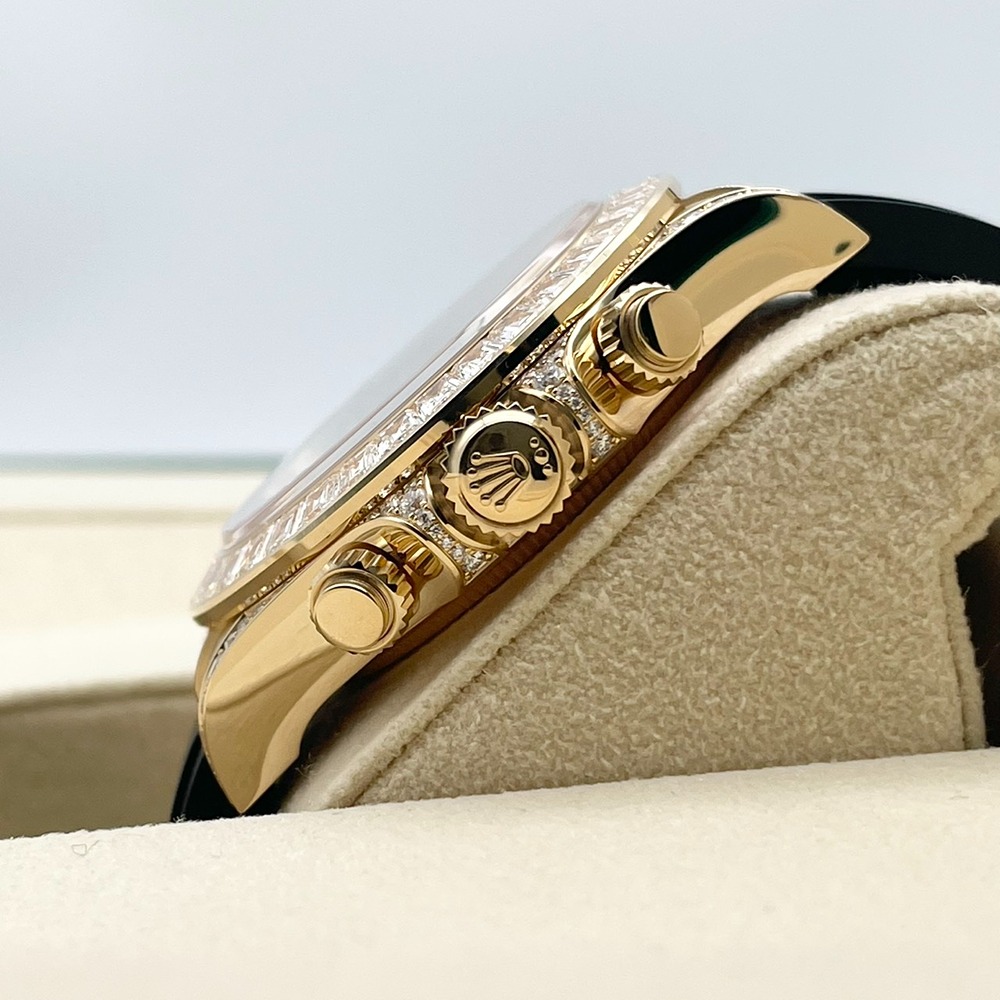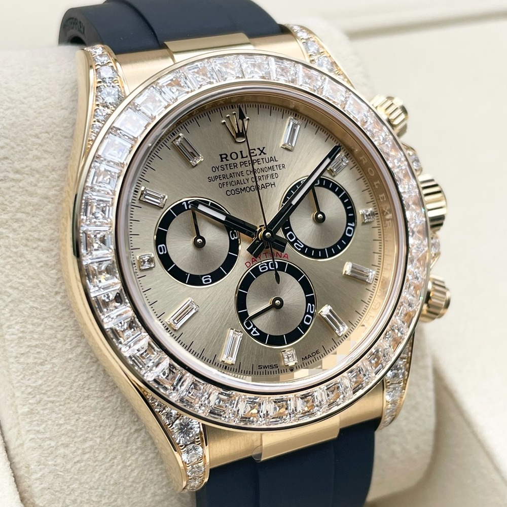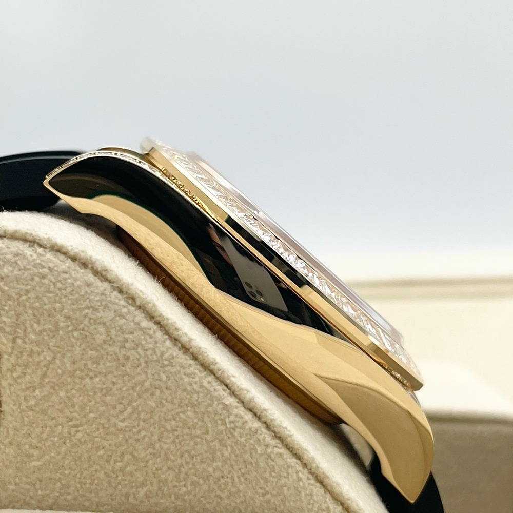 金無垢18ctイエローゴールドのケースに、ダイヤモンドをあしらったベゼル&ラグ。ゴールデンダイアルにはブラックのクロノグラフカウンターが映え、ラグジュアリーと精緻が共存するデザインです。自社鋳造による最高品質の18ctゴールドを用い、ラボ検査を経て製造工程に至るという、Rolexならではの“素材からのこだわり”があります。内部にはキャリバー4131を搭載。72時間ものパワーリザーブとクロノグラフ機能(センター秒針、30分計、12時間計)を備え、機械としての性能も抜かりなしです。また、ラバーストラップ仕立ての「オイスターフレックス」ブレスレットは、金属ブレードを高性能エラストマーで覆う仕様であり、快適さと堅牢性を両立。さらに、オイスター ロック安全バックルとグライドロック延長システムも備えています。防水性能は100メートル。スポーツクロノグラフとしての実用性も兼ね備えた逸品です。