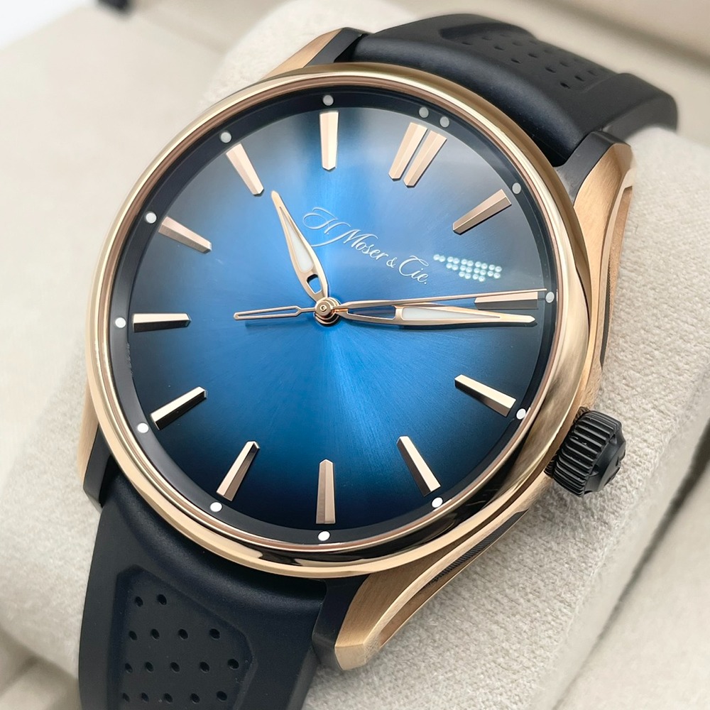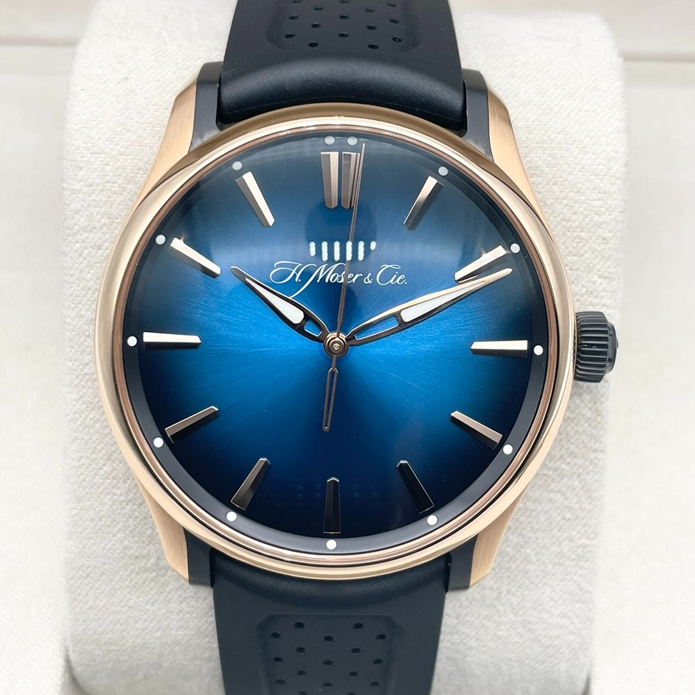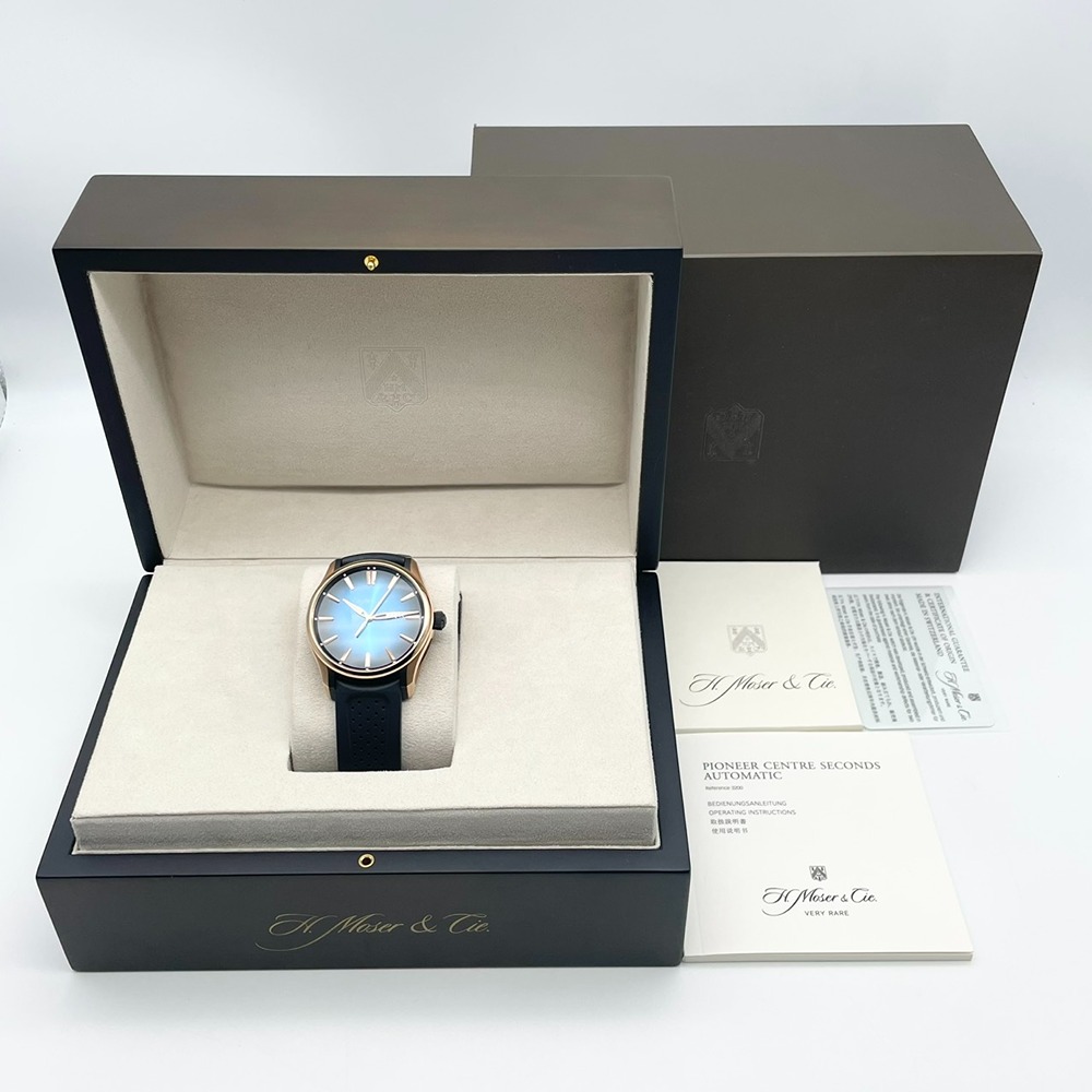 「Hモーザー パイオニア・センターセコンド」は、非常に優雅で洗練された時計です。レッドゴールドとDLCチタンの組み合わせが、耐久性と高級感を兼ね備えています。42.8㎜のケースサイズが着用者の手元を引き立て、ミッドナイトブルーの文字盤が視線を惹きつけます。この時計を手にすることで、スタイルに新たなレベルの優雅さと洗練を加えることができるでしょう。