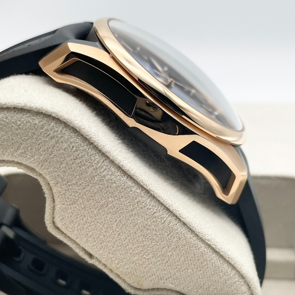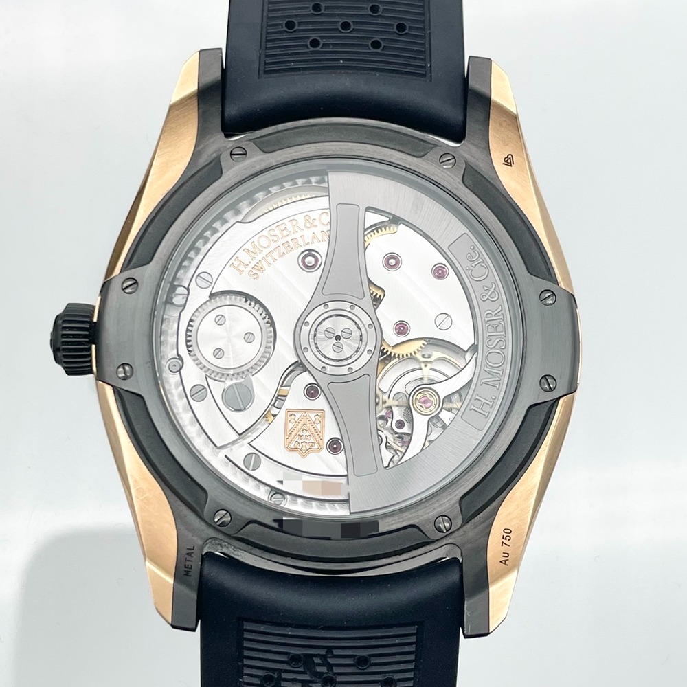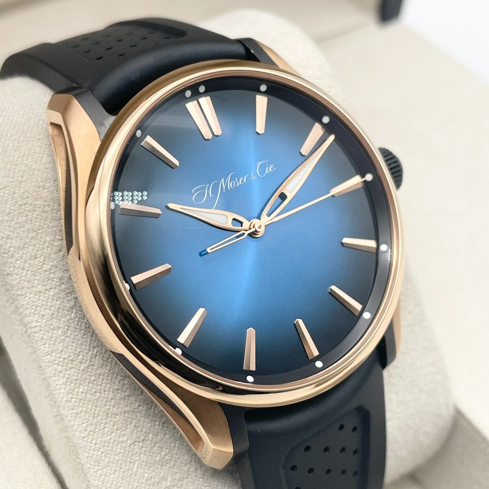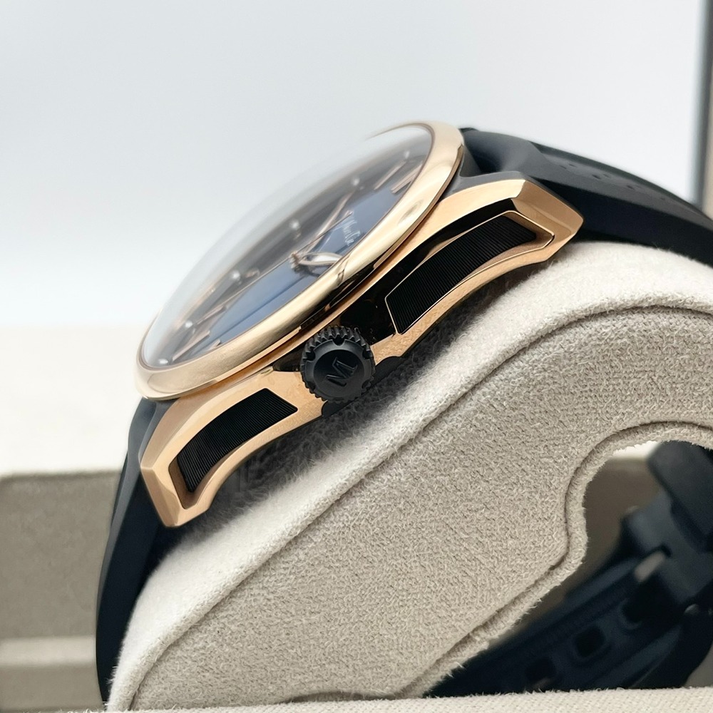 「Hモーザー パイオニア・センターセコンド」は、非常に優雅で洗練された時計です。レッドゴールドとDLCチタンの組み合わせが、耐久性と高級感を兼ね備えています。42.8㎜のケースサイズが着用者の手元を引き立て、ミッドナイトブルーの文字盤が視線を惹きつけます。この時計を手にすることで、スタイルに新たなレベルの優雅さと洗練を加えることができるでしょう。