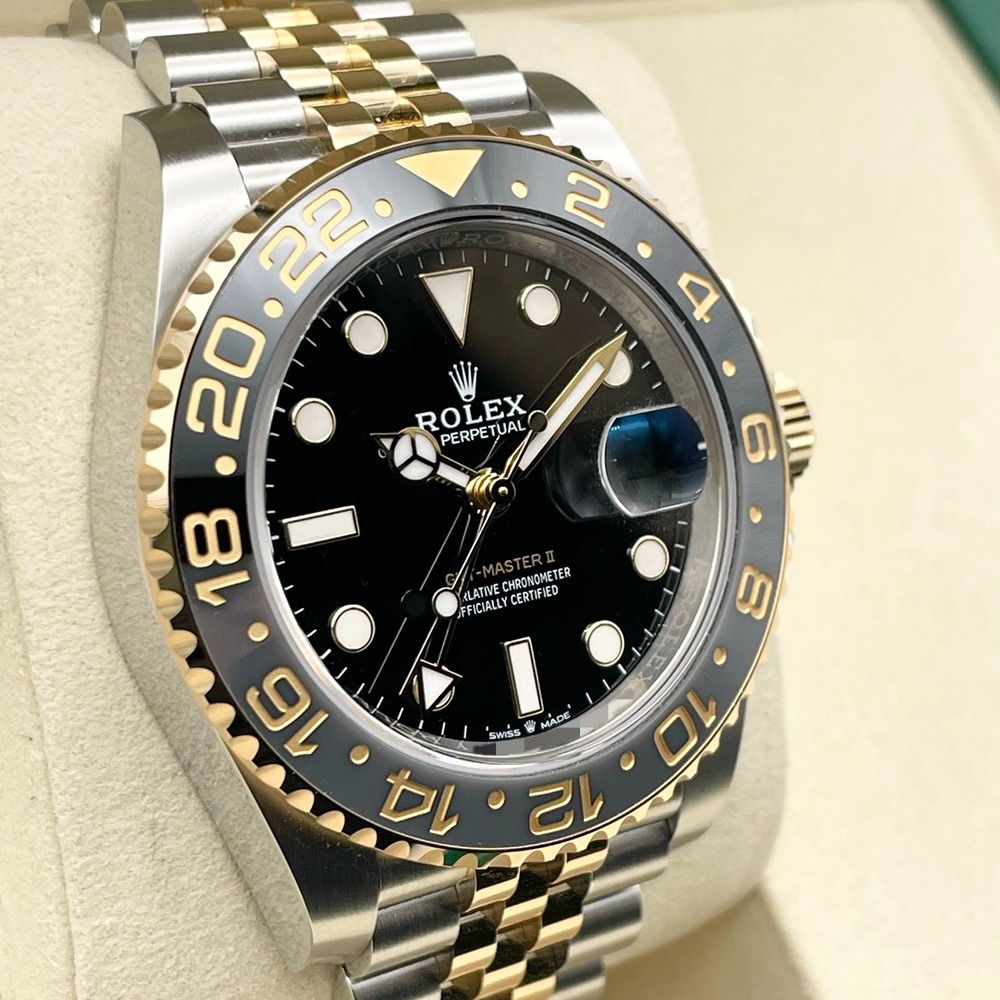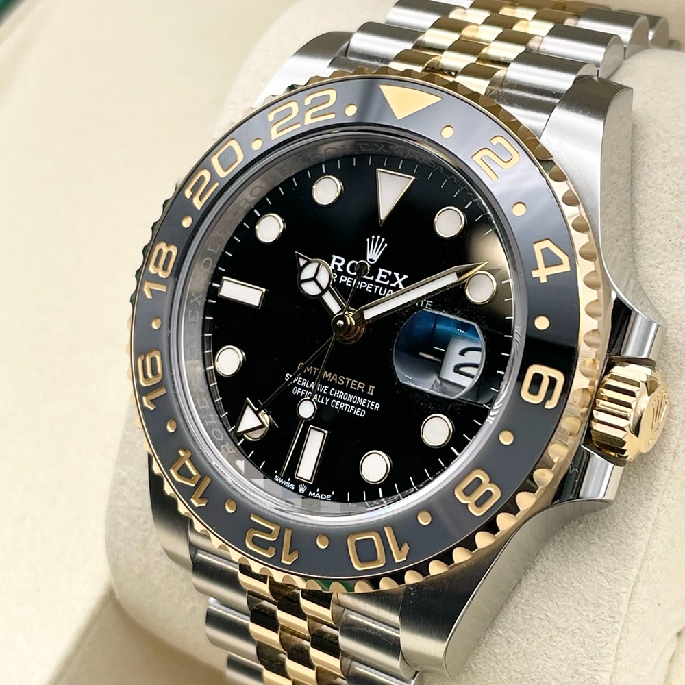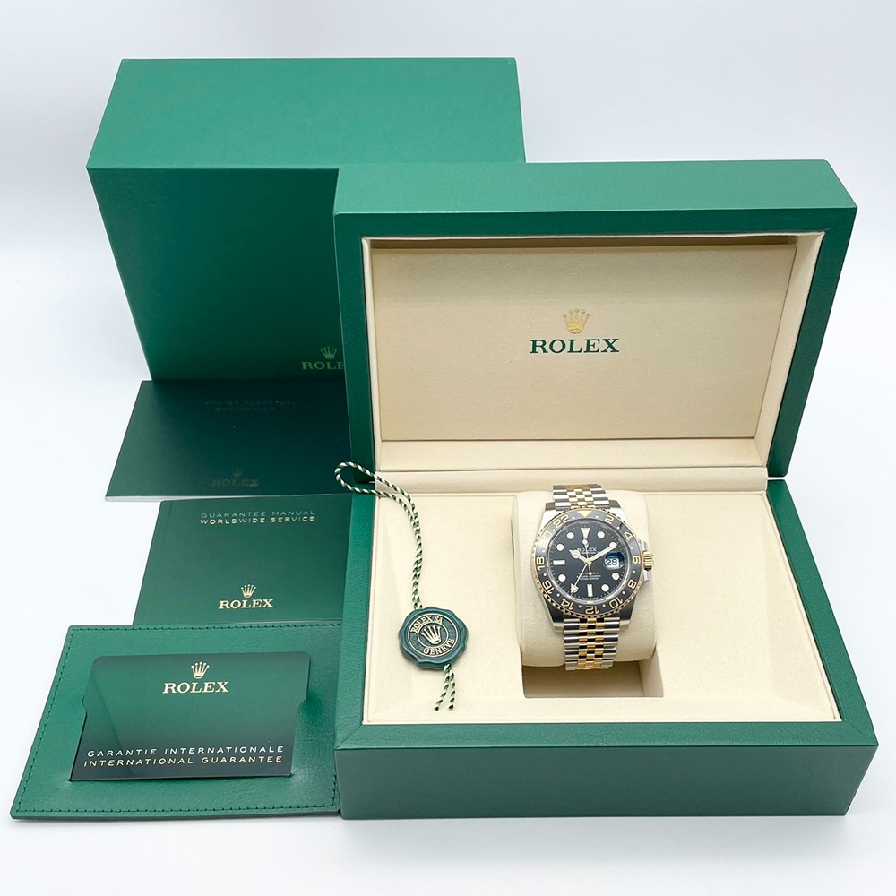 ロレックスのGMTマスターⅡモデルは、そのクラシックでありながらモダンなデザインが多くの愛好者を魅了します。ステンレススチールとイエローゴールドの組み合わせが、コントラストの美しさを引き立て、高級感と耐久性を兼ね備えています。ブラックの文字盤がシックで、どんなシーンにもマッチします。