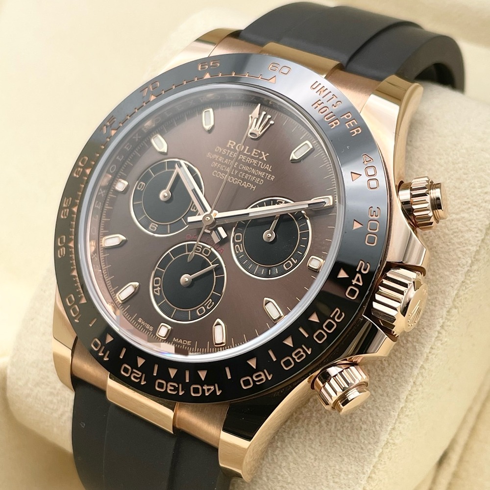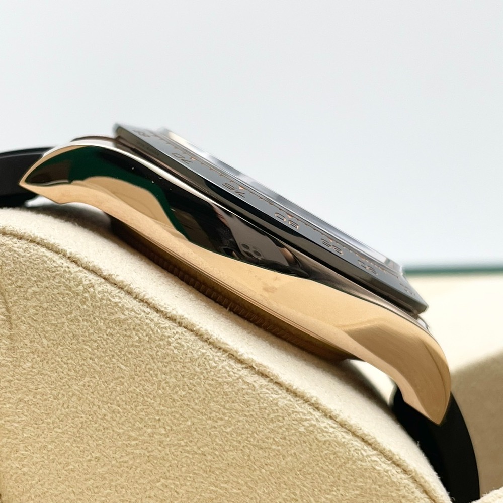 ロレックス デイトナ 116515LNは、時計愛好者にとって憧れの的です。エバーローズゴールドのケースに、落ち着いた印象を与えるチョコレートとブラックの文字盤が組み合わさり、その美しさは見る者を魅了します。40mmのサイズが、手元に絶妙な存在感をもたらし、どんなスタイルにもマッチします。デイトナは、精度と機能性を兼ね備えたクロノグラフ機能を持つ、このシリーズの象徴とも言えるモデルです。この素晴らしいアイテムにより、日々の装いにラグジュアリーなアクセントを加えてみませんか?