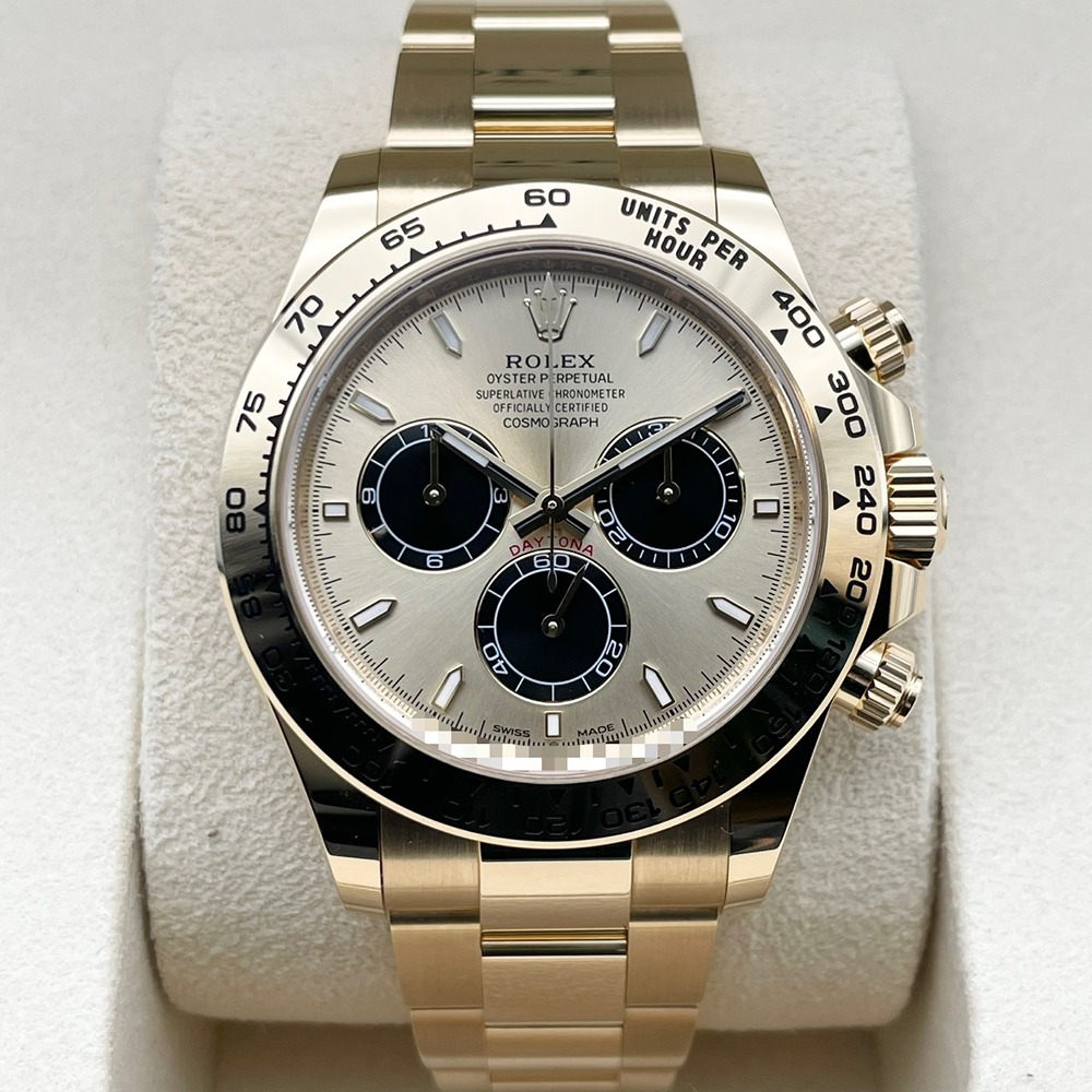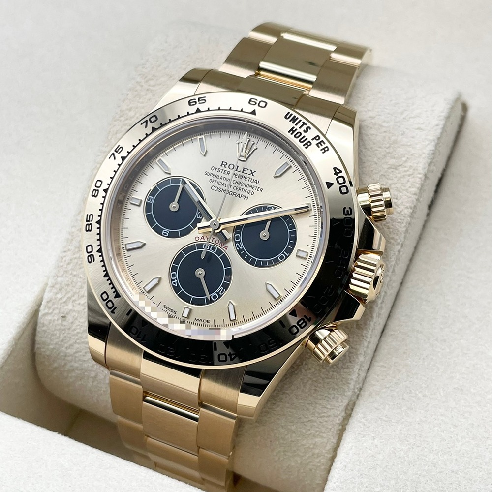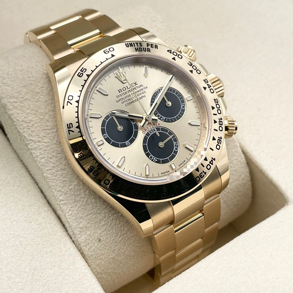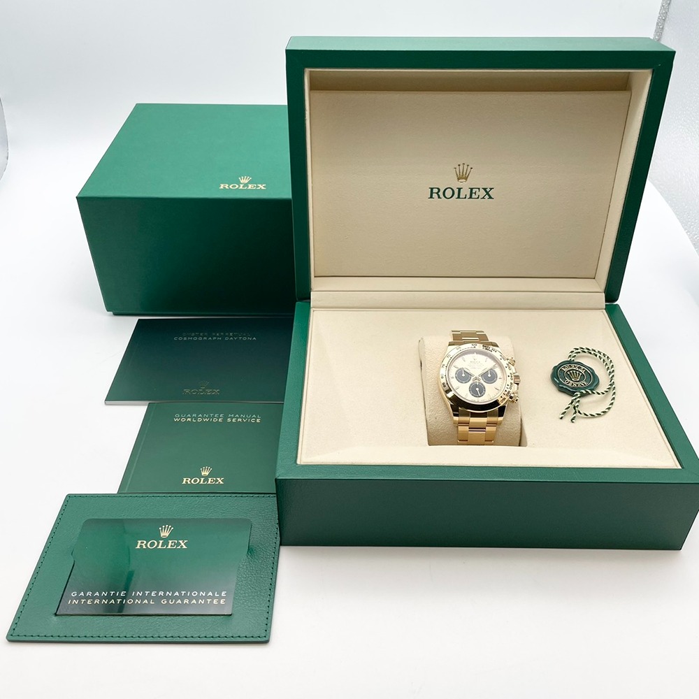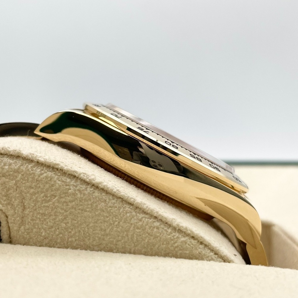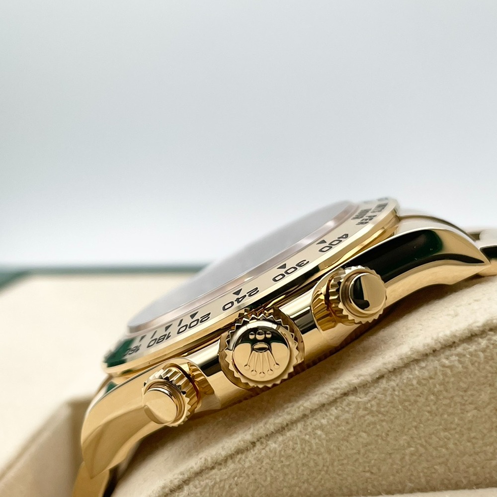 ロレックス スポーツモデルの頂点「デイトナ」126508。重厚な18Kイエローゴールドケースとブレスレットに、ゴールデン・ブライトブラック文字盤が組み合わさった一本は、華やかさと精悍さを併せ持つ特別な存在です。