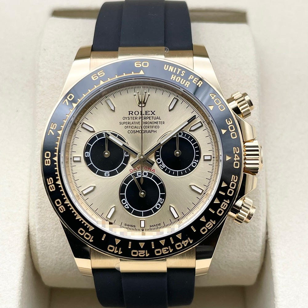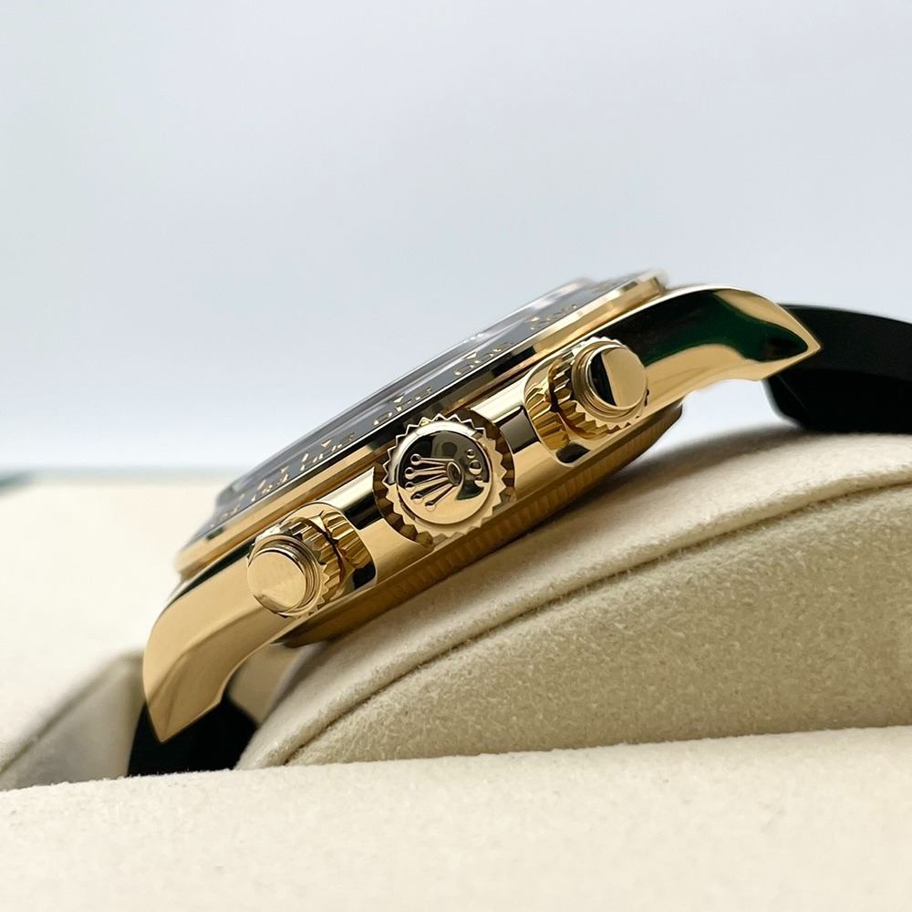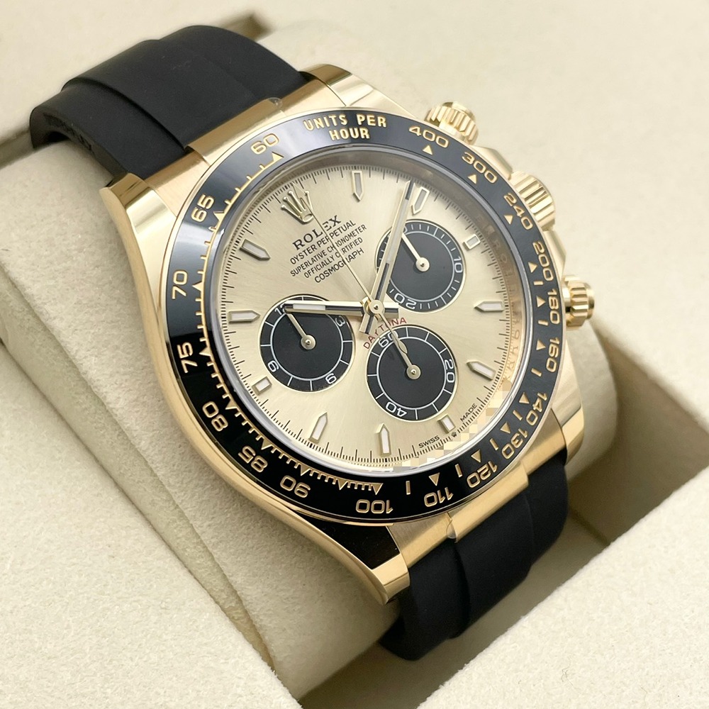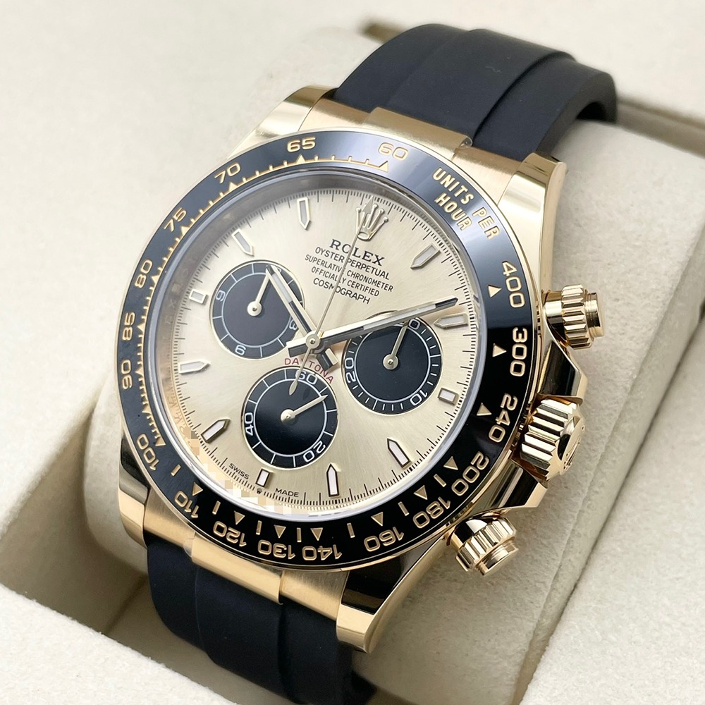 ロレックスのスポーツモデルの頂点「デイトナ」に、リッチなイエローゴールドケースと、ゴールデン&ブライトブラックダイヤルの組み合わせが映える一本です。サーキットの計測機器をルーツに持つクロノグラフを備えつつ、上品な配色によりビジネスからフォーマルまで幅広くご愛用いただけます。40mmという絶妙なサイズ感で主張しすぎず、しかし確かな存在感を放つバランスの良さも魅力です。海外では通称「ピカチュウ」と呼ばれているこのモデルは、流通数も少なく限られており、資産性と満足度を兼ね備えた一本をお探しの方に大変おすすめです。