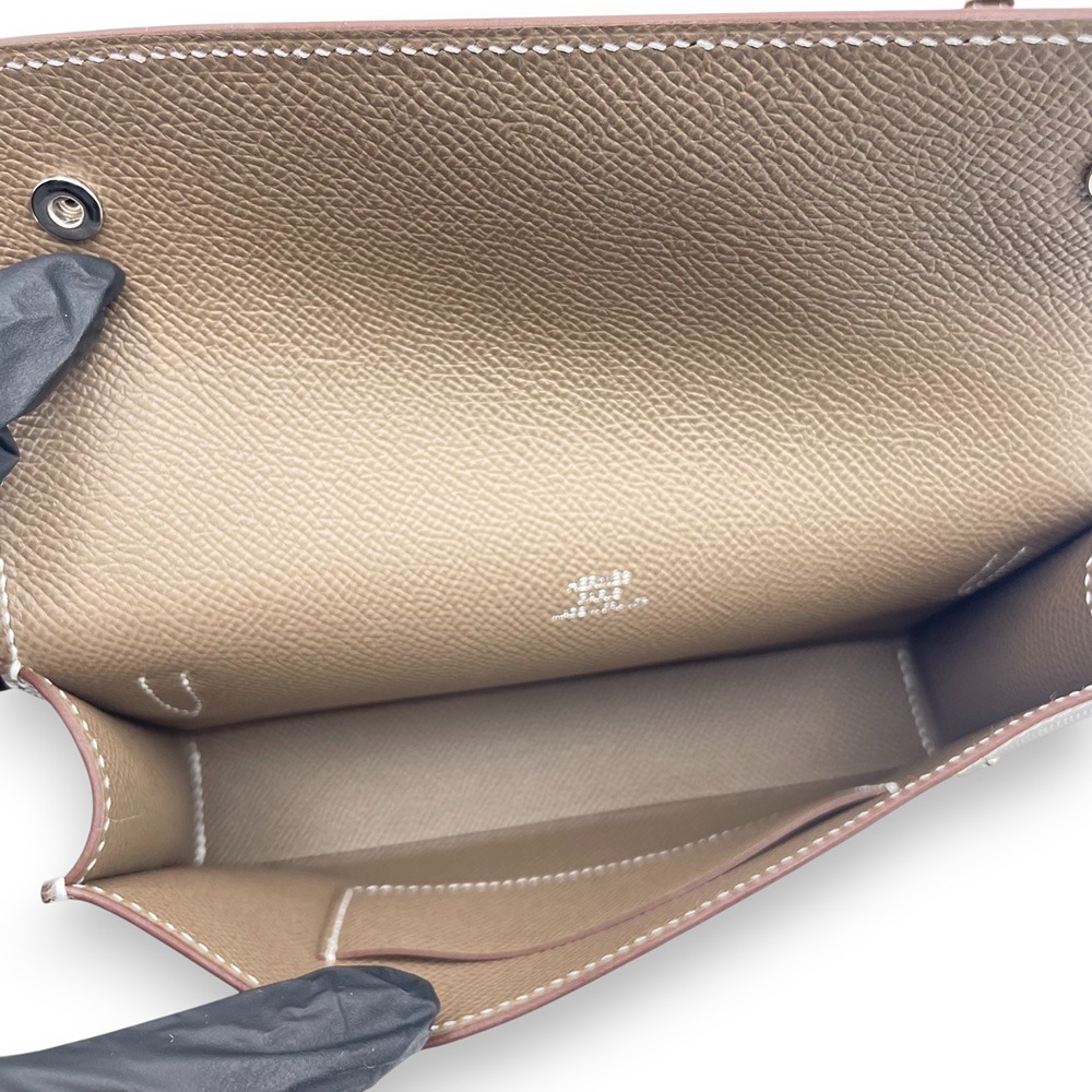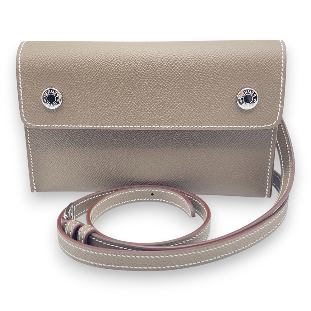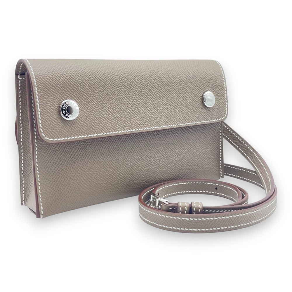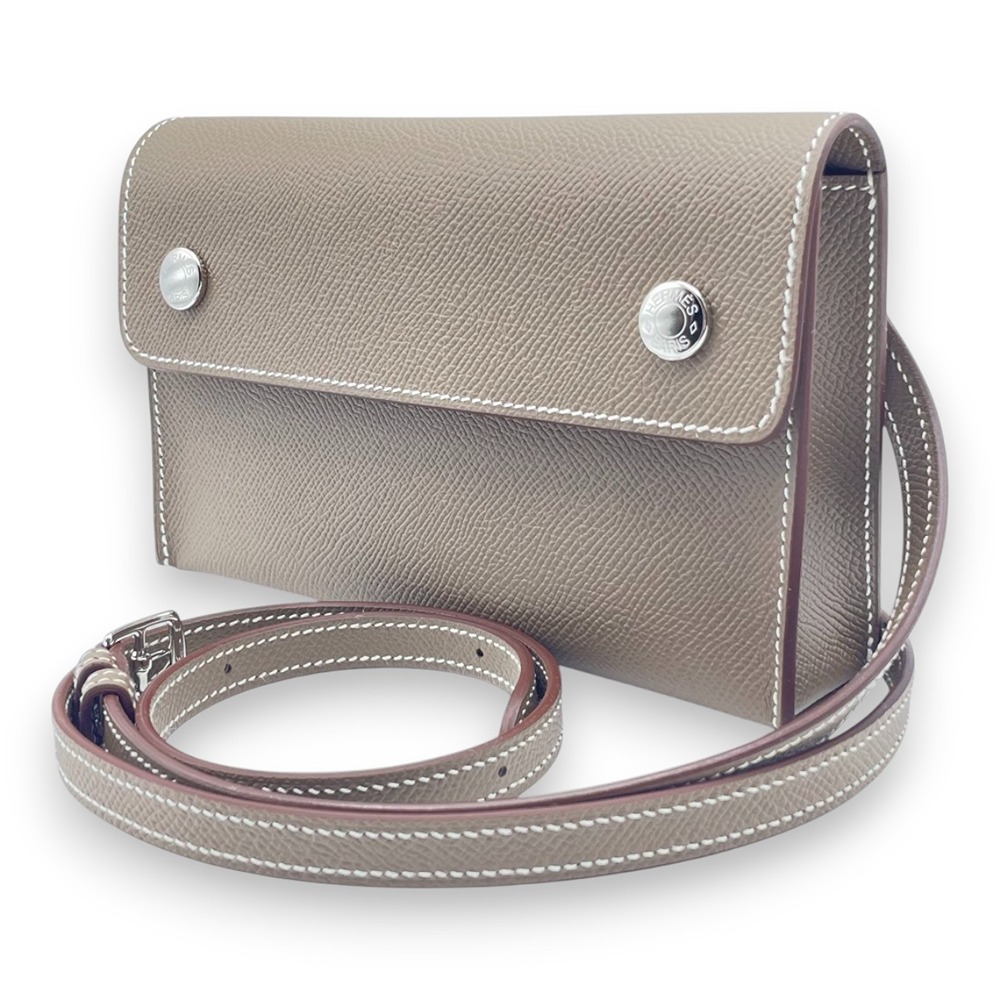 エルメスのナップトゥーゴーは、上質なエプソン素材を使用した、軽やかでデイリーに使いやすいミニバッグです。絶妙なニュアンスカラーであるエトゥープが、コーディネートを選ばず上品に馴染みます。斜め掛けや肩掛けもしやすいサイズ感で、必要なものだけをスマートに持ち歩きたい方に最適。手元からさりげなくエルメスらしい気品を演出してくれる、大人の女性にふさわしい逸品です。