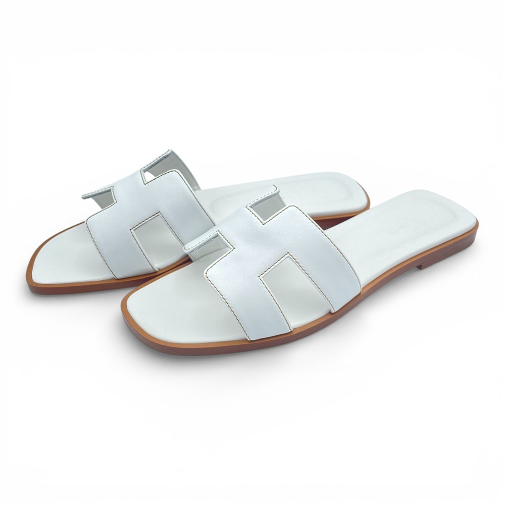 エルメスを代表する定番サンダル「オラン」。アイコニックなHモチーフが足元をさりげなく主張し、ラフなスタイルにもエレガントな装いにも溶け込む一足です。色味はどんなコーディネートにも合わせやすいホワイト色「ブラン」。デニムやワンピース、リゾートスタイルから都会的なジャケットスタイルまで、男女問わず洗練された抜け感を演出します。フラットで歩きやすく、デイリーにも旅先にも活躍。シンプルだからこそ、上質さとセンスが際立つ逸品です。