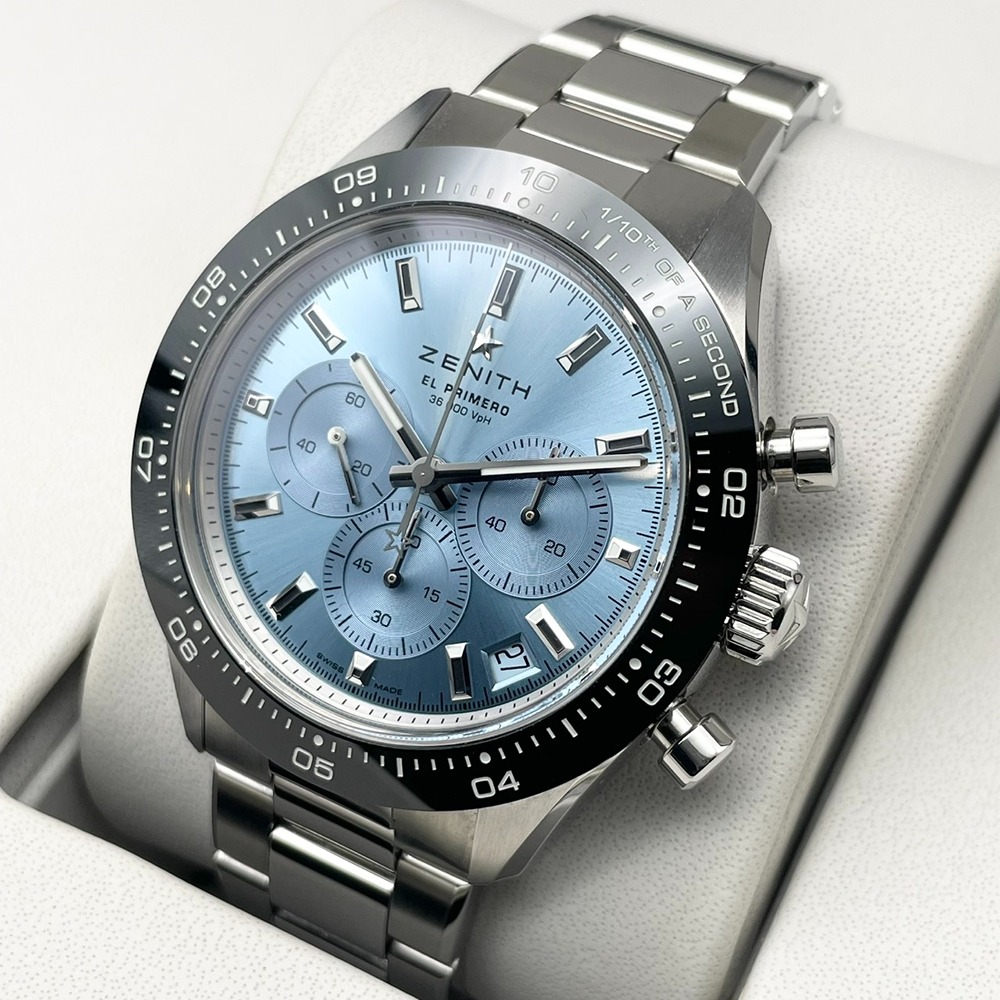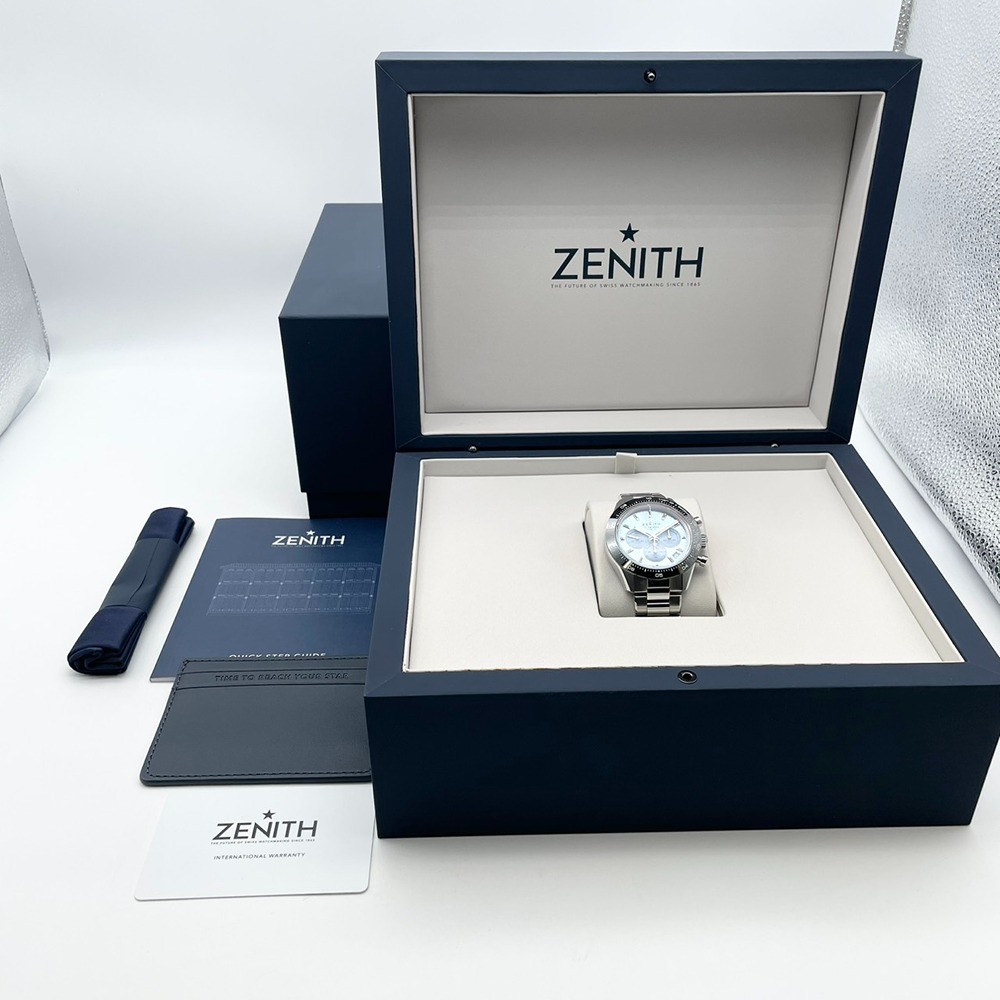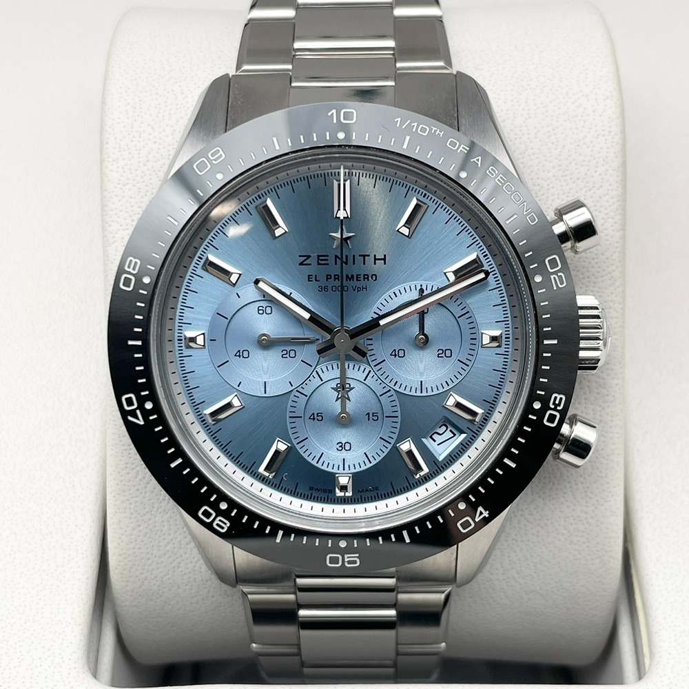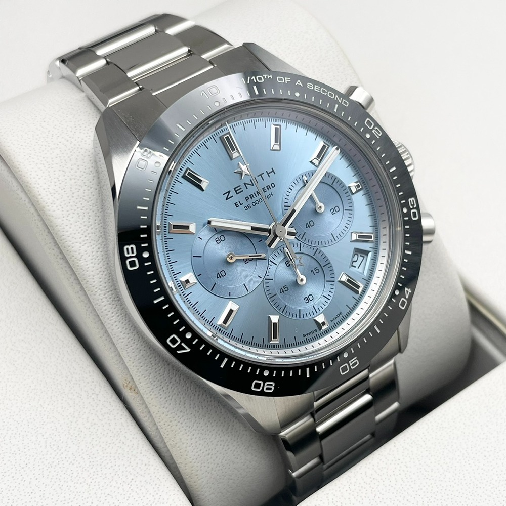 ゼニス屈指の人気シリーズ「クロノマスター スポーツ」を、澄み切ったアイスブルーダイヤルで仕立てたヨシダ スペシャル エディション。洗練された色味と精緻なクロノグラフ表示が、スポーティさとラグジュアリーさを高次元で両立させています。ゼニス自慢のハイビートムーブメントが生む滑らかなクロノ針の動きは、腕元を見るたびに所有する喜びを感じさせてくれるはず。41mmの程よい存在感とステンレススチールの扱いやすさで、オン・オフ問わず活躍する一本です。中古美品個体のため、コンディションと価格バランスに優れた、狙い目の特別モデルです。