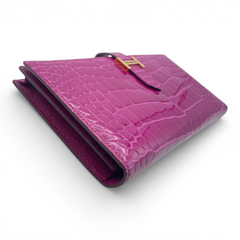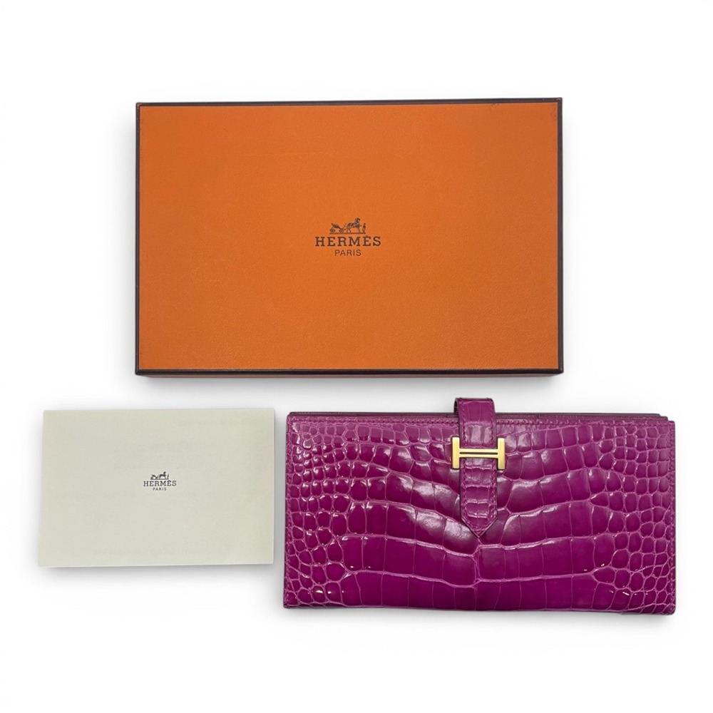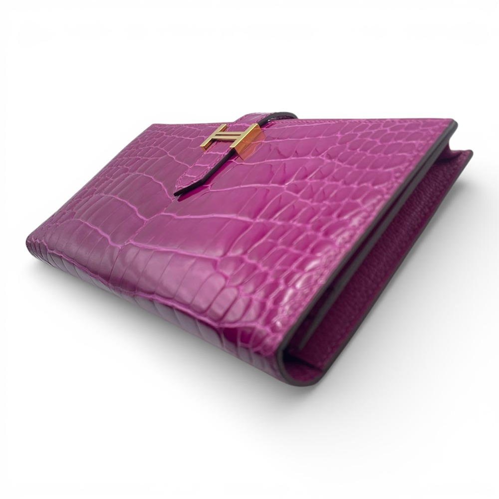 エルメスのべアンスフレは、女性のための洗練されたデザインとして人気を誇るアイテムです。希少なアリゲーターにのみ宿る、艶やかな光沢と繊細な斑模様が、ローズシェヘラザードの発色をいっそうドラマティックに引き立てます。カードや紙幣をスマートに収納できる機能美と、H金具のワンポイントが生む洗練された印象は、ビジネスシーンにもラグジュアリーな装いにもマッチ。手元から “品格” を演出したい女性はもちろん、特別なギフトをお探しの男性にもおすすめの一本です。