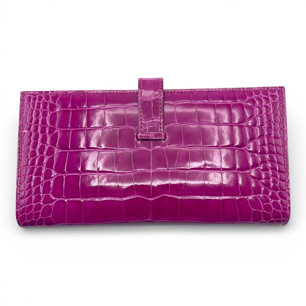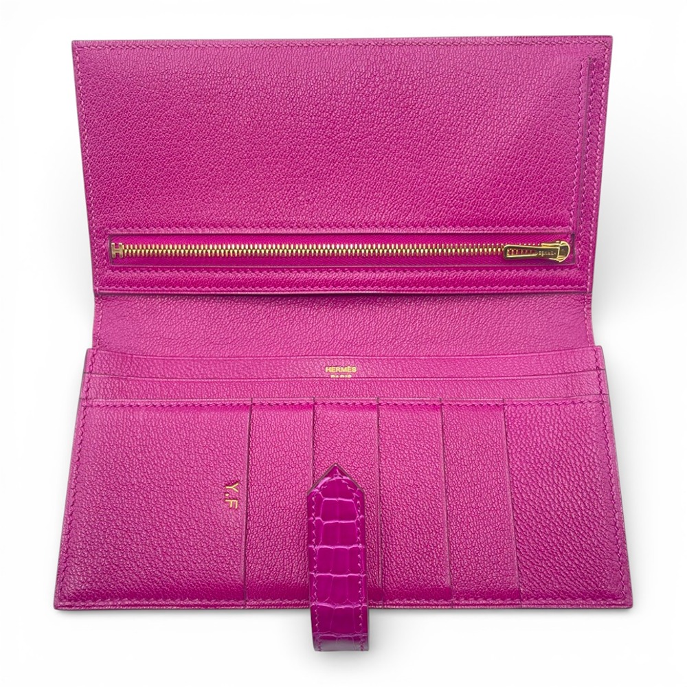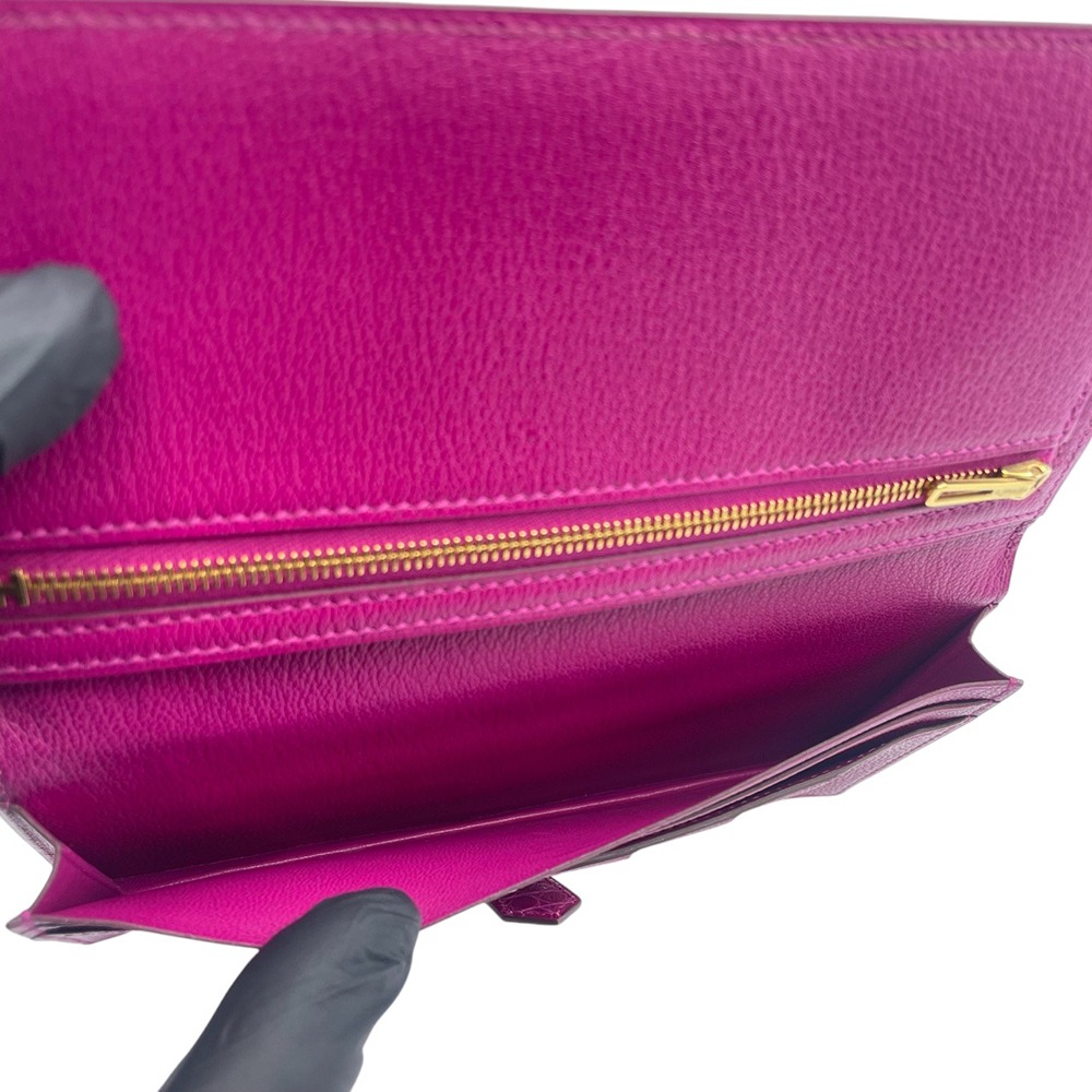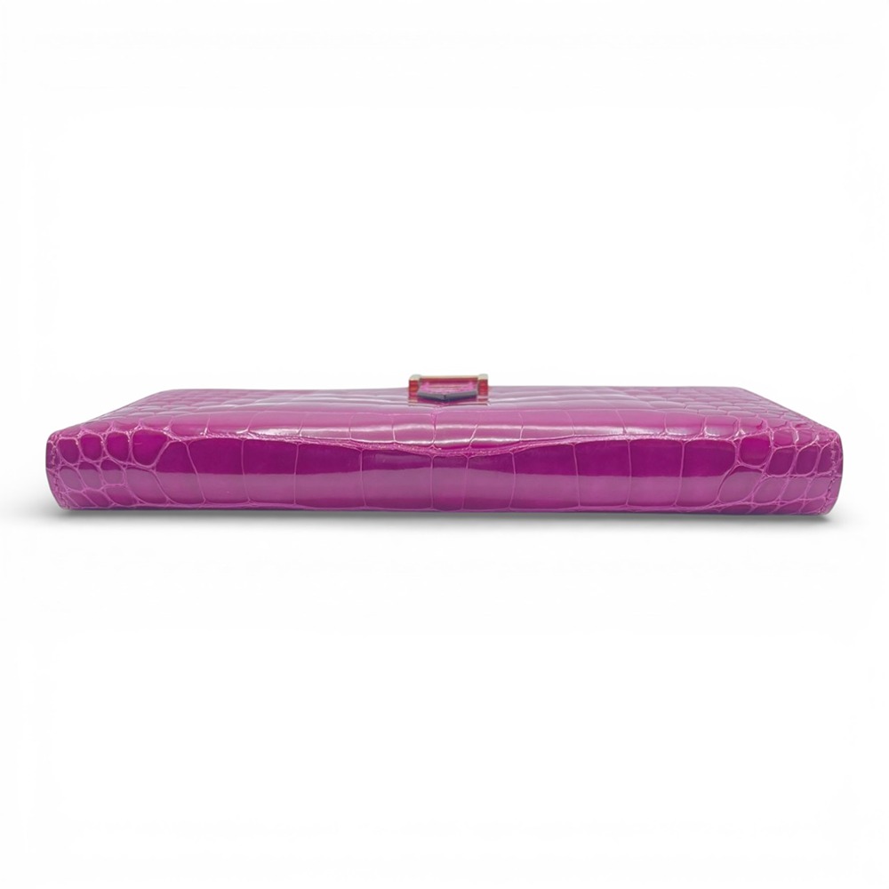 エルメスのべアンスフレは、女性のための洗練されたデザインとして人気を誇るアイテムです。希少なアリゲーターにのみ宿る、艶やかな光沢と繊細な斑模様が、ローズシェヘラザードの発色をいっそうドラマティックに引き立てます。カードや紙幣をスマートに収納できる機能美と、H金具のワンポイントが生む洗練された印象は、ビジネスシーンにもラグジュアリーな装いにもマッチ。手元から “品格” を演出したい女性はもちろん、特別なギフトをお探しの男性にもおすすめの一本です。