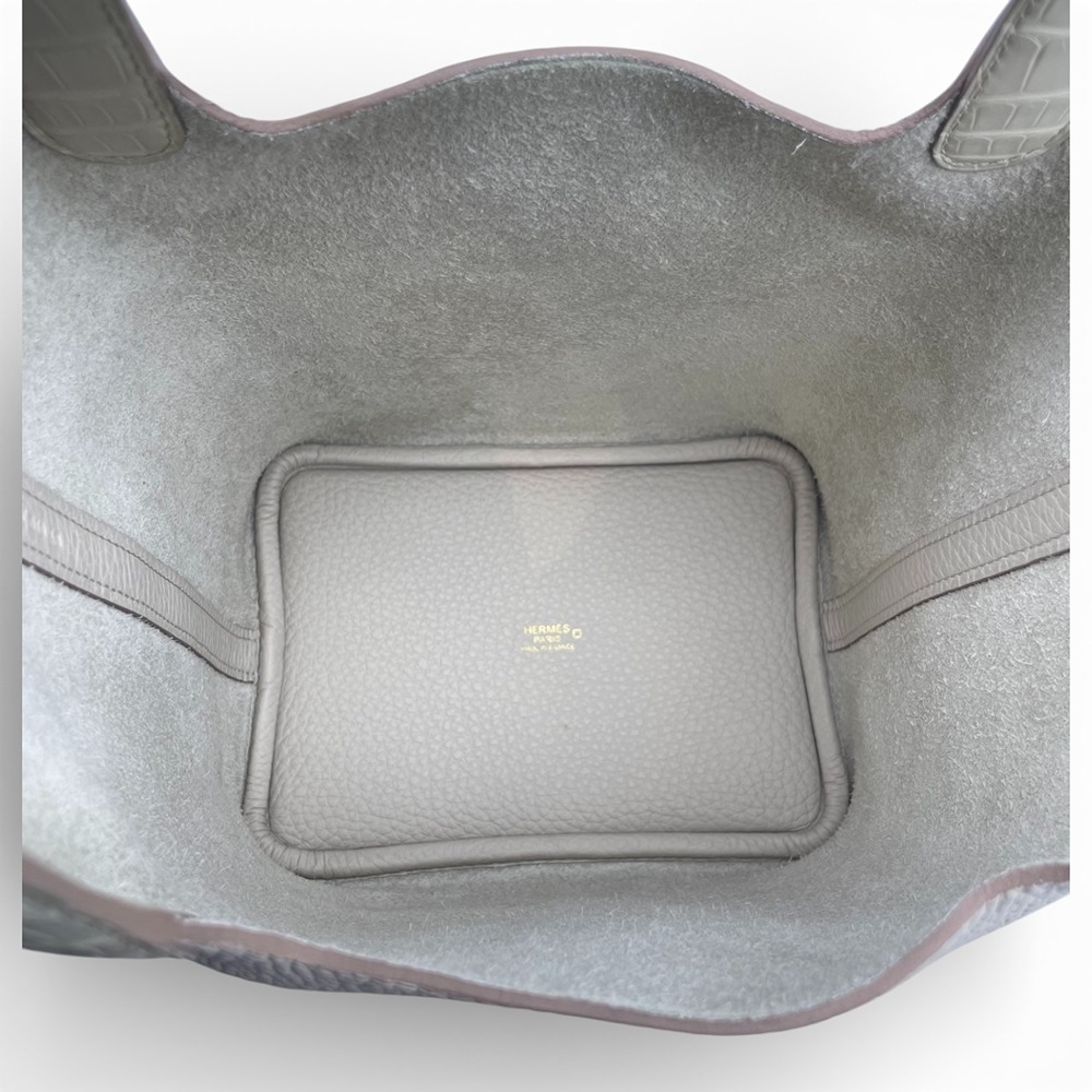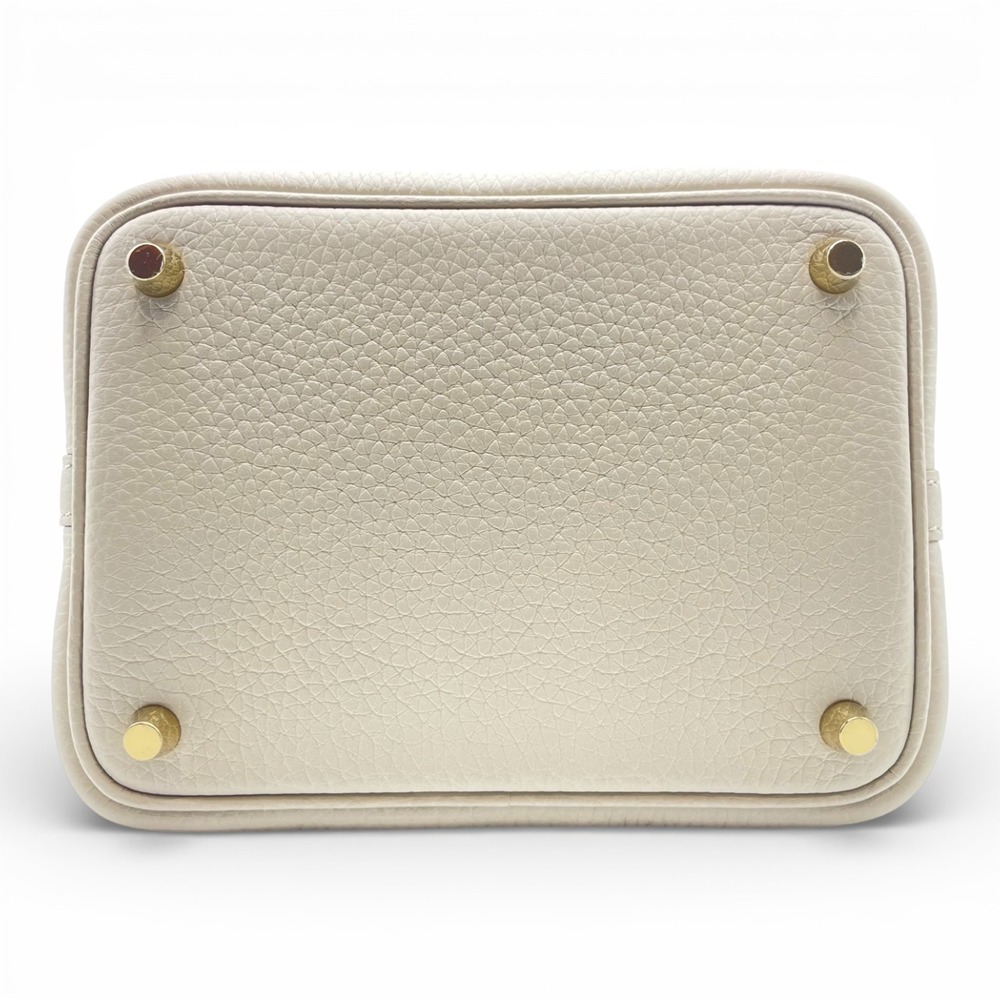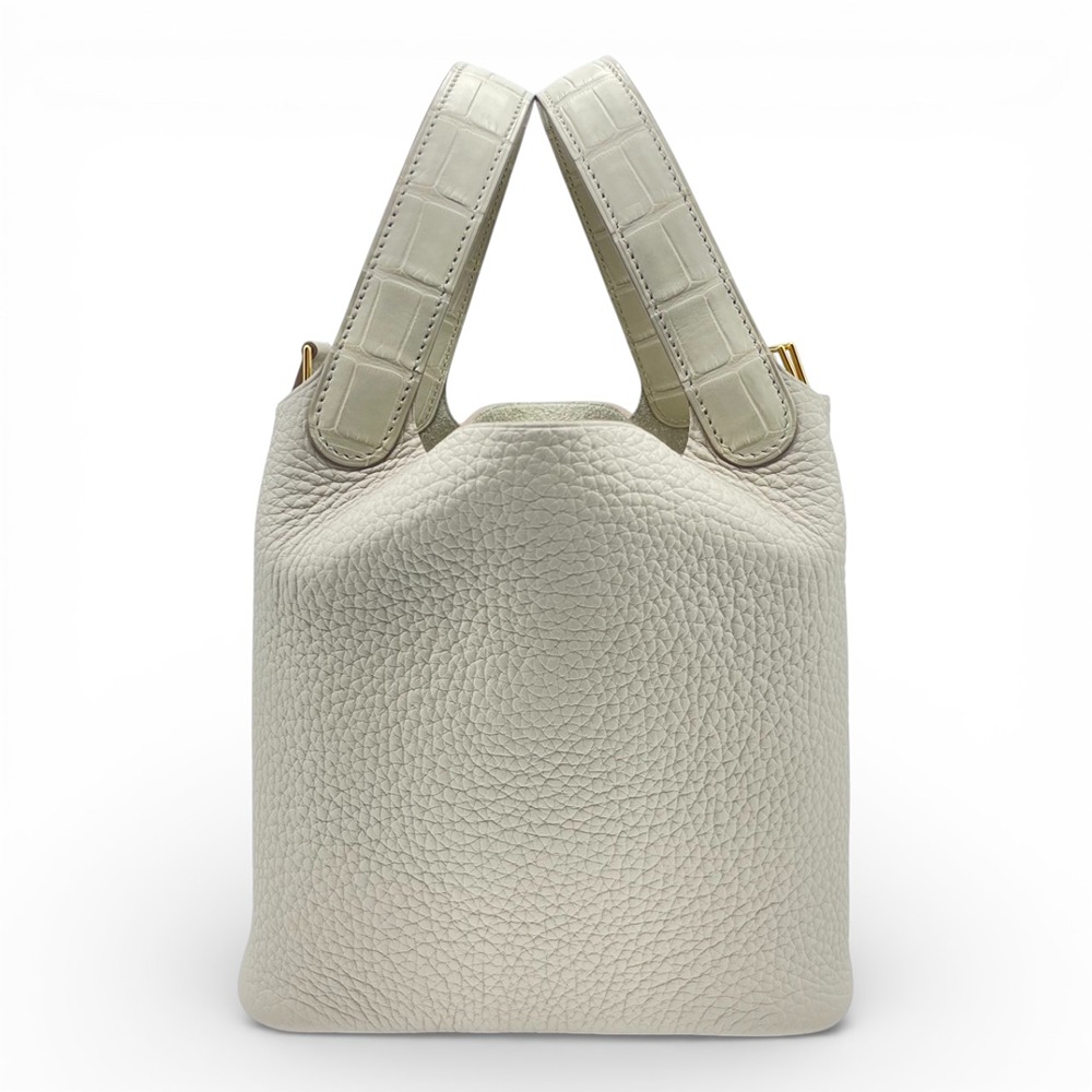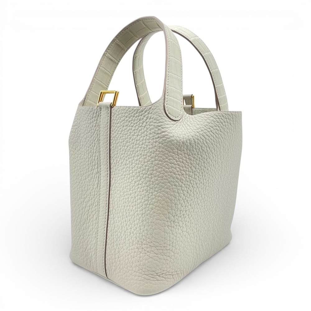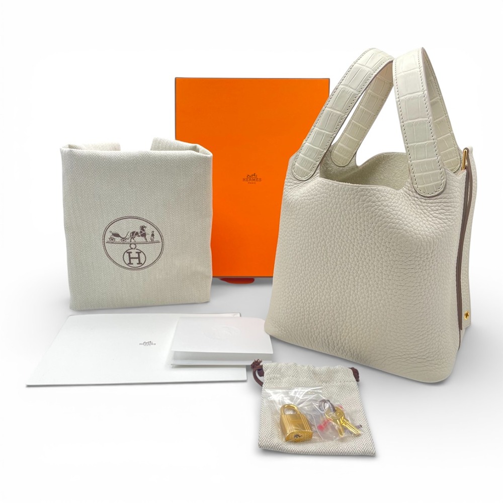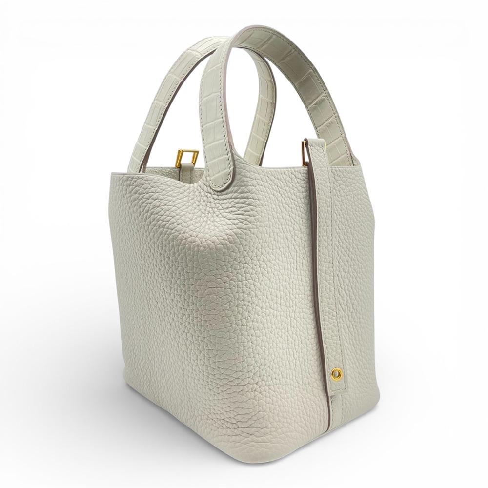 エルメスを代表するアイコンバッグ「ピコタンロック」。上品なくすみホワイトの「ベトン」は、エルメスの中でも特に人気の高いエレガントカラー。柔らかなトリヨンクレマンスが生み出すふっくらとしたフォルムに、ハンドルのアリゲーターマットがさりげないラグジュアリーをプラスします。PMサイズは、女性にはデイリー使いしやすく、男性がパートナーへのギフトとして選ばれることも多い絶妙なバランス。シンプルな装いに一点合わせるだけで、日常が一段と洗練された印象に。オン・オフ問わず永くご愛用いただける、ワンランク上のピコタンロックです。