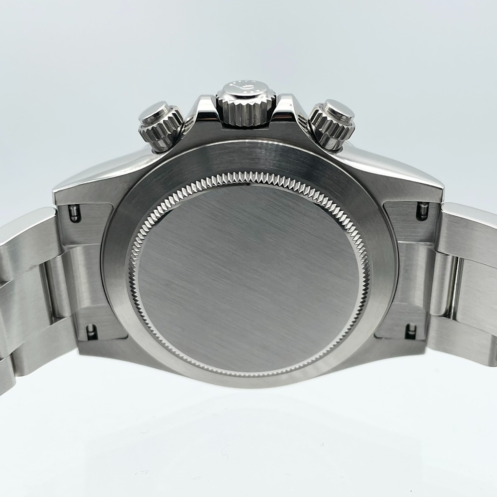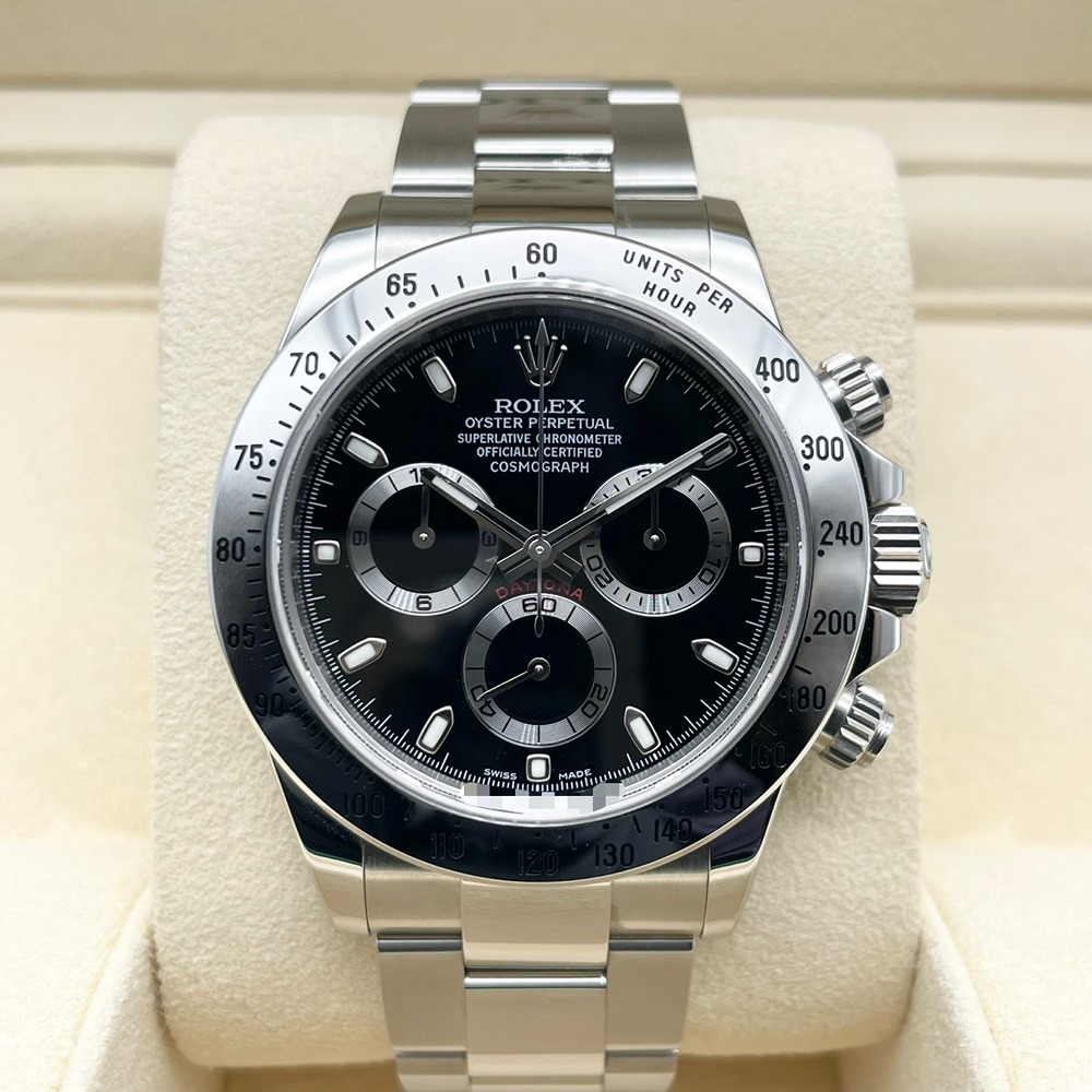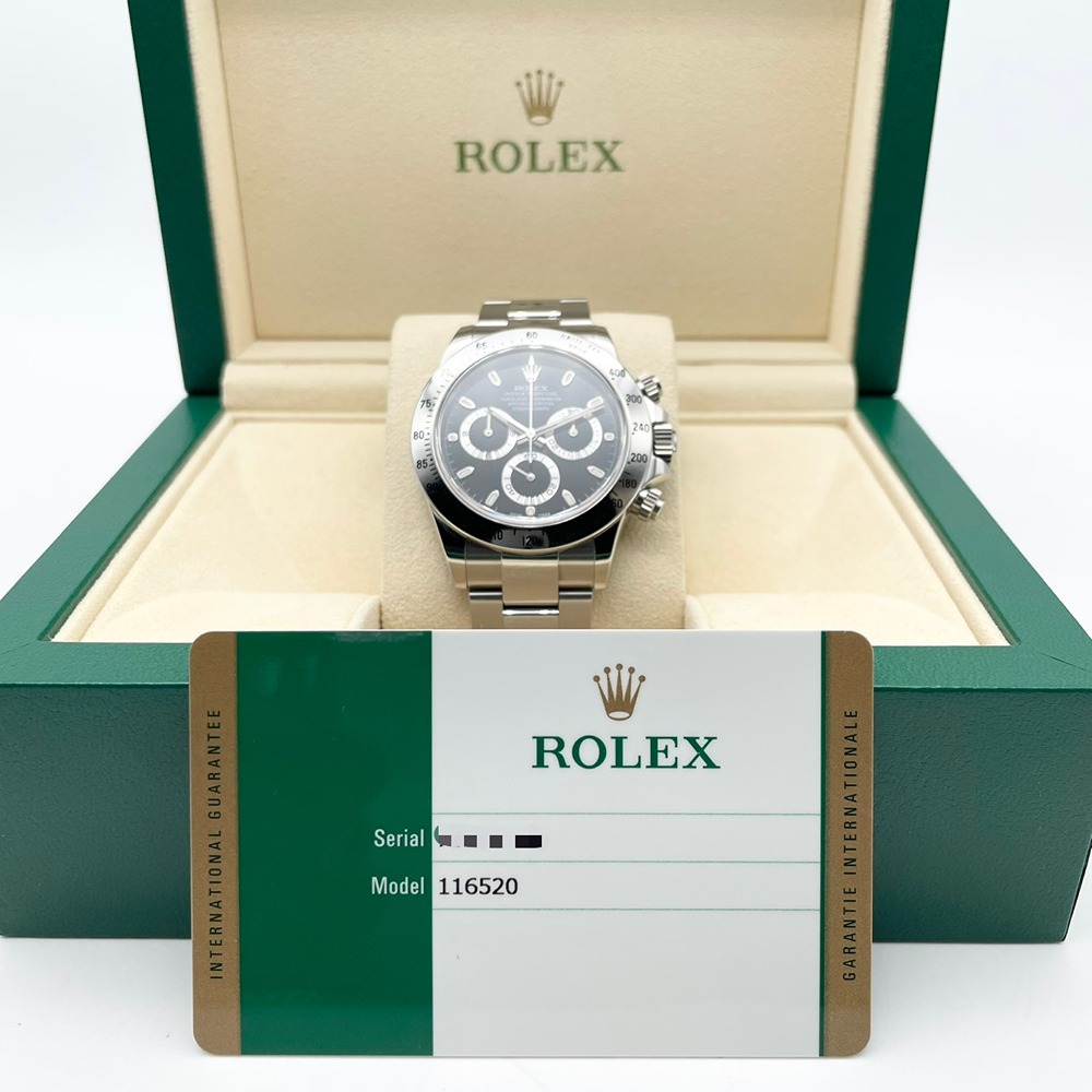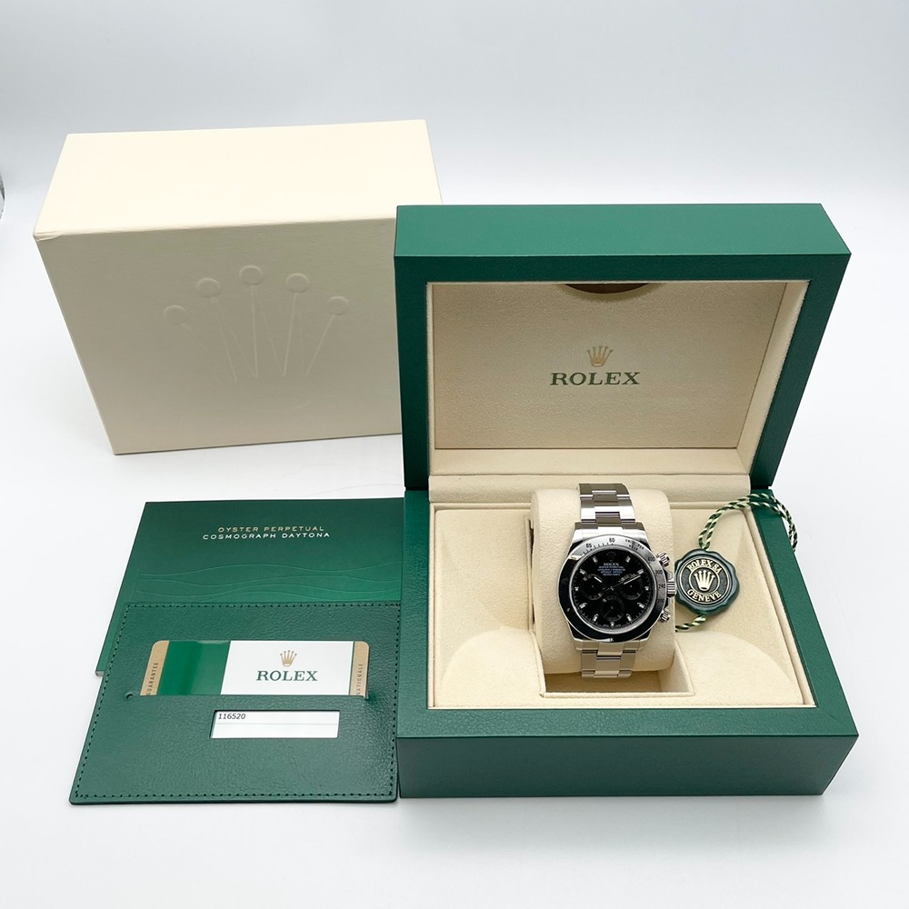 ロレックス デイトナ 116520はスポーツとエレガンスを兼ね備えた至高のタイムピースです。ブラックダイヤルがオーラを放ち、多機能なクロノグラフが高精度を保証します。40mmのステンレススチール製ケースは丈夫でありながら軽量で、手首にぴったりフィットします。時代を超えて愛され続けるこのモデルは、スポーツシーンでもフォーマルな場でもその存在感を示します。中古ですが、その洗練された美しさは健在です。