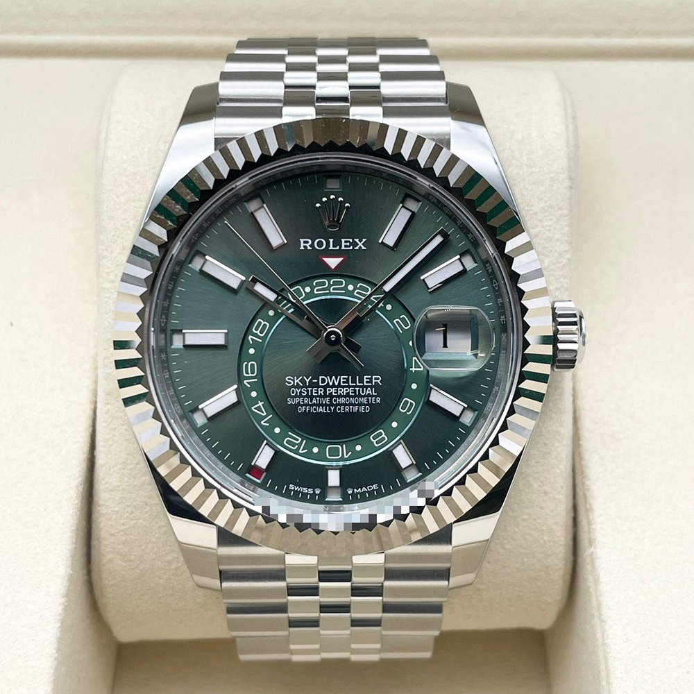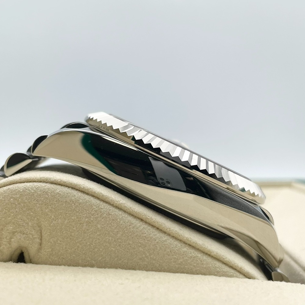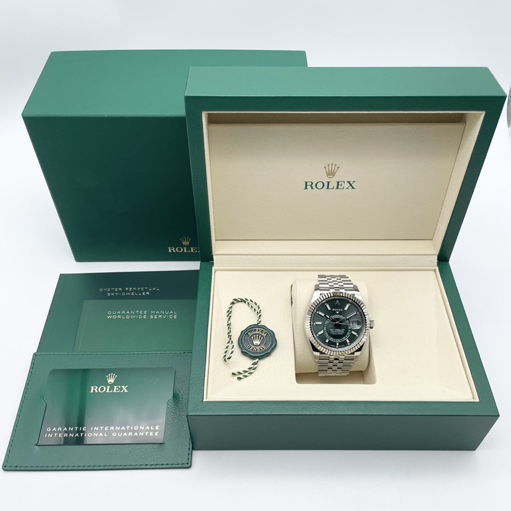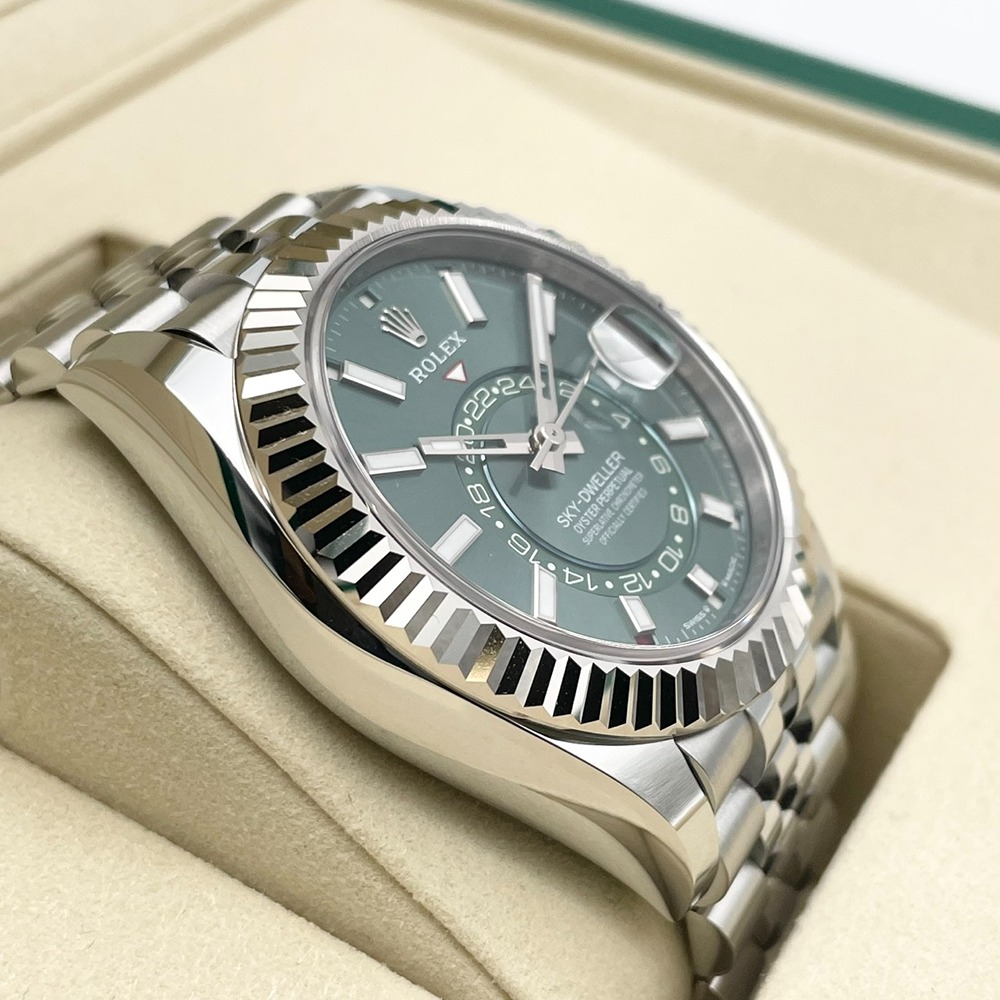 ロレックスならではの先進機構を凝縮したスカイドゥエラーは、年次カレンダーとデュアルタイムを備えた“旅人のための一本”。爽やかなミントグリーン文字盤は、光の角度で多彩な表情を見せ、ビジネスシーンからフォーマルまで品良く腕元を彩ります。42mmケースとステンレススチールの程よい存在感は、視認性と装着感のバランスに優れ、日常使いにも最適。2025年3月の保証書付き新品未使用品という点も、資産性を重視される方にとって大きな魅力です。状態・条件ともに揃った一本をぜひご検討ください。