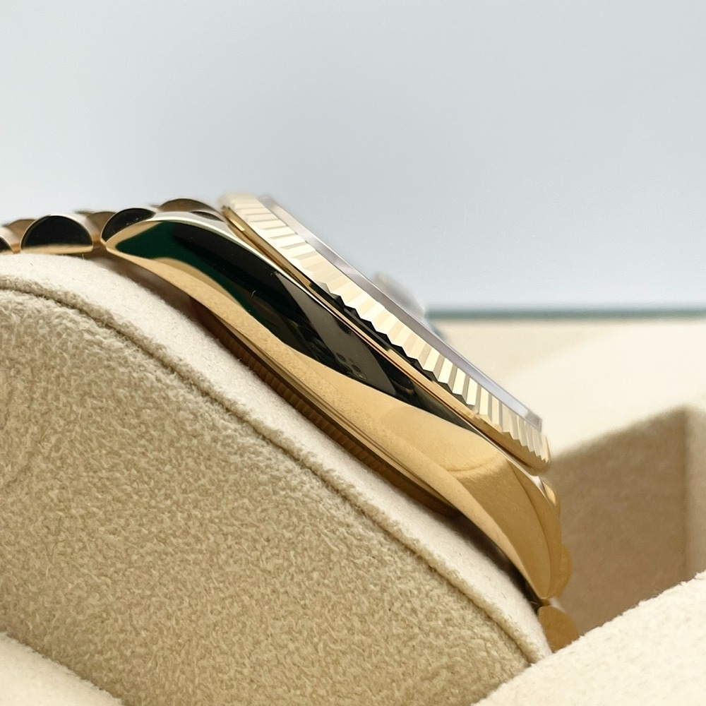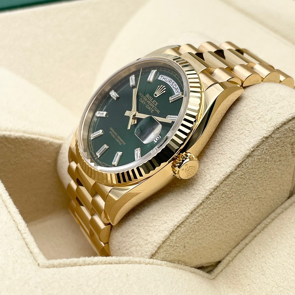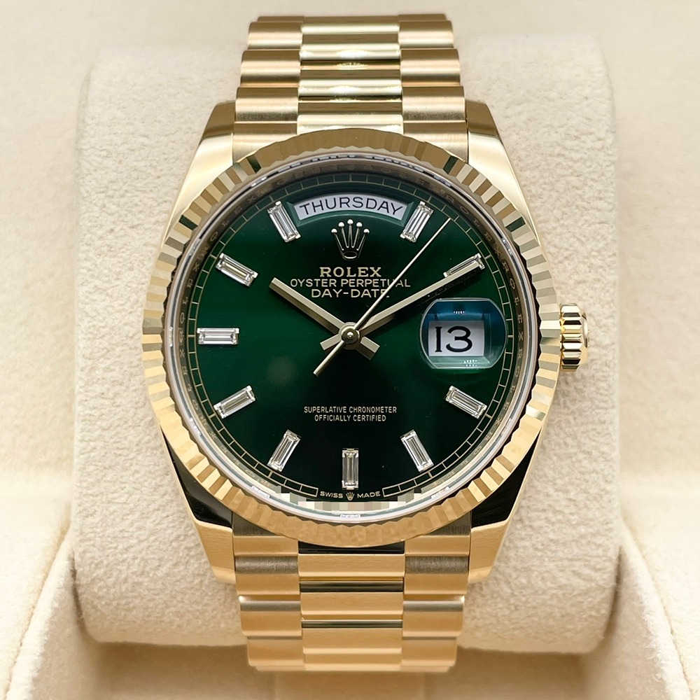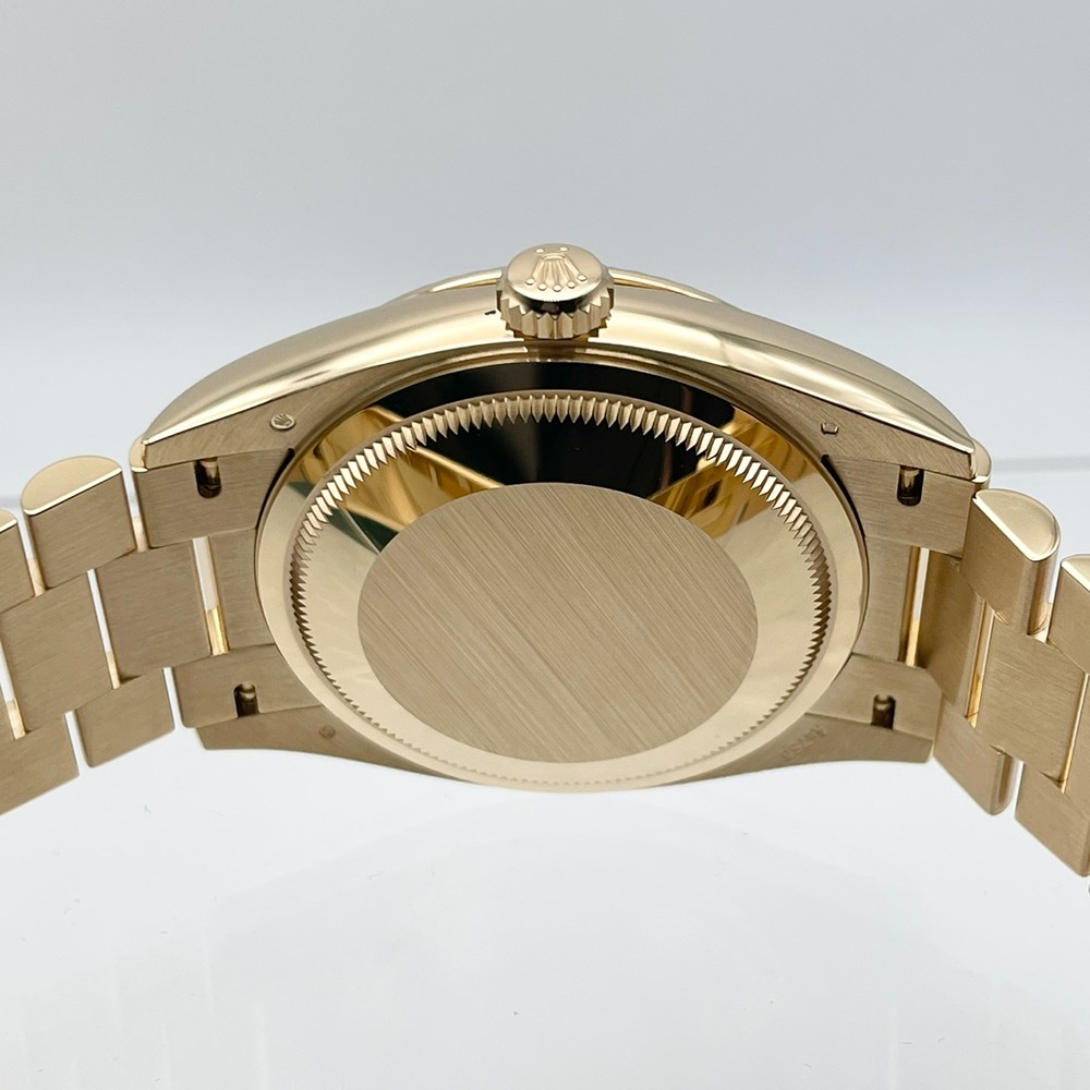 王道ラグジュアリーの象徴、ロレックス デイデイト128238。重厚なイエローゴールドのケースとブレスレットに、鮮やかで品格あるブライトグリーン文字盤が組み合わさった一本です。36mmというエレガントなサイズ感は、ビジネスからフォーマルまで腕元を上品に演出。金無垢ならではの存在感と、デイデイトならではのフルスペル表記の曜日表示が、「特別な一本」を求める方の所有欲をしっかり満たします。未使用コンディションで長くご愛用いただける、資産性とステータス性を兼ね備えたモデルです。