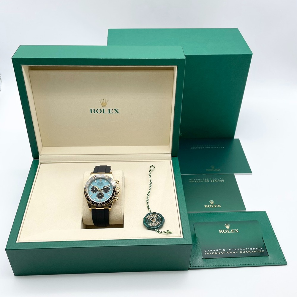 2025年モデルとして新登場したこのデイトナは、ターコイズブルーのラッカー仕上げの文字盤とブラックのサブダイヤルが特徴で、ターコイズブルー文字盤を採用しています 。ケースは18Kイエローゴールド製で、40mmのオイスターモデル。ブラックセラクロム製のタキメーターベゼルとオイスターフレックスブレスレットを組み合わせ、スポーティでありながら高級感を演出します。搭載されているのは、ロレックスの最新ムーブメント「Cal.4131」。精度は-2/+2秒/日を誇り、72時間のパワーリザーブを備えています。ロレックスファンやコレクターにとって、所有する喜びと誇りを感じさせる逸品です。