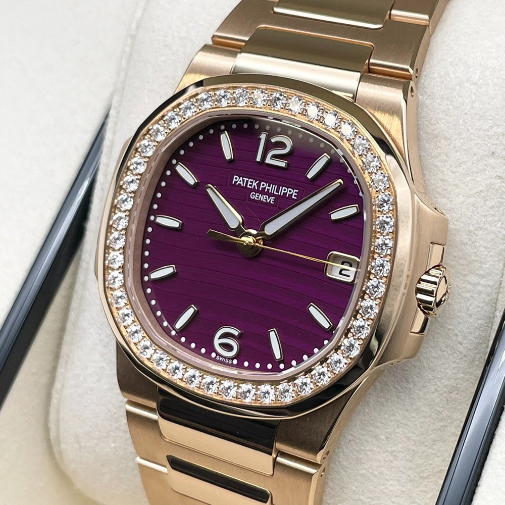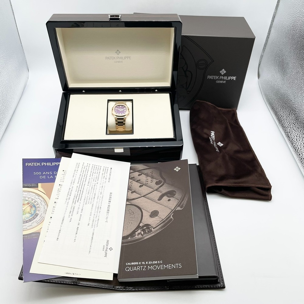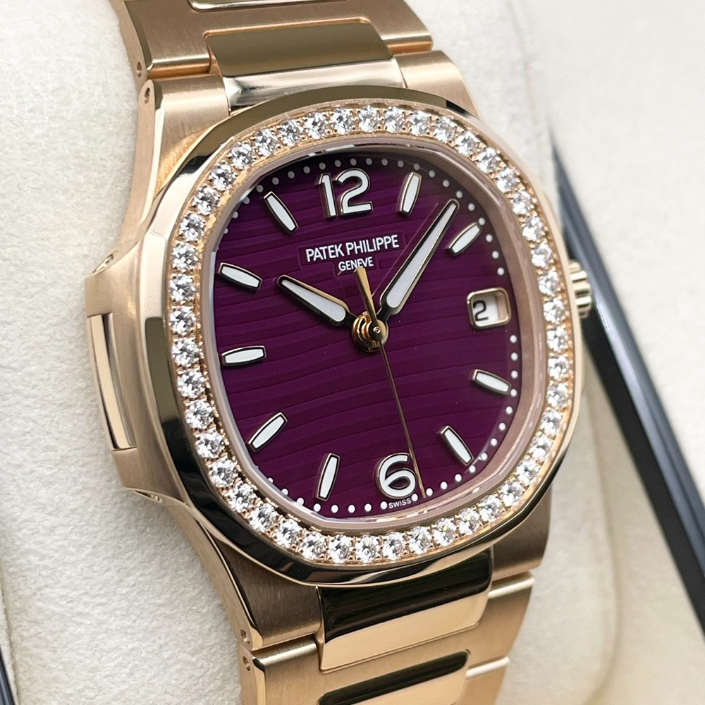 ノーチラス7010/1R-013は、パテック フィリップの中でもひときわ華やかなローズゴールドモデル。やわらかなラック・パープル文字盤が、ケースとブレスレットの温かみのあるゴールドカラーと美しく調和し、上品さと色気を兼ね備えた一本です。スポーティーなノーチラスの造形に、繊細な色合いと煌めきを添えることで、ビジネスシーンからドレスアップまで、幅広いスタイルに対応。資産価値とファッション性を高いレベルで両立する、まさに一生もののラグジュアリーウォッチをお探しの方におすすめです。