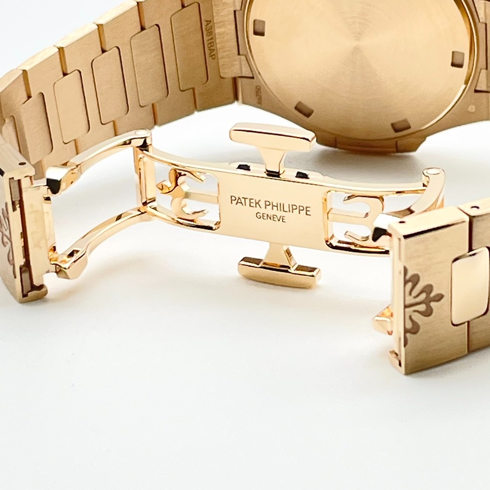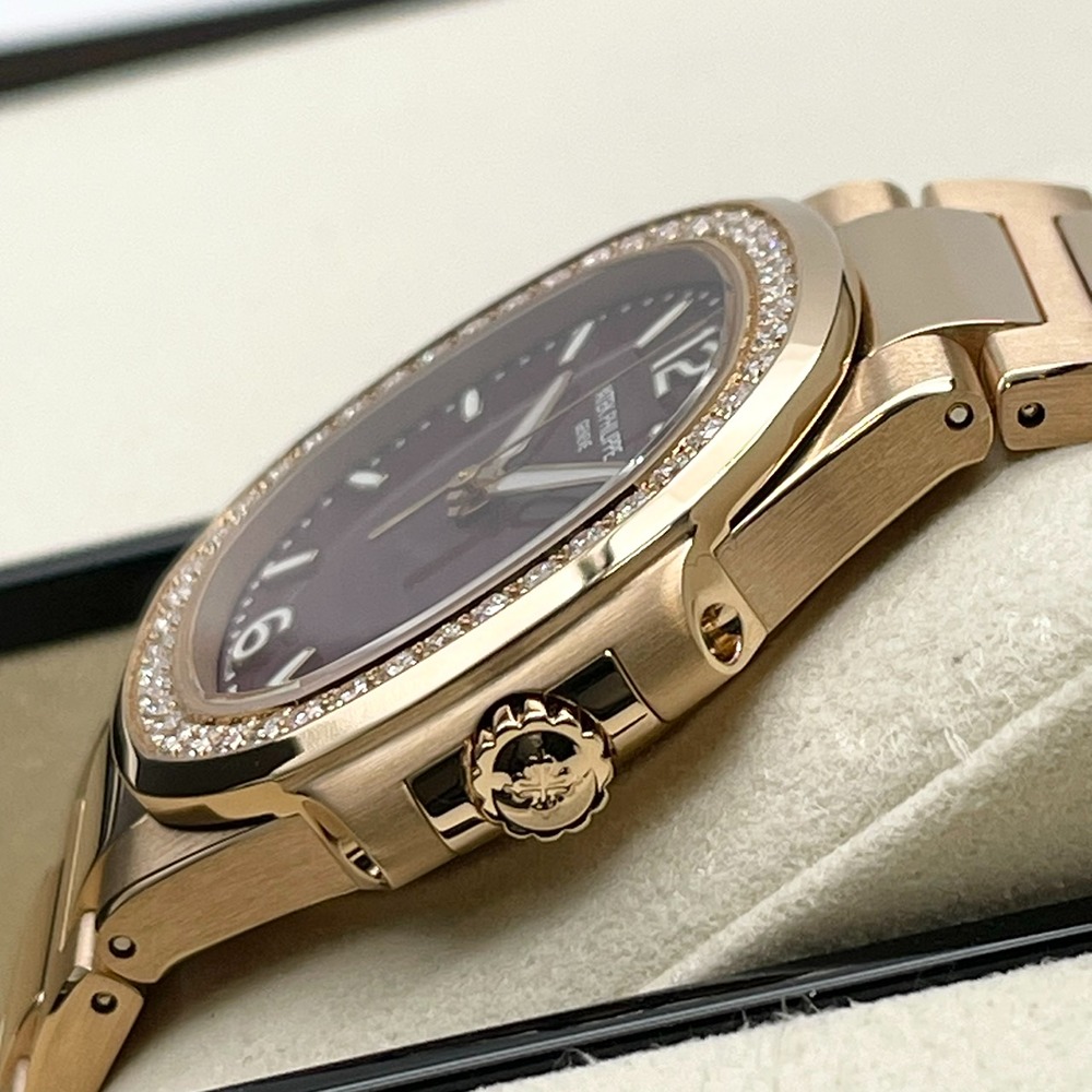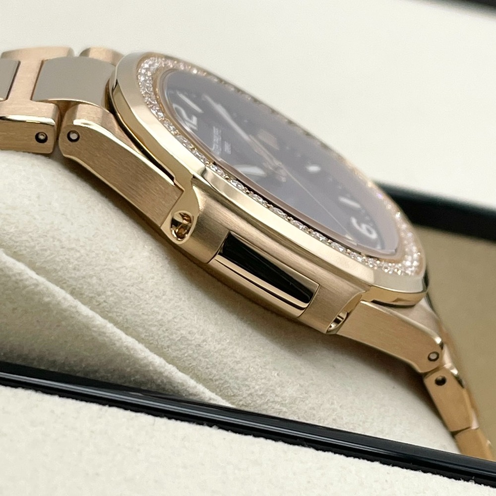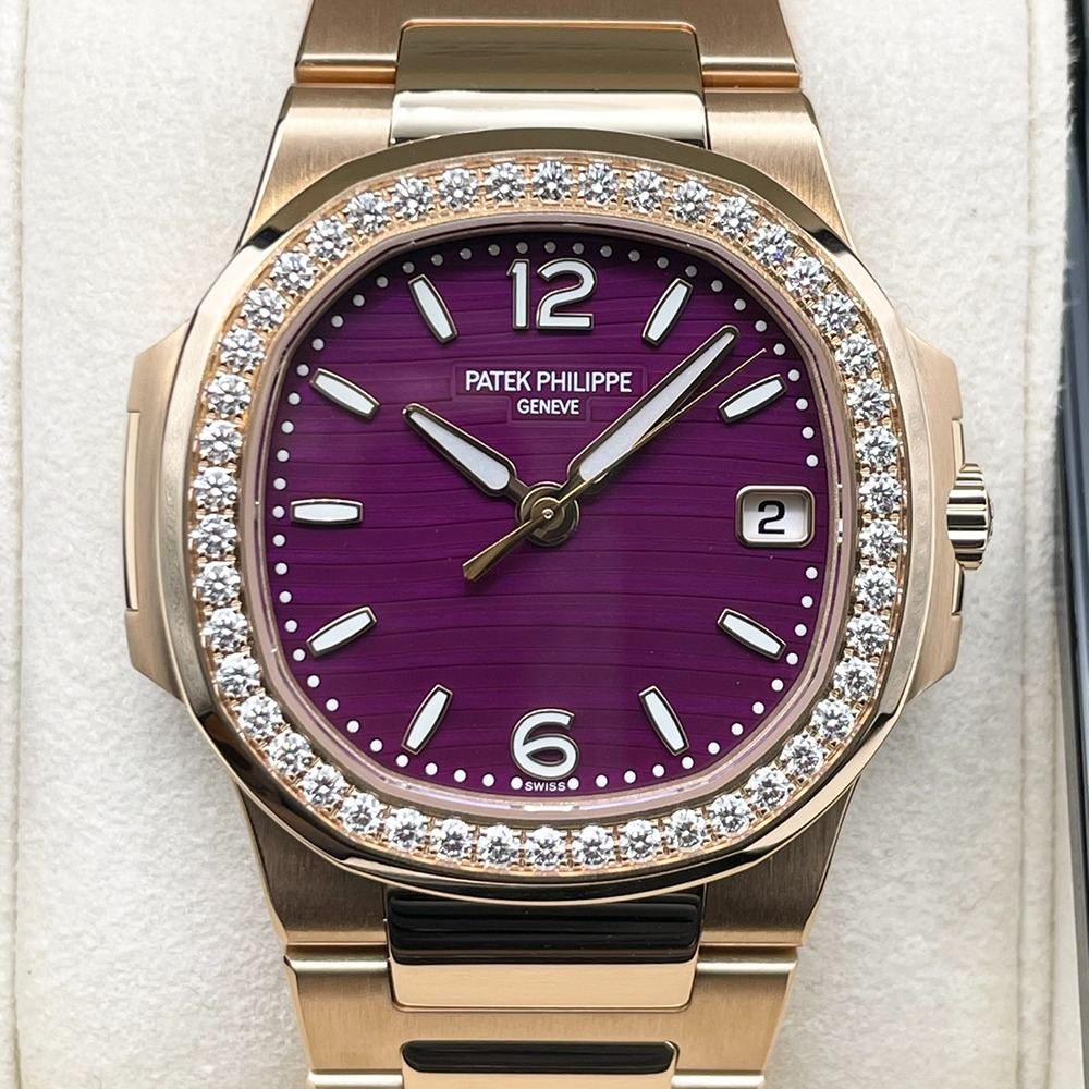 ノーチラス7010/1R-013は、パテック フィリップの中でもひときわ華やかなローズゴールドモデル。やわらかなラック・パープル文字盤が、ケースとブレスレットの温かみのあるゴールドカラーと美しく調和し、上品さと色気を兼ね備えた一本です。スポーティーなノーチラスの造形に、繊細な色合いと煌めきを添えることで、ビジネスシーンからドレスアップまで、幅広いスタイルに対応。資産価値とファッション性を高いレベルで両立する、まさに一生もののラグジュアリーウォッチをお探しの方におすすめです。