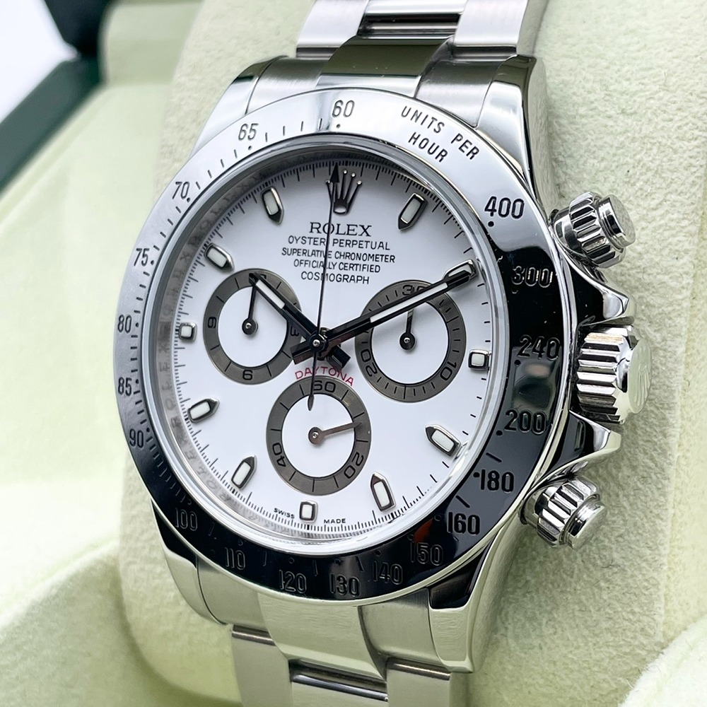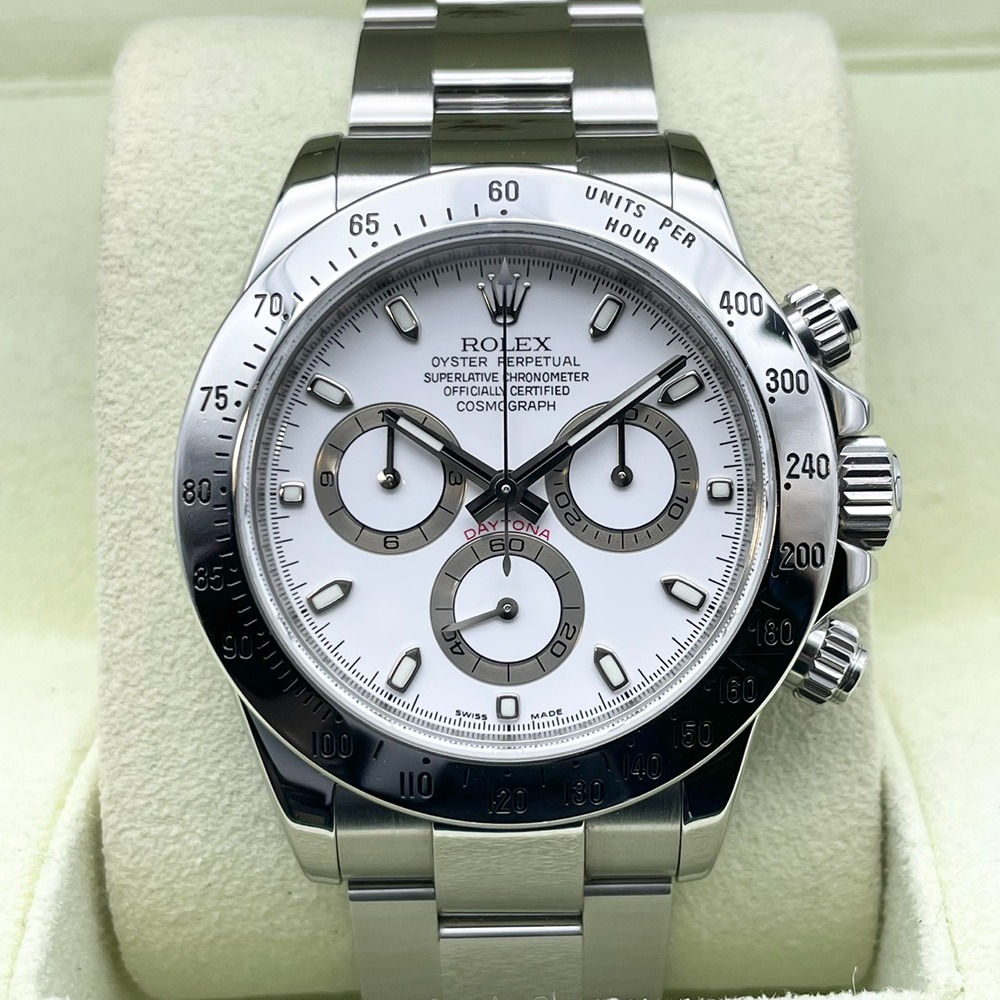 ロレックスのデイトナ 116520は、その洗練されたデザインと卓越した機能性で、多くの時計愛好者を魅了しています。ステンレススチールの堅牢なケースは、耐久性と高級感を兼ね備え、どんなシーンにもマッチします。ホワイトの文字盤が鮮やかに時を刻み、視認性も抜群です。40mmの絶妙なケースサイズは、日常から特別なイベントまで幅広く活躍します。