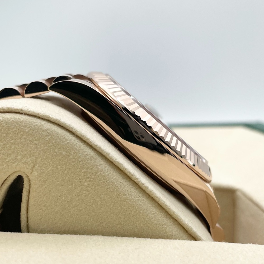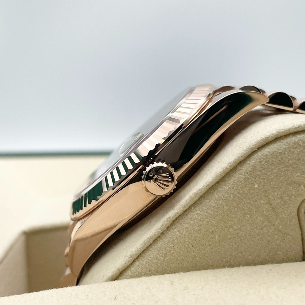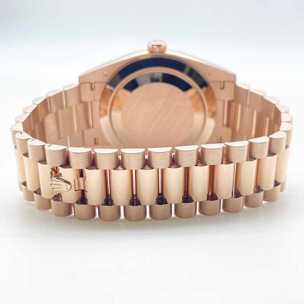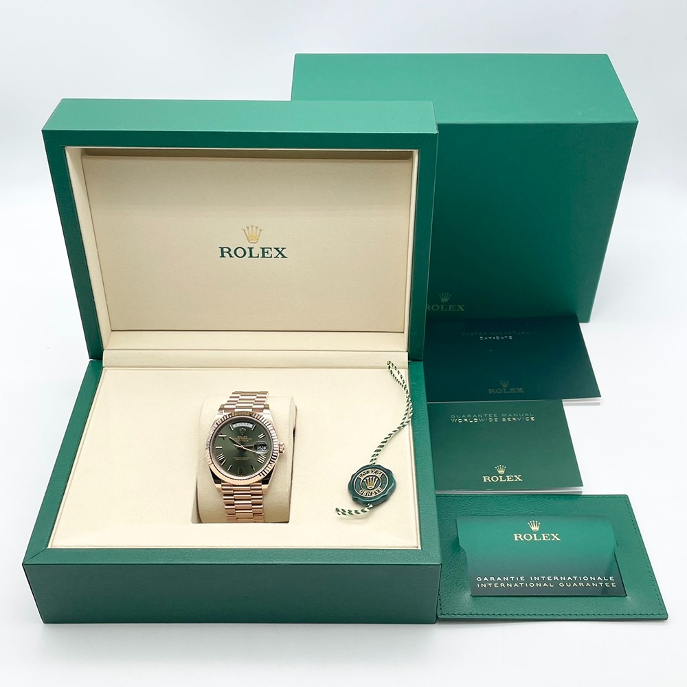ロレックス デイデイト 228235は、エバーローズゴールドの高級感溢れるケースに、目を惹くオリーブグリーンの文字盤が特徴のモデルです。この時計は、ロレックスの誇る卓越した技術と洗練されたデザインが融合しています。40mmのサイズ感は、腕元に上品さと存在感を与え、幅広いシーンで活躍します。長く愛用できる時計を求める方にとって最適な選択です。