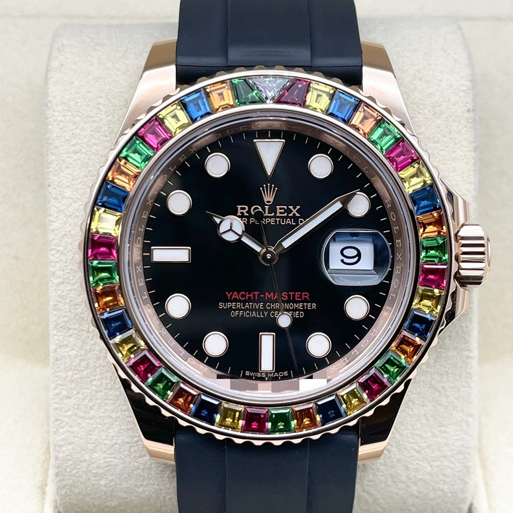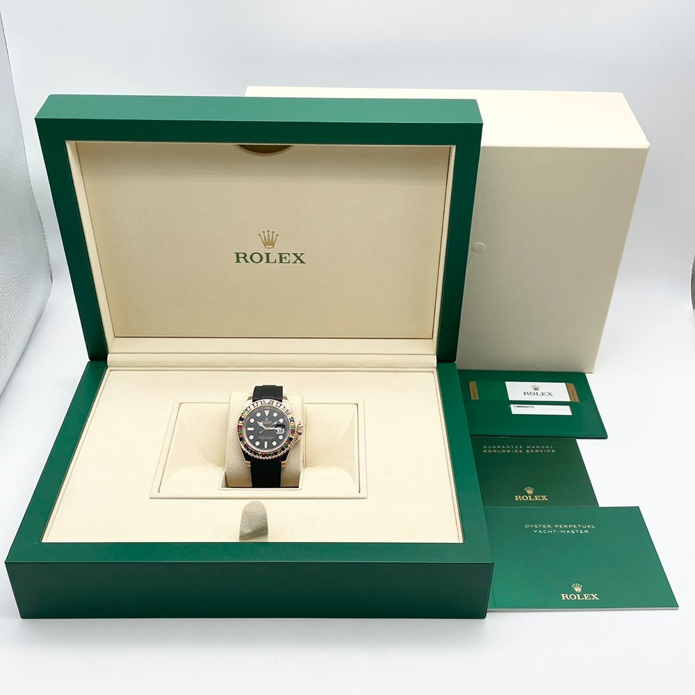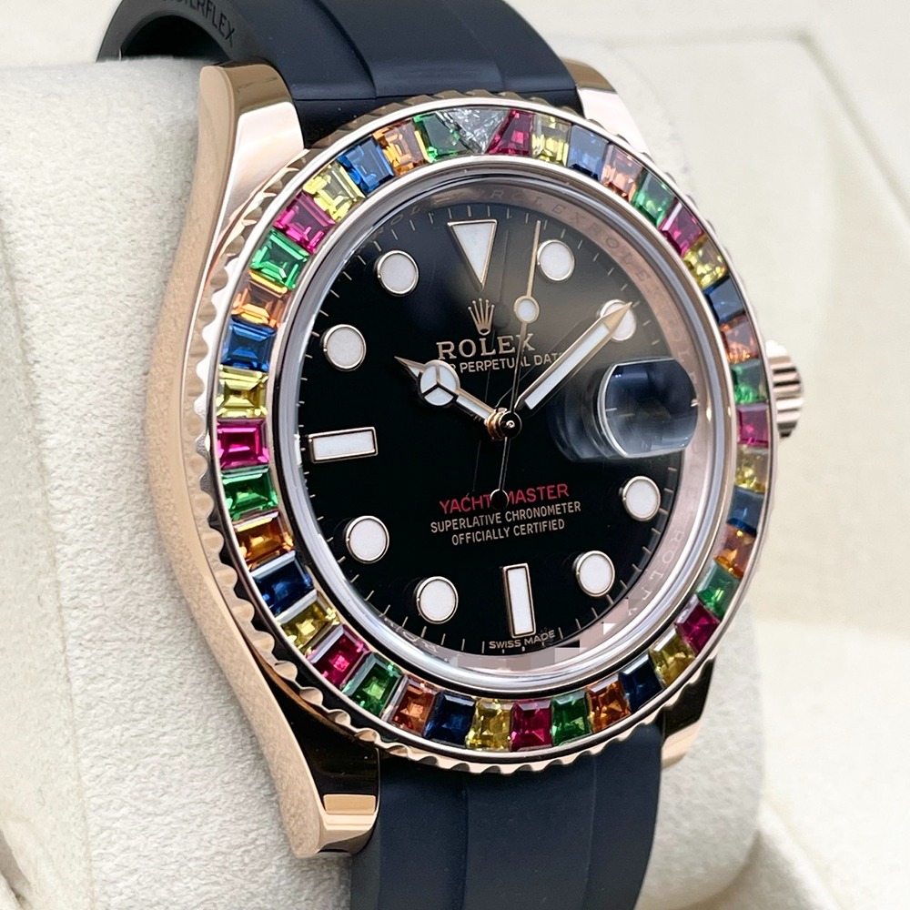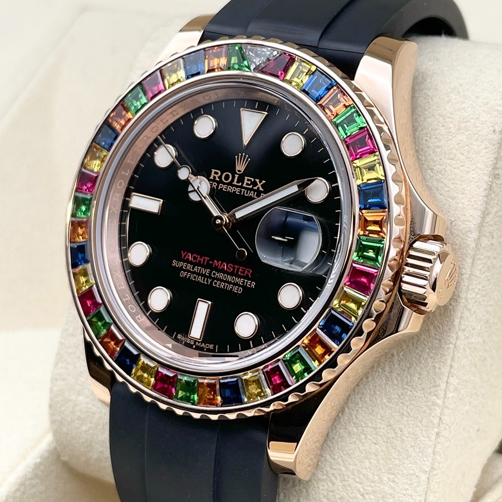 ピンクゴールドケースにサファイアとダイヤモンドを贅沢にセッティングした、ヨットマスター 116695SATS。ベゼルをぐるりと囲むカラーストーンは、海面に反射する光を想起させる、ロレックスならではの洗練されたグラデーションが魅力です。ブラックダイヤルが全体を引き締め、ラグジュアリーでありながらスポーティーさも兼ね備えた一本。希少性の高いモデルで、特別なシーンはもちろん、日常の装いを一段と格上げしてくれます。中古美品のコンディションで、この華やかさをお得に手に入れる絶好の機会です。