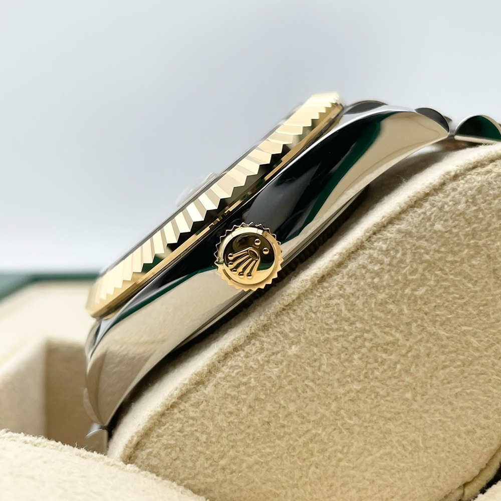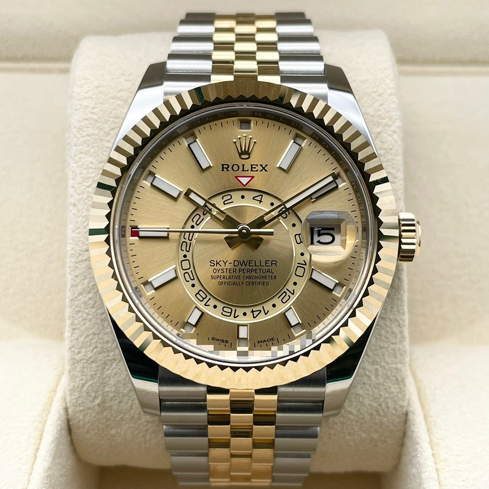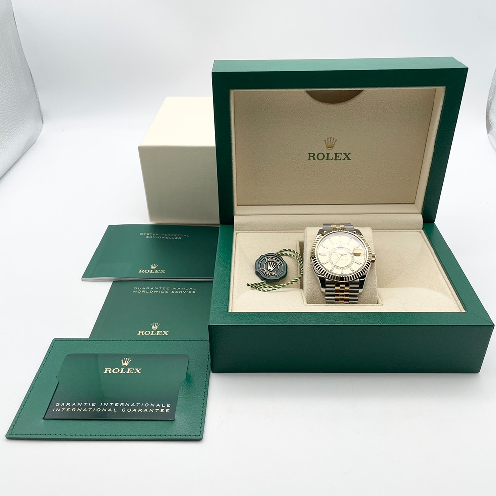 年次カレンダーとデュアルタイムを備えたロレックス随一のコンプリケーション「スカイドゥエラー」。ステンレススチールとイエローゴールドのコンビ素材に、上品なシャンパンカラーのダイヤルが合わさることで、ビジネスからフォーマルまで幅広いシーンで品格を演出します。42mmの存在感あるケースサイズながら、洗練されたデザインにより腕元にしっくりと馴染み、ステータス性と実用性を兼備。未使用品かつ2023年6月の保証書日付で、長く安心してお使いいただける1本です。日常使いはもちろん、資産性の高いモデルをお探しの方にも大変おすすめです。
