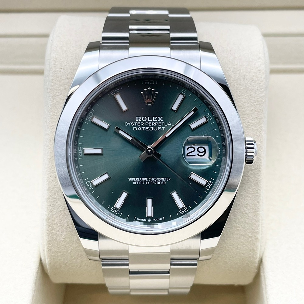 ロレックス デイトジャスト 126300は、卓越した技術力と高度な精密性を誇る時計製品の一つ。ミントグリーンの文字盤は、見る角度や光の条件によって様々な表情を見せ、腕元に爽やかな印象を与えます。ステンレススチール素材で作られた41mmのケースは、磨かれたサテン仕上げが施され、耐久性と洗練さを同時に提供します。この時計は、ビジネスシーンやカジュアルシーンを問わず、あらゆる場面で腕元を彩る逸品です。信頼のロレックスムーブメントは抜群の正確さを約束し、長年にわたってその価値と品格を維持します。