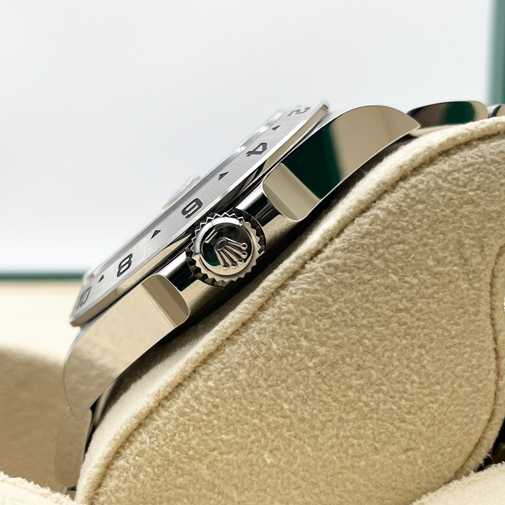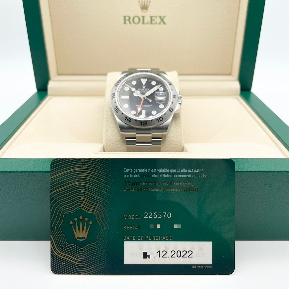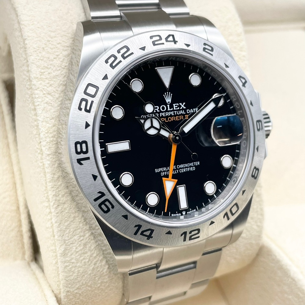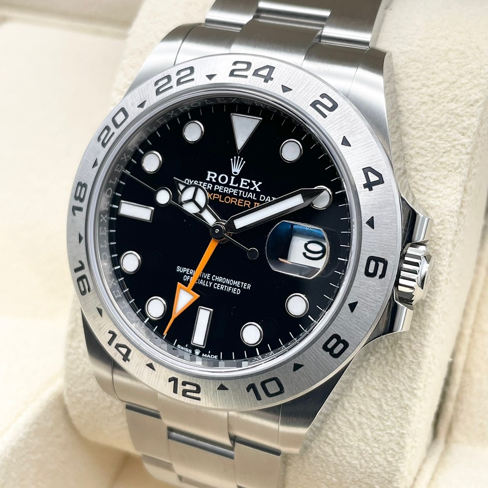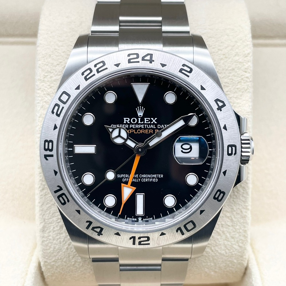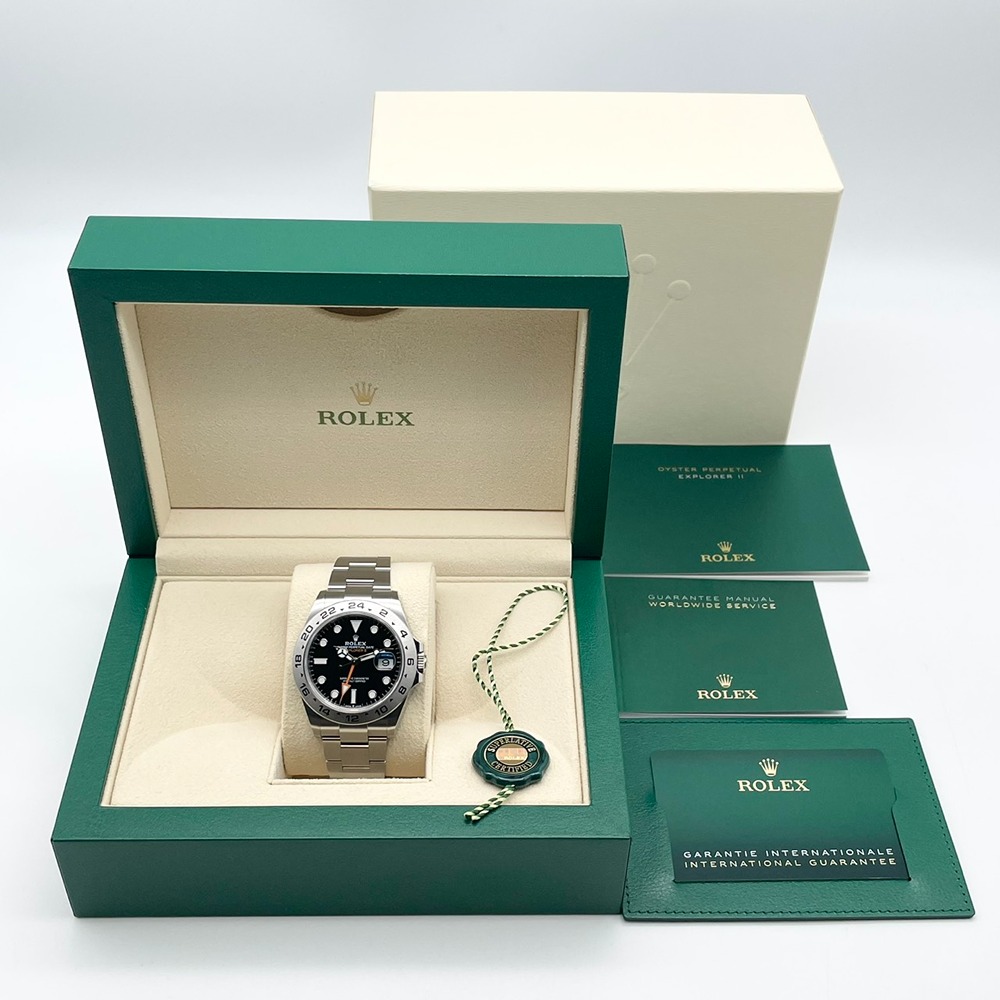 エクスプローラーII 226570は、ロレックスの中でも実用性とタフさで選ばれる名機です。42mmの存在感あるケースに、視認性に優れたブラックダイヤルとオレンジの24時間針が映えるスポーツモデル。ステンレススチールならではの重厚感と耐久性を備えつつ、オンオフ問わず合わせやすい万能デザインです。中古美品のためコンディションも良好で、日常使いからビジネスシーンまで、一本で幅広く活躍してくれる頼れる相棒をお探しの方におすすめです。
