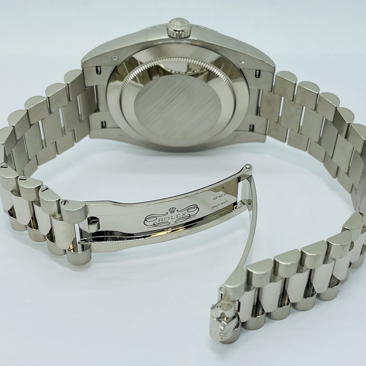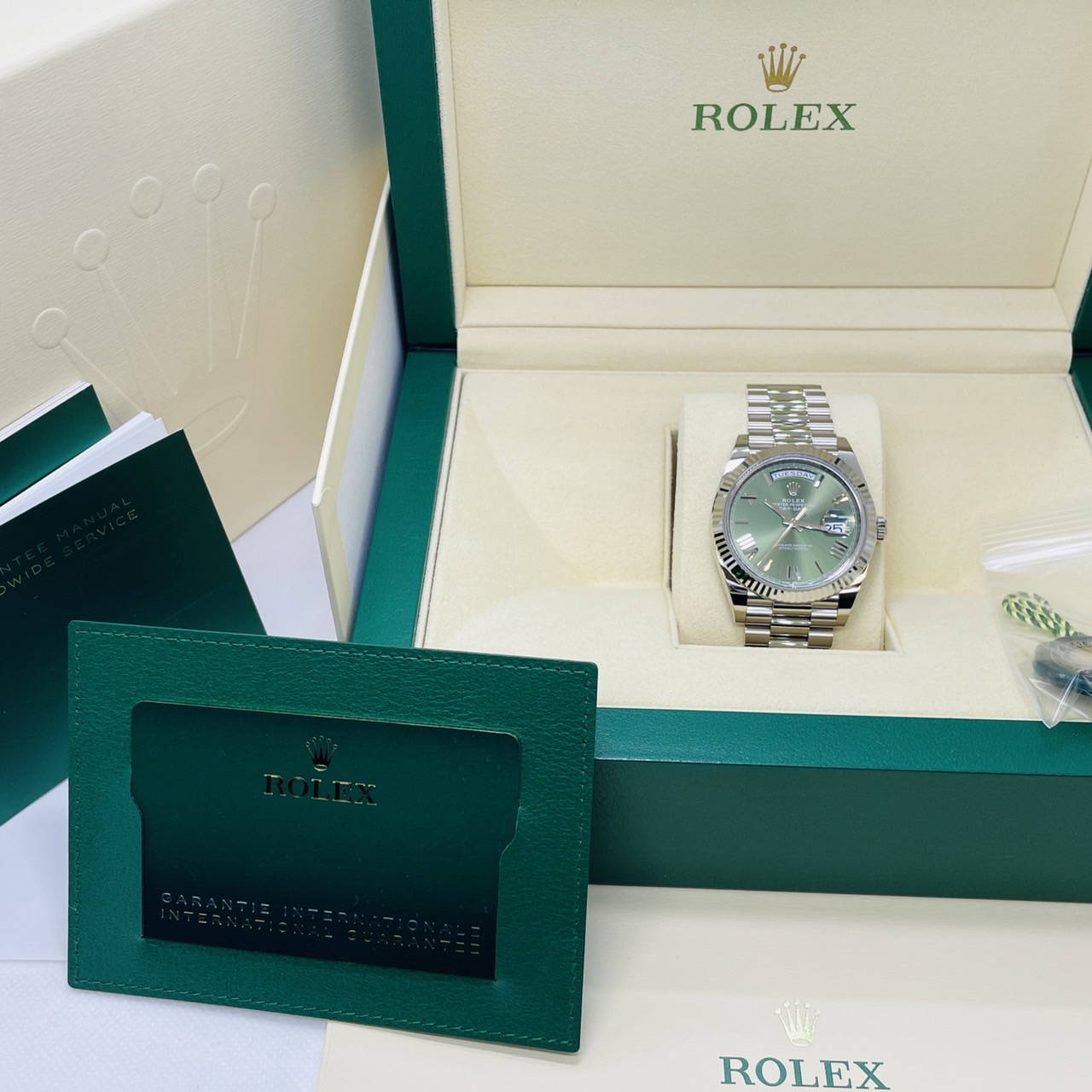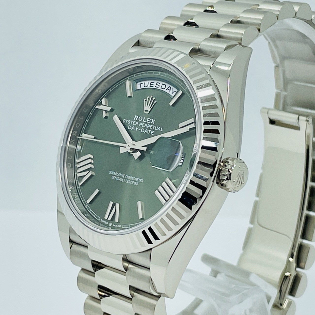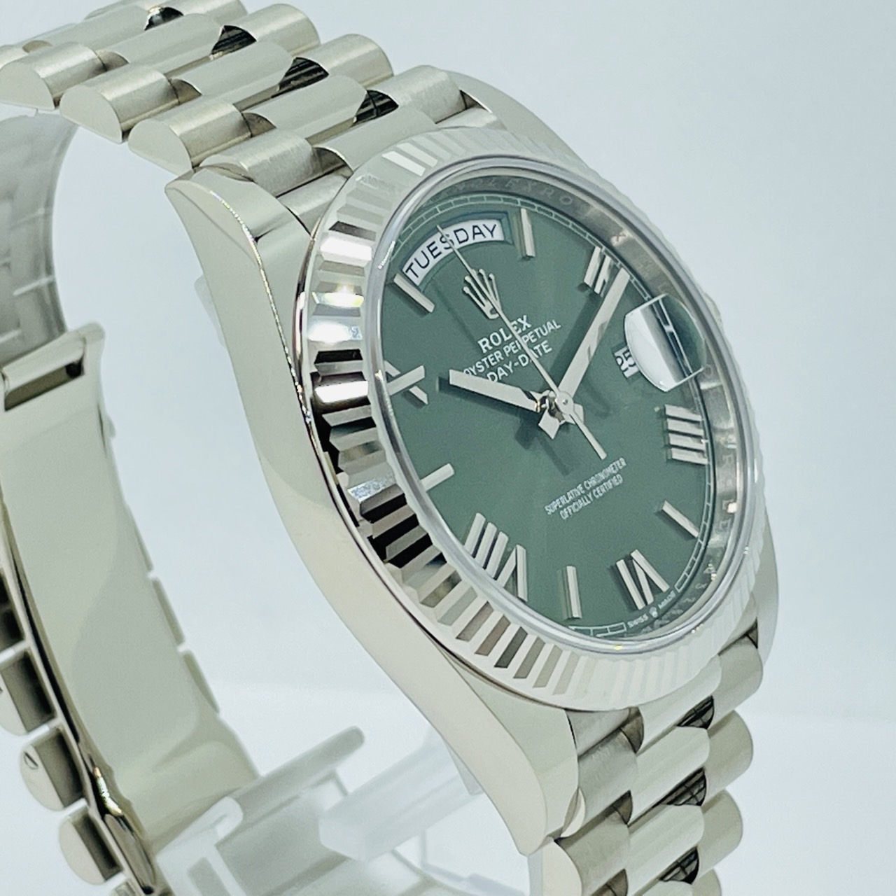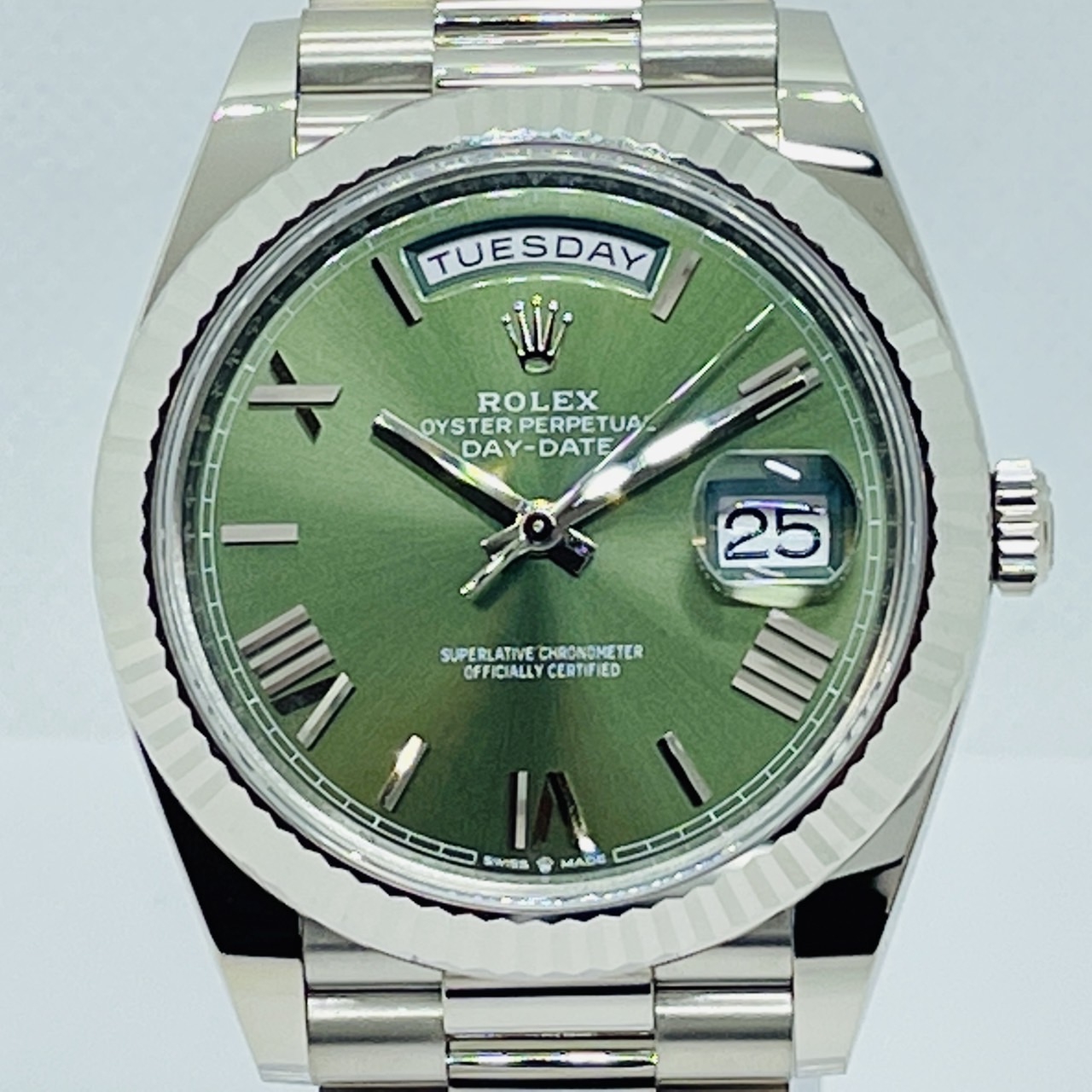デイデイトという宝飾モデルの中でも群を抜く人気の文字盤カラーオリーブグリーンです。